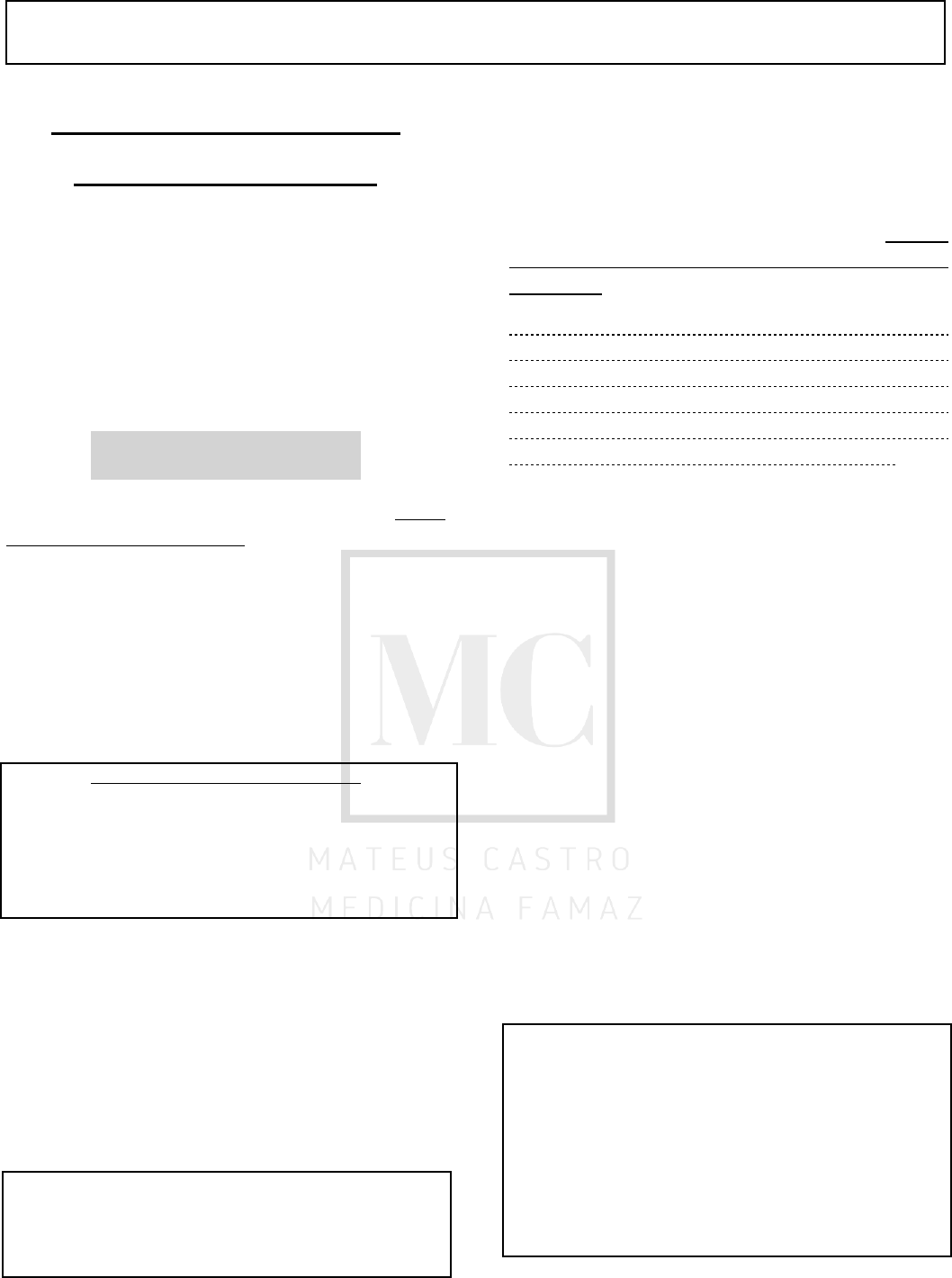 MATEUS CASTRO 7MED FAMAZ MÓDULO 21 ACIDENTE VASCULAR ENCEFÁLICO (AVE) O AVE pode ser isquêmico (80%) dos casos ou hemorrágico (20%). →HAS, em especial a sistólica e fibrilação atrial são os principais fatores de risco para AVE isquêmico. →HAS, trauma, diátese hemorrágica, angiopatia amiloide, drogas ilícitas (cocaína) e malformações vasculares são os principais fatores de risco para AVE hemorrágico. AVE ISQUÊMICO Se manifesta pela instalação súbita de déficit neurológico focal persistente, como consequência de isquemia seguida de infarto no parênquima encefálico (cérebro, diencéfalo, tronco ou cerebelo). →Ocorre devido oclusão aguda de artéria de médio/grande calibre. Na maioria das vezes a oclusão é do tipo embólica (trombo da circulação sistêmica caminha até impactar na artéria) ou trombótica (trombo formado na própria artéria envolvida). Tipos de AVE isquêmico embólico →Cardioembólico: a fonte do trombo é o coração. →Arterioembólico: AVE típico do hipertenso, onde a fonte do trombo geralmente é placa aterosclerótica instável (com trombo) na carótida comum ou bifurcação carotídea ou na artéria vertebral. O AVE trombótico mais comum é o AVE lacunar → infarto inferior a 2cm, causado pela oclusão de pequenas artérias perfurantes cerebrais, que nutrem o tálamo, cápsula interna e gânglios da base, ou dos ramos arteriais que irrigam o tronco cerebral. O AVE trombótico de artérias de médio calibre é rara e é suspeito na síndrome do AVE em evolução, onde o déficit neurológico se desenvolve de forma subaguda. AVE criptogênico: alguns casos de AVE isquêmico possui eco transtorácico sem cardiopatia emboligênica e doppler de carótidas/vertebrais normal não podendo ser classificado como cardio ou arterioembólico. SOS: Quando uma artéria cerebral é ocluída, imediatamente surge isquemia, tendo disfunção neuronal proporcional à baixa do fluxo. Quando a isquemia é prolongada ou grave o infarto inevitavelmente ocorre. No entanto é importante delimitar as áreas com lesões irreversíveis (área de necrose) de lesões reversíveis (área de penumbra – área de baixo fluxo, mas com extração de oxigênio aumentada, tentando compensar a isquemia). Essa delimitação pode ser feita por meio de TC com emissão de prótons. O tamanho da área de penumbra é variável entre os pacientes, na dependência de circulação colateral → o que mantem essa área ainda viva é a circulação colateral, sendo altamente dependente da pressão arterial → por isso é necessário muito cuidado no controle da PA na fase aguda do AVE isquêmico. Após a ocorrência do infarto neuronal, é instalado o edema citotóxico (aumento do volume dos neurônios) + edema vasogênico (acúmulo de líquido no interstício). →O pico do edema é entre 3-4 dias. →Após 10 dias, resolvido o edema a área de transição entre área infartada e área normal é nítida. →Entre 10 dias – 3 semanas a fagocitose local provoca necrose de liquefação, transformando o infarto em área amolecida e depois retraída. • Fatores de risco →Hipertensão arterial (especialmente sistólica). →Histórico familiar de doença cerebrovascular. →Diabetes. →Tabagismo. →Hipercolesterolemia. →Idade > 60 anos. →Fibrilação atrial crônica (especialmente AVE isquêmico cardioembólico). Fatores de risco menos comuns: síndrome do anticorpo antifosfolípidio, anticoncepcionais + tabagismo ± fator V de Leiden, overdose de cocaína, meningite bacteriana ou tuberculosa, neurossífilis, endocardite infecciosa, LES, vasculites necrosantes (poliarterite nodosa), vasculite primária do SNC, fibrodisplasia, síndromes hematológicas (policitemia vera, anemia falciforme, hemoglobinúria paroxística noturna). MATEUS CASTRO 7MED FAMAZ MÓDULO 21 • Anatomia vascular encefálica O encéfalo é irrigado por 2 sistemas arteriais: →Carotídeo (anterior) – iniciado na carótida interna que penetra no crânio e no sifão carotídeo origina a artéria oftálmica e depois se divide em artéria cerebral média, cerebral anterior e coroide anterior. Cerebral média: principal artéria do cérebro e a mais acometida no AVE isquêmico. Emite no seguimento proximal os ramos lenticuloestriados (irriga tálamo, gânglios da base e cápsula interna) sendo esses os ramos acometidos no AVE lacular. Ela se bifurca em ramos superiores e inferiores. O ramo superior irriga córtex e substância subcortical de quase todo o lobo frontal (córtex motor piramidal, pré-motor, área do olhar conjugado, área de Broca), todo o lobo parietal (área somatossensorial primária e associativa, área associativa geral dos giros supramarginal e angular) e parte do lobo temporal (área de Wernicke). Cerebral anterior: irriga a porção anterior, medial e orbitária do lobo frontal. Emite ramos perfurantes para porção anterior da cápsula interna, corpo amigdaloide, hipotálamo anterior e parte da cabeça do núcleo caudado. Coroide anterior: irriga porção posterior da cápsula interna. →Vertebrobasilar (posterior) – iniciado na artéria vertebral que se introduz nos forames laterais das vertebras cervicais, até penetrar no forame magno para vascularizar o bulbo. Origina a Artéria Cerebelar Inferoposterior (PICA) que nutre porção dorsolateral do bulbo (da síndrome de Wallemberg). Na junção pontobulbar se une à vertebral do lado oposto formando a artéria basilar que emite ramos que irão irrigar a ponte e posteriormente se bifurca originando a artéria cerebral posterior, uma de cada lado. Origina artéria cerebelar anterior e artéria cerebelar posterior (principal artéria do cerebelo). • Quadro clínico (síndromes isquêmicas) As manifestações clínicas expressam o território neurológico acometido. As síndromes serão divididas pelo território de irrigação → Território carotídeo (cerebral média e cerebral anterior) e Território vertebrobasilar