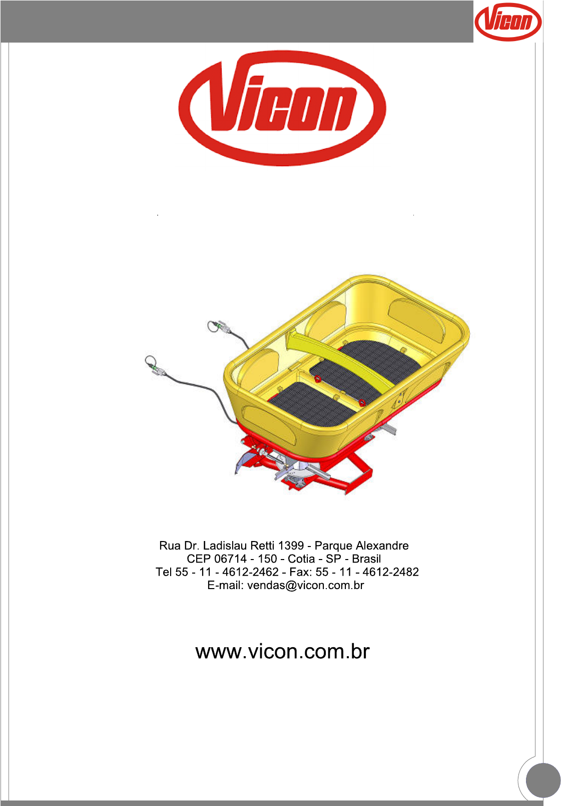 VIBRAFLOW II 1500 REV 14 - 09/04/2019 Manual de Instruções e Catálogo de Peças Vicon Máquinas Agrícolas Ltda MANUAL DO USUÁRIO Caro cliente: Este manual foi preparado para que você possa conhecer detalhadamente seu equipamento podendo usufruir de maneira proveitosa e correta Recomendamos a leitura deste manual antes da primeira utilização e sempre que tiver dúvidas sobre seu equipamento. Inserimos informações técnicas, operacionais e de segurança para que seu equipamento esteja sempre em pleno funcionamento. Qualquer dúvida ou sugestão, estamos a total disposição em nossos contatos abaixo: Vicon Máquinas Agrícolas Ltda. Rua Dr. Ladislau Retti, 1399 – Parque Alexandre CEP 06714-150 – Cotia-SP-Brasil Tel. (11) 4617-8040 – Fax. (11) 4617-8041 e-mail: vicon@vicon.com.br Vicon Máquinas Agrícolas Ltda TERMO DE GARANTIA 1) Em caso de garantia, cobrimos exclusivamente defeitos de material ou fabricação, sendo que fretes para envio das peças, deslocamento (km rodado) dos técnicos e outras despesas não são abrangidas em garantia. 2) O prazo de garantia desse produto é de 3 meses de garantia legal prevista pela legislação brasileira e mais 3 meses de garantia contratual concedida pela Vicon Máquinas Agrícolas, totalizando 6 meses. O prazo de garantia é contado a partir da data de emissão da nota fiscal de venda do produto, tendo por destinatário o primeiro proprietário. 3) A garantia torna-se nula quando: 3.1) For constatado que o defeito ou dano ao equipamento resultar de uso inadequado, por falta de experiência do operador ou por não seguir as instruções de uso escrita pelo fabricante. 3.2) Fazer reparos ou modificações em oficinas que não pertencem a rede de revendedores Vicon. 3.3) Peças ou componentes que apresentarem defeitos oriundos da aplicação indevida de componentes não genuínos ao produto. 3.4) For constatado mal uso. 4) Defeitos de fabricação e/ou material, objeto desta garantia, não constituirão, em hipótese alguma, motivo para rescisão de contrato de compra e venda ou troca do equipamento. CONTROLE DE GARANTIA DA REVENDA Nome do cliente: ____________________________________________________________ Endereço: _________________________________________________________________ Telefone: ( ) __________________Cidade:___________________________Estado:______ Modelo do equipamento: _____________________Nº Série: _______________ Ano: _____ Nota Fiscal: ______________________________Data: _________/_______/____________ Revenda: __________________________________________________________________ __________________________ ________________________ ____________________ Assinatura Responsável da Entrega Assinatura e carimbo Revenda Assinatura do cliente Nota: Os equipamentos estão sujeitos a alterações sem prévio aviso, podendo haver modificações nos projetos a fim de aperfeiçoa-los, sem que isso importe em qualquer obrigação de aplicá-los em produtos anteriormente fabricados. 02 INDICE 1 - INSTRUÇÕES DE SEGURANÇA................................................................03 2 - DADOS TÉCNICOS.....................................................................................04 3 - OPERAÇÃO.................................................................................................05 4 - MONTAGEM................................................................................................06 5- REGULAGEM.......................................................................................07 e 08 6 - DISTRIBUIÇÃO............................................................................................09 7 - MANUTENÇÕ..............................................................................................10 8 - HIDRÁULICO...............................................................................................11 CATÁLOGO DE PEÇAS CHASSIS E COMPLEMENTOS VIBRAFLOW II.............................................12 CONJUNTO TRANSMISSÃO VIBRAFLOW II..........................................13 - 14 CONJUNTO REGISTRO DIREITO E ESQUERDO VIBRAFGLOW II.............15 ACIONAMENTO HIDRÁULICO E ACIONAMENTO POR CABO....................16 CAIXA BPN 161- 1018.....................................................................................17 AGITADOR DD216610 (ANTIGO)....................................................................18 03 1 - INSTRUÇÕES DE SEGURANÇA 1. INSTRUÇÕES DE SEGURANÇA Antes do manuseio do equipamento é necessário observar se o operador responsável está instruído do modo correto de operação da máquina. Para tanto é aconselhável a leitura atenta do manual de instruções, garantindo assim, que a máquina será operada da melhor maneira possível, evitando acidentes e danos prematuros no equipamento. a) Não utilizar o equipamento para fins pela qual ele não foi projetado, evitando risco de acidentes. b) É aconselhada após o uso a lavagem da máquina, a fim de garantir uma maior durabilidade. c) Nunca abandonar a adubadeira em funcionamento. Se precisar sair, baixe a máquina ao solo, desligue o motor, acione o freio de estacionamento e tire a chave do contato. d) Adapte sempre a velocidade do trator com as condições locais. Evite manobras bruscas. e) Caso o trator apresente dificuldade em realizar manobras, utilizar contra-pesos adequados. f) Não transporte pessoas sobre o equipamento, nem no trator, se neste não haver espaço para esse fim. g) Quando trabalhar embaixo da adubadeira suspensa pelo levante hidráulico, não esquecer de colocar suportes seguros. h) Observar a presença de crianças, animais ou outras pessoas, advertindo-as para manter distância do equipamento em funcionamento. i) Sempre efetuar regulagem ou lubrificação com a máquina desligada da tomada de força do trator. j) Na presença de qualquer dano mecânico, desligue o equipamento e providencie o conserto antes de ligar a máquina novamente. k) Evitar o uso de roupas muito soltas