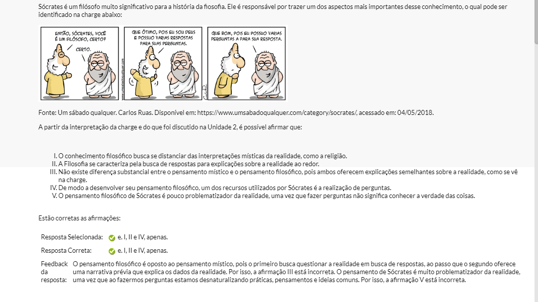 A partir da interpretacao da charge e do que foi discutido na Unidade 2, e possivel afirmar que: Estao corretas as afirmacoes: I. O conhecimento filosofico busca se distanciar das interpretacoes misticas da realidade, como a religiao. II. A Filosofia se caracteriza pela busca de respostas para explicacoes sobre a realidade ao redor. III. Nao existe diferenca substancial entre o pensamento mistico e pensamento filosofico, pois ambos oferecem explicacoes semelhantes sobre a realidade como se ve na charge. IV. De modo a desenvolver seu pensamento filosofico, um dos recursos utilizados por Socrates e a realizacao de perguntas. V. O pensamento filosofico de Socrates e pouco problematizador da realidade, uma vez que fazer perguntas nao significa conhecer a verdade das coisas. e. e IV, apenas. e. e apenas.