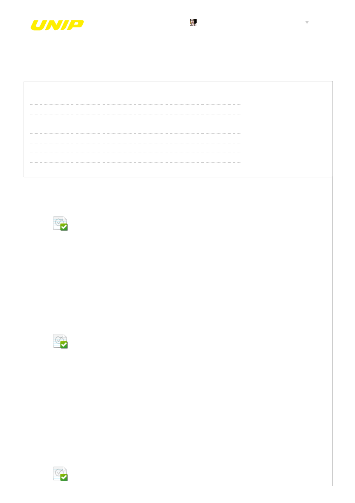 06/11/2019 Revisar envio do teste: AVALIAÇÃO - II – 6596-15_SEI_RC_... https://ava.ead.unip.br/webapps/assessment/review/review.jsp?attempt_id=_26757566_1&course_id=_50986_1&content_id=_783850_1&return_… 1/5 Revisar envio do teste: AVALIAÇÃO - II ESTUDOS DISCIPLINARES IV 6596-15_SEI_RC_0119_R_20192 CONTEÚDO Usuário crislaine.medeiros @unipinterativa.edu.br Curso ESTUDOS DISCIPLINARES IV Teste AVALIAÇÃO - II Iniciado 06/11/19 19:51 Enviado 06/11/19 20:13 Status Completada Resultado da tentativa 9 em 10 pontos Tempo decorrido 21 minutos Resultados exibidos Respostas enviadas, Perguntas respondidas incorretamente Pergunta 1 Resposta Selecionada: b. Podem-se resumir as formulações restritas às abordagens da lógica formal. Indique a formulação resumida que não está de acordo com a lógica formal: A lógica não se preocupa com a relação (entre duas ou mais a�rmações) e seu objetivo é a validade dessa relação. Pergunta 2 Resposta Selecionada: c. (ITA – 2012) Em sentido amplo, a relação de causa e efeito nem sempre é estabelecida por conectores (porque, visto que, já que, pois, etc.). Outros recursos também são usados para atribuir relação de causa e efeito entre dois ou mais segmentos. Isso ocorre nas opções abaixo, exceto em: A instalação de linhas de monotrilho ou de corredores de ônibus precisa vitaminar uma área. Pergunta 3 Analise as seguintes considerações sobre as exigências para o bom funcionamento do método de raciocínio dedutivo: UNIP EAD BIBLIOTECAS MURAL DO ALUNO TUTORIAISCONTEÚDOS ACADÊMICOS 1 em 1 pontos 1 em 1 pontos 1 em 1 pontos crislaine.medeiros @unipinterativa.ed... 1 06/11/2019 Revisar envio do teste: AVALIAÇÃO - II – 6596-15_SEI_RC_... https://ava.ead.unip.br/webapps/assessment/review/review.jsp?attempt_id=_26757566_1&course_id=_50986_1&content_id=_783850_1&return_… 2/5 Resposta Selecionada: e. I. Exigência 1: temos a certeza da veracidade de certas declarações, chamadas de premissas ou hipóteses (axiomas ou postulados). II. Exigência 2: concordamos no que diz respeito a como e quando uma declaração segue logicamente outra. III. Exigência 3: para aplicar o raciocínio dedutivo, temos de dominar bem a linguagem comum (neste caso, o português) e escolher os termos primitivos. São adequadas as proposições: Todas as considerações são adequadas. Pergunta 4 Resposta Selecionada: c. Leia a charge a seguir e as asserções baseadas nela. Folha de S.Paulo, São Paulo, 15 ago. 2010, p. 2. No país, existem iniciativas de políticas de bem-estar social PORQUE os indivíduos podem se acomodar às benesses instituídas pelo poder público. Indique a alternativa correta: A primeira asserção é verdadeira e a segunda é verdadeira, mas não é justi�cativa da primeira. Pergunta 5 1 em 1 pontos 1 em 1 pontos 06/11/2019 Revisar envio do teste: AVALIAÇÃO - II – 6596-15_SEI_RC_... https://ava.ead.unip.br/webapps/assessment/review/review.jsp?attempt_id=_26757566_1&course_id=_50986_1&content_id=_783850_1&return_… 3/5 Resposta Selecionada: b. Os trechos abaixo são retirados de pesquisas de diversas áreas. Identi�que aquela que seguiu o método indutivo: A intenção do presente estudo é traçar o per�l dos membros da Cooperativa de Artesanato do Sudoeste da Bahia Criar e Recriar. Pergunta 6 Resposta Selecionada: a. A indução realiza-se em três etapas ou fases, que são: I. Observação dos fenômenos com a �nalidade de descobrir as causas de sua manifestação. II. Descoberta da relação entre eles por intermédio da comparação. III. Generalização da relação encontrada entre os fenômenos e fatos semelhantes, muitos dos quais ainda não observados. Assinale a alternativa correta: Há coerência na sequência apresentada. Pergunta 7 Resposta Selecionada: a. Leia alguns exemplos de argumentos: Argumento 1. Não podemos permitir o aborto, porque é o assassínio de um inocente. Argumento 2. Dado que os artistas podem fazer o que muito bem entenderem, é impossível de�nir a arte. Argumento 3. Considerando que sem Deus tudo é permitido, é necessária a existência de Deus para fundamentar a moral e dar sentido à vida. Argumento 4. Se Sócrates era um deus, era imortal. Mas dado que Sócrates não era imortal, não era um deus. Leia as a�rmativas e depois indique a alternativa correta: I. No caso do argumento 1, a conclusão é «Não podemos permitir o aborto» e a premissa é «O aborto é o assassínio de um inocente». II. No caso do argumento 2, a conclusão é «É impossível de�nir a arte» e a premissa é «Os artistas podem fazer o que muito bem entenderem». III. O argumento 3 é mais complexo: a conclusão é «É necessária a existência de Deus para fundamentar a moral e dar sentido à vida» e a premissa é «Sem Deus tudo é permitido». IV. O argumento 4 pode ser canonicamente reformulado como se segue: Se Sócrates era um deus, era imortal. Sócrates não era imortal. Logo, «Sócrates não era um deus». Todos os argumentos e as conclusões são verdadeiros. 1 em 1 pontos 1 em 1 pontos 06/11/2019 Revisar envio do teste: AVALIAÇÃO - II – 6596-15_SEI_RC_... https://ava.ead.unip.br/webapps/assessment/review/review.jsp?attempt_id=_26757566_1&course_id=_50986_1&content_id=_783850_1&return_… 4/5 Pergunta 8 Resposta Selecionada: d. Examine o seguinte anúncio publicitário: Revista Valor (Especial). Jul, 2011. Adaptado. Considere as seguintes a�rmativas sobre a lógica do texto publicitário e depois indique a alternativa correta. I. O texto dá a impressão visual que o emaranhado de linhas da folha da árvore se assemelha a um mapa, demonstrando rotas, cruzamentos e passagens. II. A relação de sentido existente entre a imagem de uma folha de árvore com o “mapeamento lógico” está presente justamente nessa semelhança visual ao mapa. III. O “caminho” pelo visual, que as linhas entrecruzadas fazem, lembra-nos de caminhos presentes em uma representação car