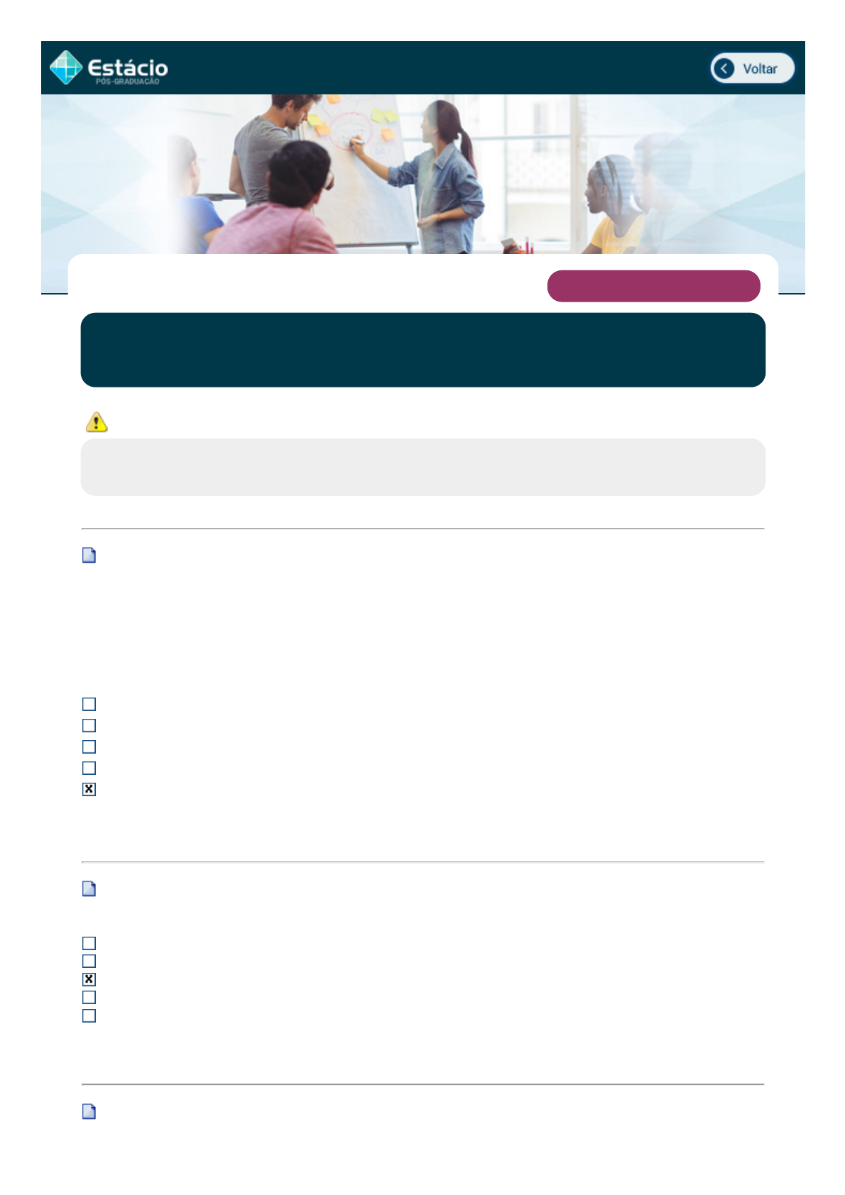 08/11/2019 EPS pos.estacio.webaula.com.br/salaframe.asp?curso=1098&turma=74193&CodProgramaTurma=0&CodModuloDeCursos=0&AcessoSomenteLeitur… 1/4 NAIARA DORNELLES REZENDE MELLO 201908477016 EAD SÃO PAULO - OSASCO - SP RETORNAR À AVALIAÇÃO Disciplina: NPG1499 - GESTÃO DE PESSOAS E COMPETÊNCIAS Período: 2019.3 EAD (POS) / AV Aluno: NAIARA DORNELLES REZENDE MELLO Matrícula: 201908477016 Data: 08/11/2019 08:30:15 Turma: 9003 ATENÇÃO 1. Veja abaixo, todas as suas respostas gravadas no nosso banco de dados. 2. Caso você queira voltar à prova clique no botão "Retornar à Avaliação". 1a Questão (Ref.: 201911746442) Avalie as afirmativas a seguir e assinale a opção correta: I - O mentoring possui funções socioemocionais que aprimoram no indivíduo o seu senso de competência, identidade e eficiência em um papel profissional. II - O mentor serve como objeto de respeito, imitação e admiração para o mentorado, que vê naquele uma fonte de conhecimento, valores e comportamentos a serem seguidos. Apenas a II está correta I e II estão incorretas e, por isso, a II justifica a I I e II estão incorretas, mas a II não justifica a I Apenas a I está correta I e II estão corretas 2a Questão (Ref.: 201909286163) Sobre mentoring e Coaching assinale a alternativa correta Cabe ao mentor estimular o mentorado com perguntas poderosas O coach aborda situações mais amplas e age como um exemplo O mentorado possui a responsabilidade pelo seu próprio aprendizado A atividade de mentoring faz parte do processo de coaching O mentoring é focado em necessidades de curto prazo 3a Questão (Ref.: 201909324667) Uma etapa fundamental da avaliação de desempenho é o momento da entrevista de feedback. Durante esta atividade, o avaliado deve ouvir atentamente. Assinale o comportamento que está relacionado ao feedback 08/11/2019 EPS pos.estacio.webaula.com.br/salaframe.asp?curso=1098&turma=74193&CodProgramaTurma=0&CodModuloDeCursos=0&AcessoSomenteLeitur… 2/4 construtivo: Demonstrar reconhecimento nos comportamentos positivos. Reforçar os pontos fortes e alimentar a auto-estima Concentrar os apontamentos nos erros e comportamentos inadequados Nenhuma das alternativas atende ao enunciado proposto. Encorajar uma pessoa a melhorar a partir de informação especifica. 4a Questão (Ref.: 201909286129) Assinale a alternativa que NÂO representa uma vantagem da excelência em um processo seletivo no modelo de competências: Maior período de adaptação do candidato Menor investimento em programas de integração A redução dos investimentos em contratação A diminuição do turnover A diminuição do absenteísmo 5a Questão (Ref.: 201909286046) A identificação das competências organizacionais é uma pré-condição para a implantação do modelo de gestão por competências, por que: Permite direcionar as estratégias para um foco específico Facilita na utilização do marketing institucional Melhora o clima organizacional Demonstra que a organização é transparente Reduz o turnover. 6a Questão (Ref.: 201911746399) Avalie as afirmativas a seguir e assinale a opção correta: I - A seleção por competências evita prejuízos com reabertura de processos seletivos e com funcionários ineficientes. II - A metodologia de seleção por competências tem por base a elaboração de um perfil de competências exigidas para o cargo. I e II estão corretas I e II estão incorretas e, por isso, a II justifica a I I e II estão incorretas, mas a II não justifica a I Apenas a II está correta Apenas a I está correta 7a Questão (Ref.: 201909324579) (FEAM, 2012 - Especialista em Recursos Humanos) A descrição de uma competência representa um desempenho ou comportamento esperado, indicando o que o profissional é capaz de fazer. Para uma descrição de competências deve-se: Cabe ao RH definir exclusivamente as competências organizacionais 08/11/2019 EPS pos.estacio.webaula.com.br/salaframe.asp?curso=1098&turma=74193&CodProgramaTurma=0&CodModuloDeCursos=0&AcessoSomenteLeitur… 3/4 Considerar expressões herméticas para facilitar a compreensão das pessoas Realizar a validação semântica quando utiliza abstrações. Submeter as descrições à critica de pessoas-chave da organização. Utilizar descrições longas e com termos técnicos específicos; 8a Questão (Ref.: 201909286153) A entrevista de feedback do processo de avaliação de desempenho é uma etapa fundamental para a elaboração do plano de desenvolvimento individual, para a correção de rumos e alinhamentos. Sobre a entrevista de feedback é correto afirmar: Ao encerrar a entrevista faça um resumo do desempenho passado, motivo da avaliação. A auto avaliação não é uma etapa da entrevista de feedback As criticas devem ser especificas e relacionadas ao desempenho Seja incisivo nas suas colocações. Não tenha receio de usar palavras rudes e duras. Além das metas, concentre-se na personalidade do subordinado, afinal seu foco é ajuda-lo. 9a Questão (Ref.: 201909286047) Em relação ao conceito de indicador de competência, assinale a afirmativa correta: Os comportamentos observáveis não podem ser considerados indicadores de desempenho Nenhuma das proposições atende ao enunciado Na descrição de competências as construções são longas e óbvias A descrição de uma competência individual representa um desempenho esperado Na entrevista de competências utilizam-se somente verbos no infinitivo 10a Questão (Ref.: 201911746372) Avalie as afirmativas a seguir e assinale a opção correta: I - As pessoas são gestoras da sua relação com a empresa e neste sentido confirma-se o princípio de que as pessoas são as detentoras do patrimônio intelectual da empresa. II - O perfil do trabalhador obediente e disciplinado, no paradigma fordista e taylorista, não se adequa ao paradigma da especialização flexível e do modelo de competências. I e II estão incorretas, mas a II não justifica a I I e II estão corretas I e II e