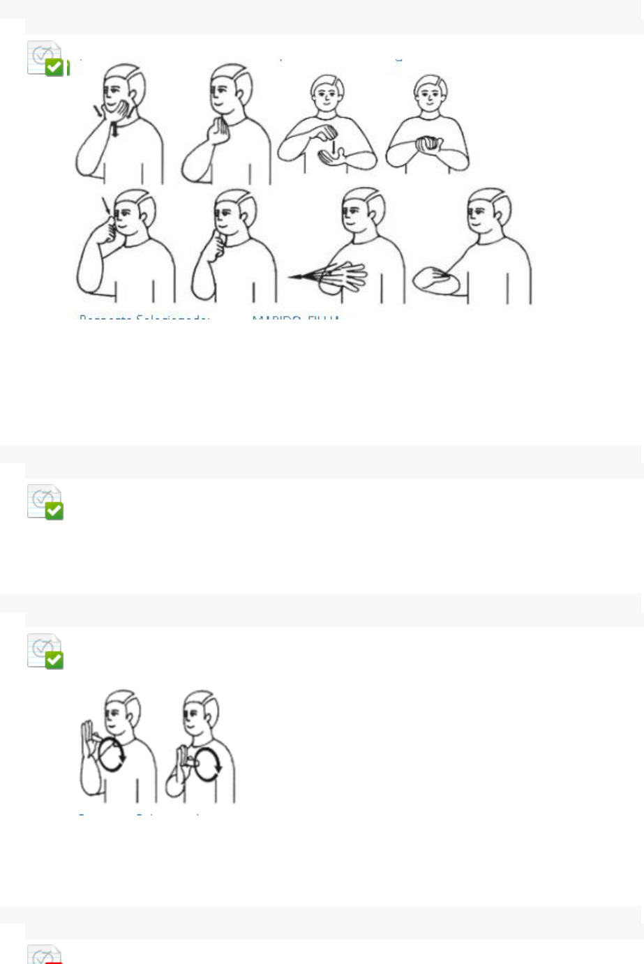 Pergunta 1 1 em 1 pontos Quais membros da família estão representados na imagem abaixo? Resposta Selecionada: a. MARIDO, FILHA. Pergunta 2 1 em 1 pontos Quem é o profissional que garante a acessibilidade comunicativa para os alunos surdos usuários de Língua de Sinais que estão incluídos no Ensino Regular? Resposta Selecionada: c. O TRADUTOR E INTÉRPRETE DE LIBRAS. Pergunta 3 1 em 1 pontos Assinale a alternativa correspondente ao significado do sinal representado abaixo. Resposta Selecionada: b. FACULDADE. Pergunta 4 0 em 1 pontos Leia atentamente o fragmento a seguir: “Alunos surdos e ouvintes convivem no mesmo ambiente e a professora é responsável por instruí-los em língua de sinais e fala oral, as quais ocorrem concomitantemente. Com o auxílio de recursos imagéticos, fala oral, sinais, gestos, expressões artísticas, a professora ministra as aulas com a finalidade de que todos os alunos estejam incluídos e entendam os conteúdos através das línguas que está falando ao mesmo tempo, sinais e fala oral.” Que tipo de abordagem educacional o texto acima representa? Resposta Selecionada: c. Bilinguismo. Pergunta 5 1 em 1 pontos Qual é o pronome representado abaixo? Resposta Selecionada: d. QUANTO. Pergunta 6 1 em 1 pontos Assinale a resposta correspondente ao significado do sinal representado abaixo. Resposta Selecionada: e. ANO. Pergunta 7 1 em 1 pontos Com relação à Língua Brasileira de Sinais, assinale Verdadeiro (V) ou Falso (F). I - É uma língua universal, usada por todas as pessoas surdas. II - Tem vários gestos iguais, que são utilizados dependendo do contexto. III - É uma forma reduzida da Língua Portuguesa. IV - A lei que a oficializou no Brasil foi a Lei 10.436/2002. Qual alternativa indica somente as frases corretas? Resposta Selecionada: d. Somente a IV é correta. Pergunta 8 1 em 1 pontos Observe o sinal a seguir, retirado do dicionário Capovilla (2017) e assinale a alternativa correta. Resposta Selecionada: d. SEU NOME. Pergunta 9 1 em 1 pontos Observe a imagem a seguir e assinale a alternativa correta. Resposta Selecionada: a. O gráfico representa a história dos surdos, desde a antiguidade até os tempos atuais, em que a seta pequena indica o Congresso de Milão, que ocorreu no ano de 1880, com a proibição das línguas de sinais a nível mundial e consequentemente a desvalorização dos surdos na sociedade. Pergunta 10 1 em 1 pontos Qual alternativa indica os números corretos? Resposta Selecionada: c. 8259 4607