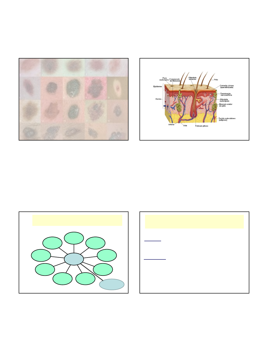 06/08/19 1 CONTINUIDADE OU INTEGRIDADE DA PELE LESÕES ELEMENTARES Profa. Enfa. Pget. Maria Alice Moreira Torres Santiago Figura anatomia da pele ANOTOMIA DA PELE PELE • Aspectos a serem investigados no exame físico COR TEMPERATURA TURGOR ELASTICIDADE SENSIBILIDADE MOBILIDADE ESPESSURA TEXTURA UMIDADE AVALIAM LESÕES LESÕES ELEMENTARES • Classificação Primárias: aparecem sem ser precedidas de outra alteração macroscópica. Secundárias: resultam da evolução de lesões primitivas. Esta diferença tem importância, pois a lesão primitiva é a expressão original da dermatose e a base ou o ponto de partida para diagnóstico. 06/08/19 2 LESÕES ELEMENTARES PRIMARIAS LESÕES ELEMENTARES SECUNDÁRIAS •PLANAS •SOLIDAS •LIQUIDAS ALTERAÇÕES: • CONSISTENCIA E ESPESSURA • PERDA DE SUSBSTANICA LESÕES ELMENTARES PRIMÁRIAS PLANAS SÓLIDAS CONTEÚDO LIQUIDO Maculas Pigmentares Máculas Vásculo- sanguineas 1. Pápula 2. Placa 3. Nódulo 4. Vegetação 1. Vesícula 2. Bolha 3. Pústula 4. Abscesso 5. Cisto 6. Hematoma 1. Eritema 2. Telangectasia 3. Púrpura 4. Angimotosa 5. Anemicas 1. Hipocromia 2. Acromia 3. Hipercromia LESÕES ELMENTARES SECUNDÁRIAS ALTERAÇÕES CONSISTÊNCIA E ESPESSURA ALTERÃÇÕES PRODUZIDAS PERDA DE SUBSTANCIAS 1. Erosão / Exulceração 2. Ulcera 3. Crosta 4. Escama 5. Fissura 6. Escara 7. Fistula 1. Queratose 2. Liquenificação 3. Cicatriz 06/08/19 3 MÁCULAS OU MANCHAS: São modificações de coloração da pele sem alteração de relevo ou consistência. As manchas ou máculas podem ser de dois tipos, conforme suas origens: Vásculo-sangüínea - Decorrente de congestão ou constrição vascular ou extravasamento de hemácias Pigmentar - Ocorrem por deposição de melanina pigmentos endógenos ou exógenos. Vásculo-sangüínea •Eritema •Telangiectasia •Púrpura •Mancha angiomatosa •Mancha anêmica Pigmentar •Leucodermia (Hipocromia e Acromia) •Hipercromia LESÕES ELEMENTARES PRIMÁRIAS Planas Máculas/Manchas ERITEMA Mancha de coloração vermelha por vasodilatação que desaparece com a dígito. Pode assumir tonalidades e padrões variados, como: eritema cianótico, rubro. Eritema: dermatite amoniacal (das fraldas) Eritema: máculas eritematosas da sífilis secundária recente Eritema: lupus eritematoso discóide LESÕES ELEMENTARES PRIMÁRIAS PLANAS MANCHAS VÁSCULO-SANGUÍNEAS 06/08/19 4 LESÕES ELEMENTARES PRIMÁRIAS PLANAS MANCHAS VÁSCULO-SANGUÍNEAS TELANGIECTASIA • Dilatação vascular capilar (de artérias ou veias de pequeno calibre - menor que 2mm) permanente na derme superficial, constituindo lesão linear ou puntiforme. LESÕES ELEMENTARES PRIMÁRIAS PLANAS MANCHAS VÁSCULO-SANGUÍNEAS PÚRPURA • Mancha vermelho-violácea que não desaparece à digito ou vitropressão, formada por sangue extravascular visível ou seja, por extravasamento de hemácias na derme. Apresentam-se como equimoses e petéquias. Equimose: área de extravasamento sanguíneo maior que 1cm de diâmetro. Petéquia: púrpura formada por pontos minúsculos, de até 1 cm de diâmetro. LESÕES ELEMENTARES PRIMÁRIAS PLANAS MANCHAS VÁSCULO-SANGUÍNEAS MANCHA ANGIOMATOSA • Aparece em decorrência de neoformação vascular na derme. • Consiste de uma lesão eritematosa que regride quase que totalmente à digito ou vitropressão. Mancha angiomatosa ou hemangioma da face. • Mancha branca permanente por diminuição ou ausência de vasos sangüíneos. • Consiste de área clara na pele, geralmente bem delimitada, decorrente de hipogenesia vascular ou hiperreatividade local às aminas vasoconstritoras • Ausência da rede vascular na derme superficial LESÕES ELEMENTARES PRIMÁRIAS PLANAS MANCHAS ANEMICA 06/08/19 5 LESÕES ELEMENTARES PRIMÁRIAS PLANAS MANCHAS PIGMENTARES LEUCODERMIA: Mancha branca por diminuição (hipocromia) ou ausência (acromia) de pigmento melânico (melanina) na epiderme. Hipocromia: pitiríase alba Hipopigmentação (hipocromia) - mancha hipocrômica Acromia ou mancha acrômica : vitiligo LESÕES ELEMENTARES PRIMÁRIAS PLANAS MANCHAS PIGMENTARES • HIPERCROMIA: Ocorre por depósito de pigmento (que pode ser melanina ou outro pigmento) na epiderme. erupção medicamentosa ou farmacodermia acantose nigricante neurodermatite LESÕES ELEMENTARES Sólidas • Pápula • Placa • Nódulo • Vegetação LESÕES ELEMENTARES PÁPULA 06/08/19 6 LESÕES ELEMENTARES PRIMÁRIAS SÓLIDAS PÁPULA: Lesão sólida e circunscrita, menor que 1cm de diâmetro, elevada (que faz relevo em relação aos planos circunjacentes), com superfície plana ou encurvada. Pode ser epidérmica, dérmica ou mista. Pápulas da sífilis secundária tardia Pápulas Pápulas Pápulas 06/08/19 7 LESÕES ELEMENTARES PRIMÁRIAS SÓLIDAS PLACA: Lesão elevada, maior que 1cm, geralmente de superfície plana. Obs: A superfície da placa pode ser também descamativa, crostosa, queratinizada ou macerada. Pode ser constituída pela confluência de várias pápulas (placa papulosa). (Obs: O termo "placa" também é empregado para a confluência de máculas, sendo então denominada a lesão placa maculosa). Placa: Granuloma anular Placas extensas resultantes da confluência de lesões papulosas de urticária Placas Placas LESÕES ELEMENTARES SÓLIDAS NÓDULO 06/08/19 8 LESÕES ELEMENTARES PRIMÁRIAS SÓLIDAS NÓDULO : • Infiltrado sólido circunscrito, geralmente bem delimitado, persistente, de localização dérmica ou hipodérmica. • Podendo ser elevado ou situado profundamente na derme. • Medindo 1 a 3 cm de diâmetro. • Costuma ser mais palpável que visível. Carcinoma basocelular nódulo-cístico Nódulos LESÕES ELEMENTARES PRIMÁRIAS SÓLIDAS VEGETAÇÃO: Pápula elevada, pediculada ou não, de superfície irregular, ocasionalmente sangrante. Pode ser recoberta por superfície queratósica dura, inelástica e amarelada. Recebendo o nome de verrucosidade ou lesão verrucosa. Vegetação: verruga vulgar, duas lesões típicas LESÕES ELEMENTARES Conteú