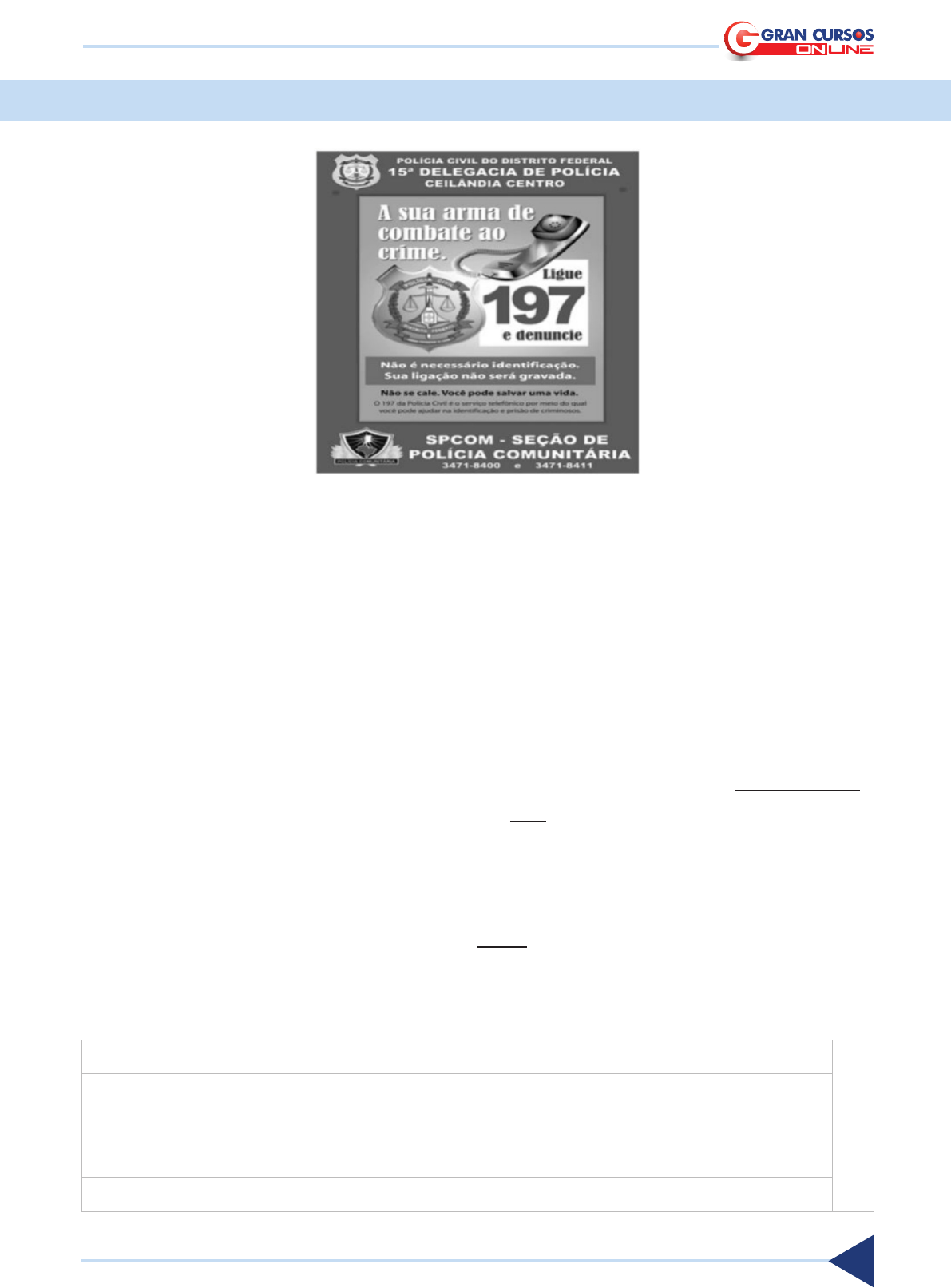 1 Exercícios GRAMÁTICA EM EXERCÍCIOS (IADES) www.grancursosonline.com.br AN O TAÇ Õ ES Produção: Equipe Pedagógica Gran Cursos Online EXERCÍCIOS 1. De acordo com a norma-padrão e as questões gramaticais referentes ao tex- to, assinale a alternativa correta. a. Do ponto de vista da regência, as construções “A sua arma de combate ao crime.” e “Ligue 197 e denuncie” poderiam ser substituídas, respectiva- mente, pelas seguintes redações: A sua arma para combater o crime. e Ligue e informe à Polícia Civil do que você sabe. b. Na oração “Não se cale.”, o pronome oblíquo poderia ter sido empregado depois do verbo. c. Caso o vocábulo sublinhado no período “Não é necessário identificação.” estivesse determinado pelo pronome sua, a nova redação deveria ser Não é necessária sua identificação. Entretanto, se fosse apenas substituído pelo substantivo identificações, a construção deveria ser Não é neces- sário identificações. d. Se o termo sublinhado na oração “Você pode salvar uma vida.” fosse subs- tituído pela expressão A maior parte de vocês, o verbo “pode” deveria necessariamente passar a ser flexionado na terceira pessoa do plural. 2 Exercícios GRAMÁTICA EM EXERCÍCIOS (IADES) www.grancursosonline.com.br AN O TA Ç Õ ES Produção: Equipe Pedagógica Gran Cursos Online e. Caso o emissor julgasse conveniente, poderia substituir o período “Sua ligação não será gravada.” por qualquer uma das seguintes redações: Fi- que certo de que sua ligação não será gravada. Ou Tenha certeza que sua ligação não será gravada. Comentário Analisando item a item: a) Em matéria de regência verbal, procura-se analisar a relação entre verbo e complemento. Em linhas gerais, o verbo transitivo direto (VTD) pede um objeto direto; o verbo transitivo indireto (VTI) pede um objeto indireto; o verbo transitivo direto e indireto (VTDI) pede um objeto direto e um objeto indireto. Voltando à questão, observa-se a sugestão do item da frase “A sua arma para combater o crime”. Quem combate, combate algo; portanto, trata-se de um verbo transitivo direto, cujo complemento é um objeto direto. Por outro lado, o item sugere a frase “Ligue e informe à Polícia Civil (...)”, cujo verbo central (informar) apresenta duas regências: 1) quem informa, informa alguém de algo; 2) quem informa, informa algo a alguém. Ou seja, necessariamente, deve-se ter um complemento com e outro sem preposição (VTDI). Portanto, a frase “Ligue e informe à Polícia Civil do que você sabe” apresenta dois termos preposicionados, desobedecendo à regência do verbo. A frase estará redigida corretamente caso: I) tiver a crase suprimida e mantiver a preposição de; II) mantiver a crase e suprimir a preposição de. b) Na oração “Não se cale”, o pronome oblíquo aparece proclítico, pois a partícula de negação “Não” tem valor atrativo. c) Em orações do tipo apresentado no item, quando não houver um determinante (artigo, pronome adjetivo), mantém-se a forma singular, no masculino. Quando houver determinante, será obrigatória a concordância em gênero e número. d) Na expressão “A maior parte de vocês”, que atuaria como sujeito, na sugestão do item, o núcleo é a palavra “parte”. Esse caso é denominado “núcleo partitivo”, em que se faz referência à parte de um todo. Para esse tipo de sujeito, admite- se a concordância verbal tanto com a “parte” (a maior parte), como com o “todo” (vocês) – concordância facultativa. Portanto, não é obrigatória a manutenção do verbo da oração na terceira pessoa do singular. 3 Exercícios GRAMÁTICA EM EXERCÍCIOS (IADES) www.grancursosonline.com.br AN O TAÇ Õ ES Produção: Equipe Pedagógica Gran Cursos Online e) Esse item é polêmico por apresentar um tema de diferentes abordagens teóricas concernente a orações subordinadas substantivas, no caso, o uso de preposição nas objetivas diretas e nas completivas nominais. No caso da banca IADES, o uso de preposições nessas orações é obrigatório. Voltando à questão, observa-se que a oração “Fique certo de que sua ligação não será gravada” é classificada como completiva nominal, uma vez que “certo” não é um verbo. Como tal, o seu complemento deve ser preposicionado. Sobre a oração sugerida pelo item, “Tenha certeza que sua ligação não será gravada”, de acordo com a banca, ela também deveria ter complemento preposicionado por ser completiva nominal, pois, “quem tem certeza, tem certeza de algo”. O pulo do gato A banca IADES considera o uso de preposição obrigatório em orações subordinadas substantivas completivas nominais e objetivas indiretas. 2. Assinale a alternativa que, em conformidade com as regras de pontuação e de ortografia vigentes, reproduz com coerência a relação de sentido estabe- lecida entre os períodos “Não se cale. Você pode salvar uma vida”. a. Você pode garantir a salvação de uma vida, portanto não se cale. b. Não haja de forma omissa: você pode salvar uma vida. c. Não se cale, por que você pode salvar uma vida. d. Você pode salvar uma vida, por isso não fique hexitoso: denuncie. e. Não se cale: porque assim, você salvará uma vida. Comentário Analisando item a item: a) Na oração sugerida, o termo “portanto” tem valor conclusivo, dando a ideia de que o primeiro período da oração apresenta um argumento lógico que conduz à elaboração do segundo período: “Você pode garantir a salvação de uma vida, logo não se cale”. 4 Exercícios GRAMÁTICA EM EXERCÍCIOS (IADES) www.grancursosonline.com.br AN O TA Ç Õ ES Produção: Equipe Pedagógica Gran Cursos Online b) Na oração apresentada no item, há uma confusão entre o verbo “haver” e o verbo “agir”. A forma correta do verbo no modo imperativo seria “aja”. c) Nessa oração, a conjunção estabeleceria uma relação explicativa entre o