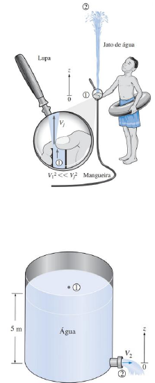 Material para estudo: - exemplos do livro texto – FOX - outros exercícios: Exercícios/ Bernoulli A água escoa de uma mangueira. Uma criança coloca o polegar para cobrir a maior parte da saída da mangueira, transformando o escoamento em um jato fino de água a alta velocidade. A pressão na mangueira a montante do dedo é de 400 kPa. Se a mangueira for mantida para cima, qual a altura máxima que pode ser atingida pelo jato? (R= 40,8m) Um grande tanque aberto para a atmosfera é preenchido com água até uma altura de 5m da saída de uma torneira. Uma torneira próxima a parte inferior do tanque é aberta e a água escoa para fora da saída arredondada e lisa. Determine a velocidade da água na saída. (R=9,9m) Durante uma viagem à praia ( Patm = 1 atm = 101,3 kPa), um automóvel fica sem gasolina, e é necessário tirar com um sifão a gasolina do carro de um bom samaritano. O sifão, é uma mangueira com diâmetro pequeno, e para iniciar o bombeamento é preciso inserir um lado do sifão no tanque de gasolina cheio, encher a mangueira com gasolina por sucção e, em seguida, colocar o outro lado em um galão de gasolina abaixo do nível do tanque. A diferença de pressão entre o ponto 1 ( na superfície livre da gasolina do tanque) e o ponto 2 ( na saída do tubo) faz o líquido escoar da elevação mais alta para a mais baixa. O ponto 2 está localizado a 0,75m abaixo do ponto 1 neste caso, e o ponto 3 está localizado 2m acima do ponto 1. O diâmetro do sifão é de 5mm, e as perdas por atrito no sifão devem ser desprezadas. Determine a) o tempo mínimo para retirar 4 L de gasolina do tanque para o galão. b) a pressão no ponto 3. (A massa específica da gasolina é de 750 kg/m3). (R= 53,1s; 81,1kPa) Um piezômetro e um tubo de pitot são colocados em um tubo de água horizontal como mostra a figura, para medir as pressões estática e de estagnação. Para as alturas de coluna de água indicadas, determine a velocidade no centro do tubo. (h1 = 3cm; h2= 7cm; h3= 12 cm). (R= V1 = 1,53 m/s) 5) A extremidade de um tubo é tampada com um redutor, como mostra a figura. Se a pressão da água dentro do tubo em A é de 200 kPa, determine a força de cisalhamento que a cola nas laterais do tubo exerce sobre o redutor para mantê-lo no lugar. (R=FR=1,39kN) 6)1)A água sobe pelo tubo que está conectado à transição. Se a vazão volumétrica for 0,02 m3/s, determine a altura h que a água alcançará no tubo de Pitot. O nível do piezômetro em A é o indicado. (R=95,5m) Exercícios sem resposta: 4) A água sobe pelo tubo vertical. Determine a pressão em A se a velocidade média em B for de 4 m/s. 5) A medida que o ar escoa pela restrição do Venturi, ele cria uma baixa pressão em A, que faz com que o alcool etílico suba no tubo e seja retirado para a corrente de ar. Determine a velocidade do ar enquanto ele passa pelo tubo em B para que consiga fazer isto. O ar é descarregado na atmosfera em C. Considere a massa específica do alcool etílico de 789 kg/m3 e a do ar 1,225 Kg/m3. 6)A água é drenada em uma bacia de fonte A para a bacia B. Se a profundidade da bacia B é h=50mm, determine a velocidade da água em C e o diâmetro d da abertura em D de modo que o escoamento ocorra de modo permanente. 7) O óleo escoa a 0,05 m3/s através da transição. Se a pressão na transição C for de 8 kPa, determine a força de cisalhamento horizontal resultante que atua ao longo da emenda AB que segura a conexão com o tubo maior. Considere ρoleo= 900 kg/m3. 8) Uma pequena ascídia marinha, chamada Styela, fixa-se ao solo marinho e depois permite que a água em movimento passe dentro dela para poder se alimentar. Se a abertura em A possui um diâmetro de 2mm e na saída o diâmetro é de 1,5 mm, determine a força horizontal necessária para manter este organismo preso ao solo em C, quando a água está se movimentando a 0,2 m/s para dentro da abertura em A. (ρmar= 1050 kg/m3)