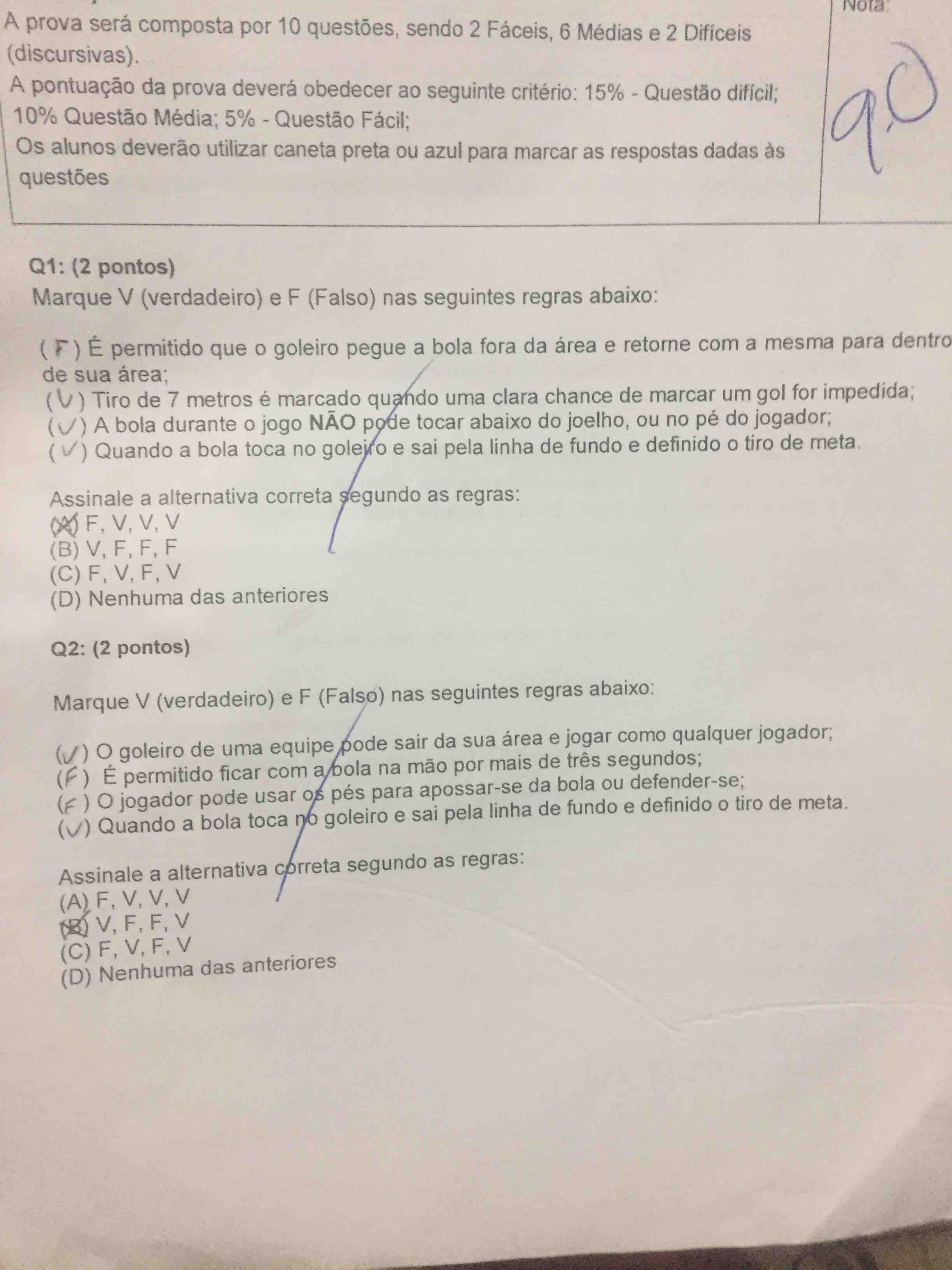 A (discursivas). prova sera composta por 10 questoes, sendo 2 Faceis, 6 Medias e Dificeis A pontuacao da prova devera obedecer ao seguinte criterio 15% Questao dificil; 10% Questao Media; 5% - Questao Facil; Os alunos deverao utilizar caneta preta ou azul para marcar as respostas. Q1: (2 pontos) Marque V (verdadeiro) e F (Falso) nas seguintes regras abaixo: (F) E permitido que goleiro pegue a bola fora da area e retorne com a mesma para dentro de sua area; (V) Tiro de 7 metros e marcado quando uma clara chance de marcar um gol for impedida; A bola durante jogo NAO pode tocar abaixo do joelho ou no pe do jogador; (V) Quando a bola toca no golejro e sai pela linha de fundo e definido O tiro de meta. Assinale a alternativa correta segundo as regras: (F) E permitido que goleiro pegue a bola fora da area e retorne com a mesma para dentro de sua area; (V) Tiro de 7 metros e marcado quando uma clara chance de marcar um gol for impedida; A bola durante jogo NAO pode tocar abaixo do joelho ou no pe do jogador; (V) Quando a bola toca no golejro e sai pela linha de fundo e definido O tiro de meta. A) V, V, V B) V, F, F, F C) F, V, F D) Nenhuma das anteriores
