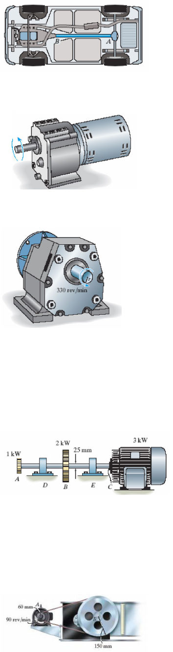 - 1 - Capítulo 5 – Torção – 5ª Lista de Exercícios – Complementar 1) 5.33. O projeto prevê que o eixo de transmissão AB de um automóvel será um tubo de parede fina. O motor transmite 125 kW quando o eixo está girando a 1.500 rev/minuto. Determine a espessura mínima da parede do eixo se o diâmetro externo for 62,5 mm. A tensão de cisalhamento admissível do material é τadm = 50 MPa. 2) 5.34. O motor de engrenagens pode desenvolver 100 W quando gira a 300 rev/minuto. Se o eixo tiver diâmetro de 12 mm, determine a tensão de cisalhamento máxima que será desenvolvida no eixo. 3) 5.37. O motor-redutor de 2,5 kW pode girar a 330 rev/minuto. Se o diâmetro do eixo for 20 mm, determine a tensão de cisalhamento máxima que será desenvolvida no eixo. 4) 5.39. O eixo maciço de aço AC tem diâmetro de 25 mm e está apoiado nos mancais lisos em D e E. O eixo está acoplado a um motor em C, que transmite 3 kW de potência ao eixo quando está girando a 50 rev/s. Se as engrenagens A e B absorvem 1 kW e 2 kW, respectivamente, determine a tensão de cisalhamento máxima desenvolvida no eixo no interior das regiões AB e BC. O eixo é livre para girar em seus mancais de apoio D e E. 5) 5.40. Um navio tem um eixo de transmissão da hélice que gira a 1.500 rev/minuto quando está desenvolvendo 1.500 kW. Se o eixo tiver 2,4 m de comprimento e 100 mm de diâmetro, determine a tensão de cisalhamento máxima no eixo causado por torção. 6) 5.41. O motor A desenvolve potência de 300 W e gira a polia acoplada a 90 rev/minuto. Determine os diâmetros exigidos para os eixos de aço nas polias em A e B se a tensão de cisalhamento admissível for τadm = 85 MPa. - 2 - 7) 5.42. O motor transmite 400 kW ao eixo de aço AB, o qual é tubular e tem diâmetro externo de 50 mm e diâmetro interno de 46 mm. Determine a menor velocidade angular com que ele pode girar se a tensão de cisalhamento admissível para o material for τadm = 175 MPa. 8) 5.43. O motor transmite 40 kW quando está girando a taxa constante de 1.350 rpm em A. Esse carregamento é transmitido ao eixo de aço BC do ventilador pelo sistema de correia e polia mostrado na figura. Determine, com aproximação de múltiplos de 5 mm, o menor diâmetro desse eixo se a tensão de cisalhamento admissível para o aço for τadm = 84 MPa. 9) 5.44. As hélices de um navio estão acopladas a um eixo maciço de aço A-36 com 60 m de comprimento, diâmetro externo de 340 mm e diâmetro interno de 260 mm. Se a potência de saída for 4,5 MW quando o eixo gira a 20 rad/s, determine a tensão de torção máxima no eixo e seu ângulo de torção.