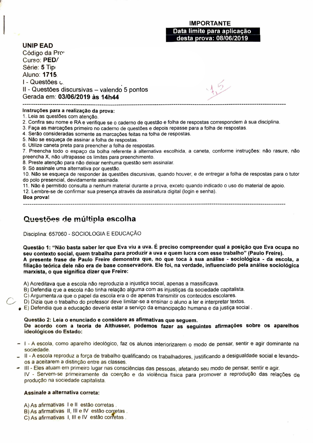 Disciplina: 657060 - SOCIOLOGIA E EDUCAÇÃO