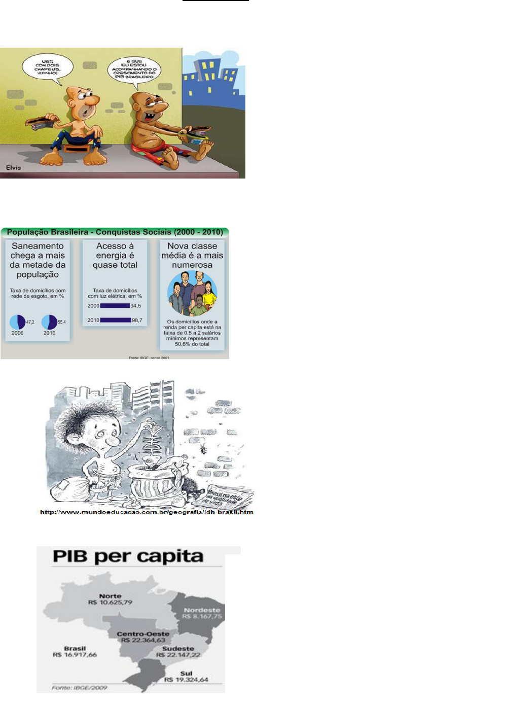 ATIVIDADE Está lançado o desafio! Observe a charge abaixo e pense na situação social do Brasil! O Brasil segundo dados de 2012 apresenta a sétima maior economia do Mundo. Mas isso não significa uma superação da maioria dos problemas sociais presentes. Agora, pense e reflita! Com esses dados podemos afirmar que toda população brasileira terá melhorado de vida e terá também melhores condições econômicas? Observe os gráficos abaixo sobre as conquistas sociais adquiridas pela população brasileira entre 2000 e 2010: Segundo o gráfico qual é a opção correta? Os gráficos mostram que as conquistas adquiridas pela população são o acesso à água tratada, transporte público e escolas. Mais da metade da população conseguiu saneamento básico, acesso à energia e melhor renda. Os gráficos mostram que as mudanças sociais brasileiras foram muito poucos e insignificantes para a população. Um dos problemas enfrentados pela população é a falta de energia elétrica e fome. A partir da charge, assinale a alternativa que melhor interpreta a ideia do autor: A charge mostra que o Brasil está melhorando a qualidade de vida da população. O personagem da charge fica feliz com a notícia do jornal pois sabe que sua vida irá melhorar. A charge mostra uma contradição entre a reportagem do jornal e a situação vivida pelo personagem. O personagem está a procura de material para reciclagem e mostra que sua qualidade de vida melhorou. Observe o mapa abaixo: A soma das riquezas produzidas pelo Brasil dividida pelo número de habitantes daria para cada pessoa R$16.917,66. No entanto, no mapa podemos observar que esse número não é o mesmo em cada região. A maior desigualdade entre o PIB per capita está entre as regiões: Sul e sudeste Norte e nordeste Centro-oeste e sudeste Nordeste e centro-oeste Observe a imagem a seguir: Que leitura é possível fazer desta imagem? A distribuição da renda em nosso país acontece de forma igualitária? Qual é o conceito de desigualdade social? Quais são os principais fatores responsáveis pela desigualdade social no Brasil? É possível manter uma família com um salário mínimo? Quanto seria necessário, em sua opinião, para uma família viver com um mínimo de qualidade de vida?