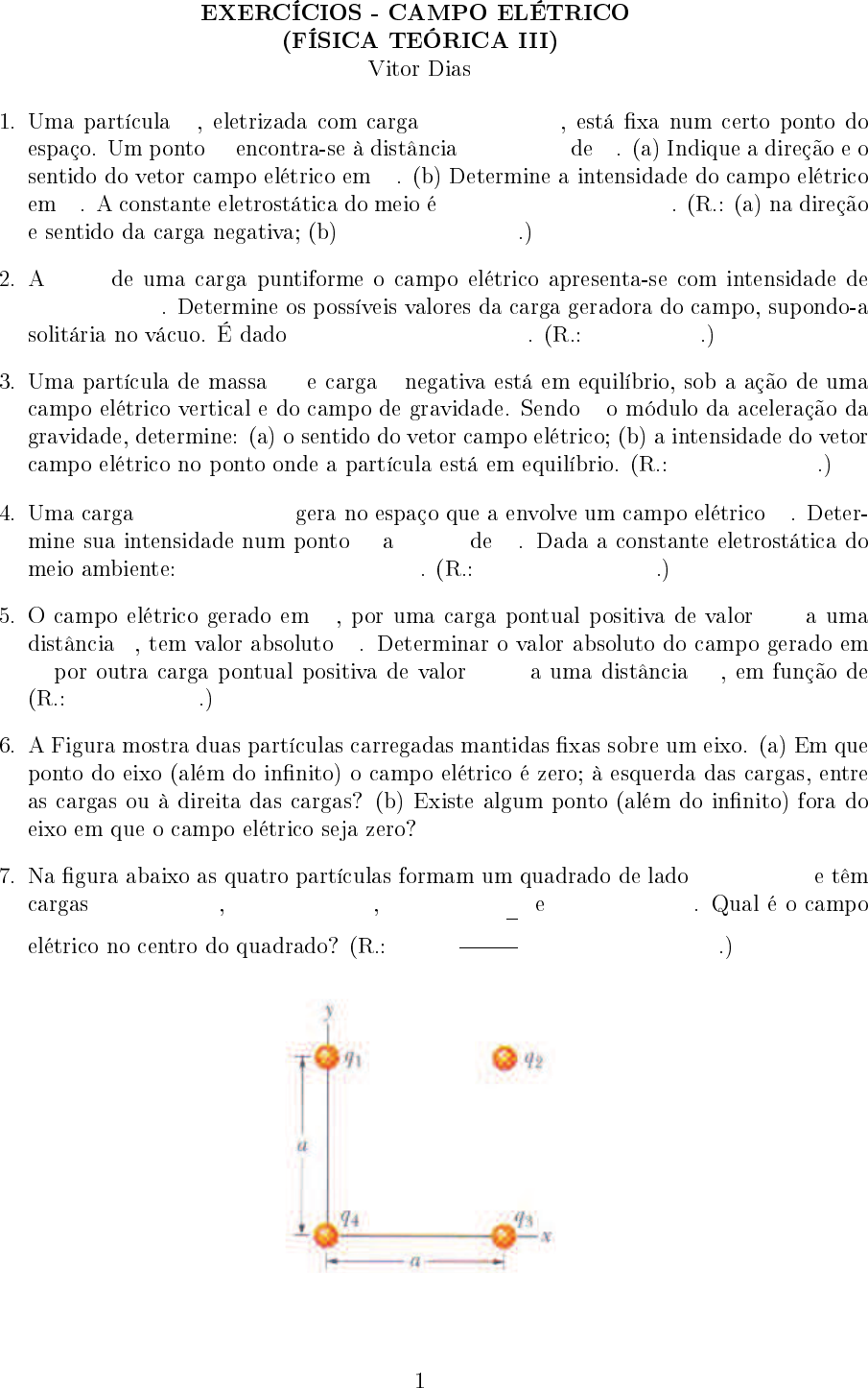 EXERCÍCIOS - CAMPO ELÉTRICO (FÍSICA TEÓRICA III) Vitor Dias 1. Uma partícula A, eletrizada com carga Q = −4.0µC, está fixa num certo ponto do espaço. Um ponto P encontra-se à distância d = 1.0cm de A. (a) Indique a direção e o sentido do vetor campo elétrico em P . (b) Determine a intensidade do campo elétrico em P . A constante eletrostática do meio é K0 = 9.0×109Nm2/C2. (R.: (a) na direção e sentido da carga negativa; (b) E = 3.6 · 108N/C.) 2. A 1.0m de uma carga puntiforme o campo elétrico apresenta-se com intensidade de 9.0× 103N/C. Determine os possíveis valores da carga geradora do campo, supondo-a solitária no vácuo. É dado K0 = 9.0× 109Nm2/C2. (R.: Q = ±1µC.) 3. Uma partícula de massa M e carga q negativa está em equilíbrio, sob a ação de uma campo elétrico vertical e do campo de gravidade. Sendo g o módulo da aceleração da gravidade, determine: (a) o sentido do vetor campo elétrico; (b) a intensidade do vetor campo elétrico no ponto onde a partícula está em equilíbrio. (R.: E = (M · g)/q.) 4. Uma carga Q = 2.0× 10−6 gera no espaço que a envolve um campo elétrico ~E. Deter- mine sua intensidade num ponto P a 0.50m de Q. Dada a constante eletrostática do meio ambiente: K0 = 9.0× 109Nm2/C2. (R.: E = 7.2 · 104N/C.) 5. O campo elétrico gerado em P , por uma carga pontual positiva de valor +Q a uma distância d, tem valor absoluto E. Determinar o valor absoluto do campo gerado em P por outra carga pontual positiva de valor +2Q a uma distância 3d, em função de (R.: E ′ = (2/3)E.) 6. A Figura mostra duas partículas carregadas mantidas fixas sobre um eixo. (a) Em que ponto do eixo (além do infinito) o campo elétrico é zero; à esquerda das cargas, entre as cargas ou à direita das cargas? (b) Existe algum ponto (além do infinito) fora do eixo em que o campo elétrico seja zero? 7. Na figura abaixo as quatro partículas formam um quadrado de lado a = 5.00cm e têm cargas q1 = +10nC, q2 = −20.0nC, q3 = +20.0nC e q4 = −10.0nC. Qual é o campo elétrico no centro do quadrado? (R.: ER = K0 √ 2 d2 · 10nC = 50.91N/C.) 1 8. A Figura acima mostra uma barra de plástico com uma carga −Q uniformemente distribuída. A barra tem a forma de um arco de circunferência de 120o de extensão e raio r. Os eixos de coordenadas são escolhidos de tal forma que o eixo de simetria da barra é o eixo x e a origem P está no centro de curvatura do arco. Em termos de Q e r, qual é o campo elétrico ~E produzido pela barra no ponto P? (R.: ~E = 0.83q/4piε0R 2iˆ; E = 1.73λ/4piε0R.) 9. Na Figura abaixo a partícula 1, de carga q1 = −5.00q, e a partícula 2, de carga q2 = +2.00q, são mantidas fixas sobre o eixo x. (a) Em que ponto do eixo, em termos da distância L, o campo elétrico total é nulo? (b) Faça um esboço dos vetores do campo elétrico. (R.: (a) 1.67L.) 10. A Figura abaixo mostra duas partículas carregadas mantidas fixas sobre o eixo x: −q = −3.20 × 10−19C, no ponto x = −3.00m, e q = 3.20 × 10−19C, no ponto x = +3.00m. Determine (a) o módulo e (b) a orientação (em relação ao semi-eixo x positivo) do campo elétrico no ponto P , para o qual y = 4.00m. (R.: ER = 1, 38 · 10−10N/C.) 2 11. Uma partícula alfa (núcleo de um átomo de hélio) tem uma massa de 6.64 × 10−27kg e uma carga de +2e. Determine (a) o módulo e (b) a direção de um campo elétrico capaz de equilibrar o peso da partícula. (R.: (a) 2.03 · 10−7N/C; (b) para cima.) 12. Na Figura abaixo, um campo elétrico uniforme vertical ~E de módulo 2.00×103N/C foi estabelecido entre duas placas horizontais carregando positivamente a placa de baixo e negativamente a placa de cima. As placas têm um comprimento L = 10.0cm e estão separadas por uma distância d = 2.00cm. Um elétron é lançado no espaço entre as placas a partir da extremidade esquerda da placa de baixo. A velocidade inicial ~v0 faz um ângulo θ = 450 com a placa de baixo e tem um módulo de 6.00 × 106m/s. (a) O elétron irá se chocar com uma das placas? (b) Se a resposta for afirmativa, com qual das placas o elétron irá se chocar e a que distância horizontal da extremidade esquerda das placas? (R.: (a) Como 2.72cm<10cm, concluimos que o elétron atinge a placa superior, e, (b) num ponto situado a 2.72cm da extremidade esquerda da placa superior.) 13. Uma barra infinita não-condutora, com uma distribuição uniforme de carga positiva Q, tem a forma de um círculo de raio R de acordo com a Figura abaixo. O eixo central do anel é o eixo z, com a origem no centro do anel. (a) Em termos de R, para que valor positivo de z o módulo do campo elétrico é máximo? (b) Se R = 2, 0cm, qual será o valor de z? 3