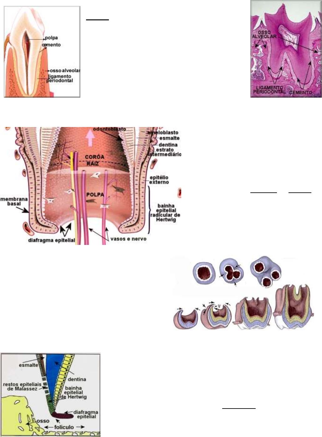 2019 Odontologia FAPI 1 PERIODONTO DE SUSTENTAÇÃO O periodonto de sustentação é o aparelho de fixação dos dentes e consiste de: cemento, osso alveolar e ligamento periodontal. Compreende portanto, três tecidos conjuntivos, sendo dois mineralizados e um fibroso. A formação do periodonto de sustentação coincide com a rizogênese. Possuem a mesma origem ectomesenquimal do folículo e dependem da formação da dentina radicular e da presença da bainha radicular epitelial de Hertwig. 1. RIZOGÊNESE No final da fase de coroa, quando os eventos de diferenciação alcançam a região da alça cervical, as células epiteliais do epitélio interno e externo continuam a proliferar, originando uma dupla camada de células que dará origem a outra estrutura: a bainha epitelial radicular de Hertwig que tem por finalidade modelar e formar a dentina radicular, até a completa formação da raiz. A Bainha de Hertwig, determina a formação de dentes unirradiculares (quando a bainha contorna todo o dente assumindo a forma de um tubo cônico simples com um único orifício). Nos dentes bi ou multirradiculares a bainha de Hertwig forma lingüetas epiteliais que se dirigem para o longo eixo do dente fusionando-se entre si. Assim, estabelece a formação do soalho da câmara pulpar e agora aquele orifício único fica dividido em dois ou três orifícios que correspondem a base das futuras raízes. A alça cervical prolifera entre a papila e o folículo dentário num ângulo agudo até englobar toda a porção basal da papila, formando um diafragma epitelial. As células da camada interna da bainha epitelial radicular de Hertwig induzem as células ectomesenquimais da papila dentária a se diferenciarem em odontoblastos e estes, recém-diferenciados formam a dentina radicular, aumentando gradualmente o comprimento da raiz. Com o início da formação radicular, a coroa do dente cresce no sentido oposto à base do osso, e a bainha radicular, na verdade, não cresce para dentro dos maxilares. Devido às modificações nesse crescimento, a bainha radicular é distendida e por fim ela se fragmenta, para formar vários grupamentos discretos de células epiteliais, separadas do tecido conjuntivo circundante por uma lâmina basal, conhecidos como restos epiteliais de Malassez. 2019 Odontologia FAPI 2 Em adultos, esses restos de células epiteliais persistem próximo à superfície radicular, no ligamento periodontal. Embora aparentemente sem função, eles podem causar patologias. A fragmentação da bainha radicular epitelial de Hertwig induz a diferenciação das células do folículo em cementoblastos. secretando a matriz orgânica do cemento. As células do lado externo do folículo diferenciam-se em osteoblastos, formando o osso alveolar. A região central do folículo se diferencia principalmente em fibroblastos e forma o ligamento periodontal. As fibras colágenas principais do ligamento periodontal (fibras de Sharpey) ficarão inseridas no cemento e osso alveolar. 2. CEMENTO O cemento representa um tecido conjuntivo mineralizado, avascular, que tem como principal função a inserção de fibras do ligamento periodontal a raiz do dente. Trata-se de um tecido muito semelhante ao osso, porém não possui a capacidade de remodelação, no entanto geralmente é mais resistente a reabsorção, crescendo lentamente por aposição, por todo vida. O cemento recobre a dentina radicular, e modifica sua espessura dependendo da localização: próximo a junção esmalte-cemento é mais delgado (20 a 50 µm) e torna-se mais espesso a medida que se aproxima do ápice da raiz (150 a 200 µm). Pela ausência de vascularização, o tecido cementário é nutrido pela difusão de substâncias advindas do ligamento periodontal. 2.1 Cementogênese A aposição do cemento, ou cementogênese, na região da raiz, ocorre quando a bainha epitelial dc Hertwig desintegra-se. Essa desintegração da bainha permite que as células indiferenciadas do folículo dentário entrem em contato com a superfície da dentina da raiz recém-formada. Assim, quando há essa exposição da dentina radicular, ocorre a indução dessas células mesenquimais indiferenciadas em se transformarem em cementoblastos e fibroblastos, respectivamente para originar o cemento e o ligamento periodontal. Os cementoblastos, rapidamente aumentam de tamanho e desenvolvem organelas citoplasmáticas especializadas na síntese e secreção de proteínas, iniciando a deposição de matriz orgânica do cemento que consiste de fibras colágenas intrínsecas e outras proteínas, sobre a superfície dentinária radicular e ao redor dos feixes de fibras colágenas do ligamento periodontal em formação (fibras extrínsecas ou fibras de Sharpey). A medida que o cementóide que envolve os cementócitos se torna calcificado ou maduro, passa a ser considerado cemento. Esta matriz orgânica é depositada ritmicamente em lamelas sucessivas, sempre seguidas pela mineralização por cristais de hidroxiapatita e deste modo, os cementoblastos se encerram em lacunas intercomunicantes, diferenciando-se em cementócitos. 2019 Odontologia FAPI 3 2.2 Classificação do cemento Quanto ao período de formação e presença de células: Primário (acelular): é o cemento que se forma juntamente com a dentina radicular e na presença da bainha epitelial, portanto, antes mesmo da erupção do dente. A deposição mineral e feita de maneira incremental e não apresenta células. Secundário (celular): formado durante o período pós-eruptivo e durante certas exigências funcionais. Possui células. Quanto a presença de fibrilas colágenas na matriz Cemento afibrilar: Cemento que possui matriz desprovida de fibrilas colágenas tipo I. Desta forma, a matriz tende a ser fina e de consitência granular. Cemento fibrilar: Cemento que contém fibrilas bem definidas e colágeno tipo I. Pela origem das fibrilas colágenas da matriz - Fibras intrínsecas do cemento: Cemento que contém fibras p