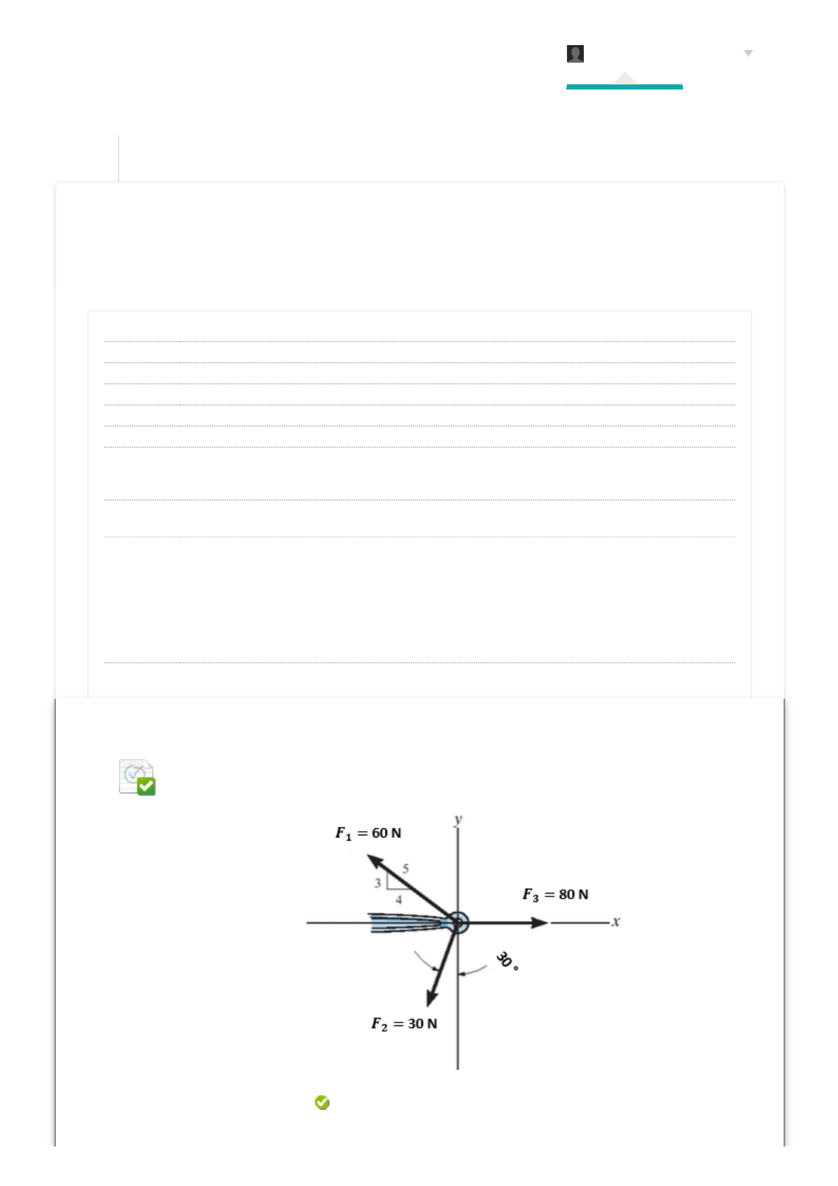 07/11/2019 Revisar envio do teste: Avaliação On-Line 2 (AOL 2) - ... https://sereduc.blackboard.com/webapps/assessment/review/review.jsp?attempt_id=_5759536_1&course_id=_23248_1&content_id=_1673998_… 1/6 171 Unidade 1 Revisar envio do teste: Avaliação On-Line 2 (AOL 2) - QuestionárioH Revisar envio do teste: Avaliação On-Line 2 (AOL 2) -Revisar envio do teste: Avaliação On-Line 2 (AOL 2) - QuestionárioQuestionário Usuário Eliton Rabelo Pereira Curso 17112 . 7 - Tópicos Integradores I (Engenharia Elétrica) - 20192.B Teste Avaliação On-Line 2 (AOL 2) - Questionário Iniciado 07/11/19 10:54 Enviado 07/11/19 11:18 Status Completada Resultado da tentativa 10 em 10 pontos Tempo decorrido 23 minutos Instruções Resultados exibidos Todas as respostas, Respostas enviadas, Respostas corretas, Perguntas respondidas incorretamente Atenção! Você terá 1 opção de envio. Você pode salvar e retornar quantas vezes desejar, pois a tentativa só será contabilizada quando você decidir acionar o botão ENVIAR. Após o envio da atividade, você poderá conferir sua nota e o feedback, acessando o menu lateral esquerdo (Notas). IMPORTANTE: verifique suas respostas antes do envio desta atividade. Pergunta 1 Resposta Selecionada: d. Respostas: a. A força resultante é a soma vetorial de todas as forças que atuam em um corpo. Determine a força resultante que atua na estrutura abaixo e a represente em termos dos versores i e j. Fr = 17i + 10j Fr = 25i - 14J Disciplinas Cursos 1 em 1 pontos Eliton Rabelo Pereira 4 07/11/2019 Revisar envio do teste: Avaliação On-Line 2 (AOL 2) - ... https://sereduc.blackboard.com/webapps/assessment/review/review.jsp?attempt_id=_5759536_1&course_id=_23248_1&content_id=_1673998_… 2/6 b. c. d. e. Fr = -15i - 26j Fr = -48i + 36j Fr = 17i + 10j Fr = 80i Pergunta 2 Resposta Selecionada: e. Respostas: a. b. c. d. e. Um carro de massa m está trafegando a uma velocidade baixa . Se ele está sujeito à resistência de arrasto do vento, que é proporcional à sua velocidade, ou seja, , determine a distância e o tempo que o carro percorrerá antes que sua velocidade torne . Suponha que não haja força de atrito sobre o carro. Pergunta 3 Resposta Selecionada: d. Respostas: a. b. c. d. e. Uma esfera é atirada para baixo em um meio com uma velocidade inicial de 27 m/s. Se ela experimenta uma desaceleração de a = (-6t) m/s², em que t é dado em segundo, determine a distância percorrida pela esfera antes de parar. 54 m 12 m 4 m 108 m 54 m 27 m Pergunta 4 A aceleração de um foguete subindo ao espaço é dado por a = (6 + 0,02s) m/s², em que s é dado em metros. Determine a velocidade do foguete quando s = 2 km. Inicialmente, v = 0 e s = 0 quando t = 0. 1 em 1 pontos 1 em 1 pontos 1 em 1 pontos 07/11/2019 Revisar envio do teste: Avaliação On-Line 2 (AOL 2) - ... https://sereduc.blackboard.com/webapps/assessment/review/review.jsp?attempt_id=_5759536_1&course_id=_23248_1&content_id=_1673998_… 3/6 Resposta Selecionada: a. Respostas: a. b. c. d. e. V = 322,5 m/s; V = 322,5 m/s; V = 161 m/s; V = 72 m/s ; V = 248 m/s; V = 228 m/s; Pergunta 5 Resposta Selecionada: c. Respostas: a. b. c. d. e. A caminhonete de 2000 kg está se movendo a 15 m/s quando os freios são aplicados em todas as suas rodas, fazendo com que ela escorregue por uma distância de 10 m antes de chegar ao repouso. Determine a força horizontal constante desenvolvida no engate C, e a força de atrito desenvolvida entre os pneus da caminhonete e a estrada durante esse tempo. A massa total da lanha e do reboque é de 1000 kg. Considere g = 10 m/s² FC = 11250 N e Fat = 33750 N FC = 22500 N e Fat = 33750 N FC = 11250 N e Fat = 22500 N FC = 11250 N e Fat = 33750 N FC = 18750 N e Fat = 26450 N FC = 26450 N e Fat = 18750 N Pergunta 6 A caminhonete precisa ser rebocada usando duas cordas. Determine as intensidades das forças FA e FB que atuam em cada corda para produzir uma força resultante de 950 N, orientada ao longo do eixo x positivo. Considerando Θ = 40°. 1 em 1 pontos 1 em 1 pontos 07/11/2019 Revisar envio do teste: Avaliação On-Line 2 (AOL 2) - ... https://sereduc.blackboard.com/webapps/assessment/review/review.jsp?attempt_id=_5759536_1&course_id=_23248_1&content_id=_1673998_… 4/6 Resposta Selecionada: b. Respostas: a. b. c. d. e. Pergunta 7 Resposta Selecionada: a. Respostas: a. b. c. d. e. Determine a intensidade da força resultante e sua direção, medida no sentido anti-horário a partir do eixo x positivo. Fr = 216, 71 N e Ɵ = 86,95°; Fr = 216, 71 N e Ɵ = 86,95°; Fr = 11,51 N e Ɵ = 87,02°; Fr = 204,9 N e Ɵ = 25,04°. Fr = 216, 42 N e Ɵ = 46,62°; Fr = 217,94 N e Ɵ = 8,93°; Pergunta 8 1 em 1 pontos 1 em 1 pontos 07/11/2019 Revisar envio do teste: Avaliação On-Line 2 (AOL 2) - ... https://sereduc.blackboard.com/webapps/assessment/review/review.jsp?attempt_id=_5759536_1&course_id=_23248_1&content_id=_1673998_… 5/6 Resposta Selecionada: b. Respostas: a. b. c. d. e. O elevador E tem massa de 500 kg e o contrapeso em A tem massa de 150 kg. Se o elevador atinge uma velocidade de 10 m/s depois de subir 40 m, determine a força constante desenvolvida no cabo em B. desconsiderar as massas das polias e do cabo. Considere g = 10 m/s² F = 4125 N F = 1500 N F = 4125 N F = 625 N F = 2350 N F = 3225 N Pergunta 9 Resposta Selecionada: b. Respostas: a. b. c. d. e. Uma partícula percorre uma linha reta com velocidade v = (12-3t²) m/s, em que t é dado em segundos. Quando t = 1 s, a partícula está localizada 10 m à esquerda da origem. Determine o deslocamento de t = 0 até t = 10 s. ∆x = -880 m ∆x = - 901 m ∆x = -880 m ∆x = 470 m ∆x = 901 m ∆x = -991 m Pergunta 10 Se o motor M exerce uma força F = (10t²+35) N sobre o cabo, onde t é dado em segundo, 1 em 1 pontos 1 em 1 pontos 07/11/2019 Revisar envio do teste: Avaliação On-Line 2 (AOL 2) - ... https://sereduc.blackboard.com/webapps/assessment/review/review.jsp?attempt_id=_5759536_1&course_id=_23248_1&content_id=_1