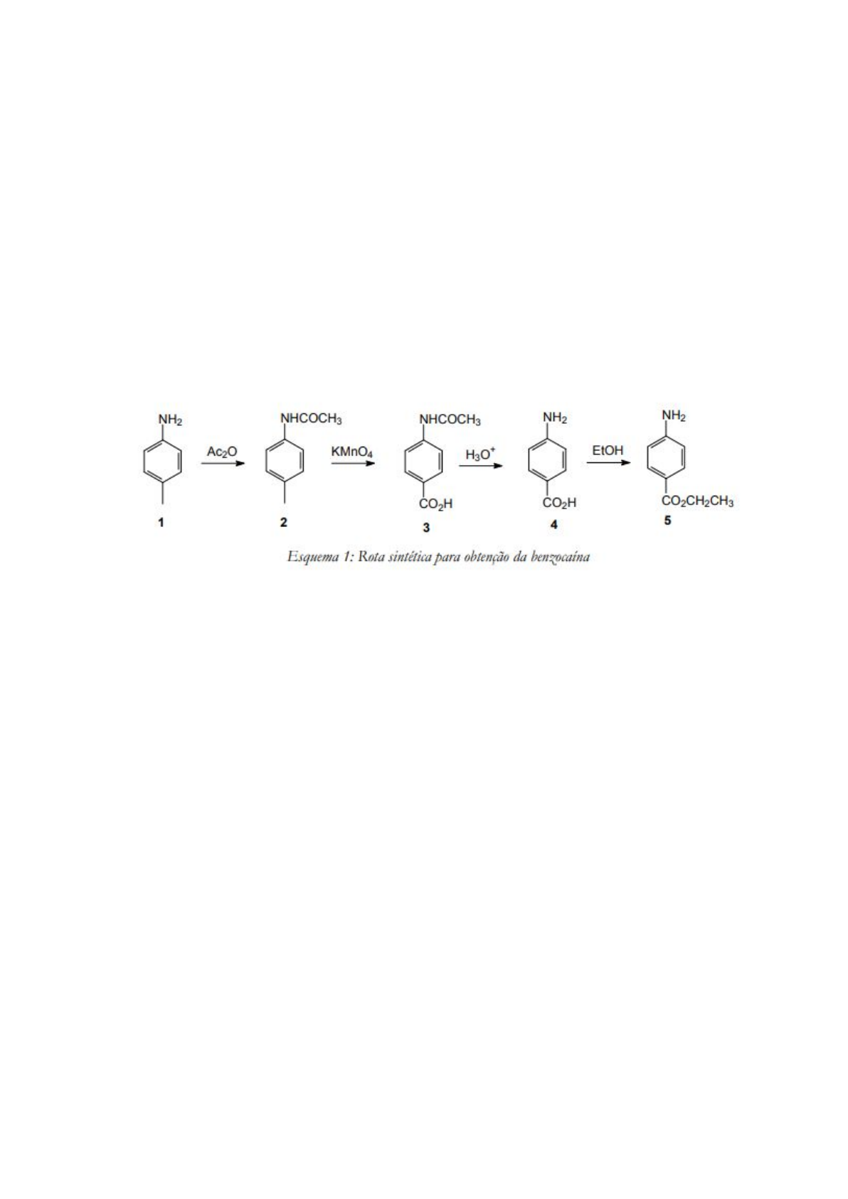 Rota sintética da Benzocaína Neste experimento será preparada a benzocaína (5) a partir da esterificação do ácido p-aminobenzóico (PABA, 4) com etanol e catálise ácida. Embora o PABA seja disponível comercialmente, ele pode ser eficientemente preparado em laboratório. O PABA será preparado através de uma seqüência de três reações, sendo a primeira delas uma acetilação da p-toluidina (1) pelo anidrido acético, fornecendo a N-acetil-p-toluidina (2). A acetilação do grupo amino em 2 tem a função de protegê-lo durante a segunda etapa: a oxidação do grupo metila pelo permanganato de potássio, formando o ácido p-acetamidobenzóico (3). Se a oxidação do grupo metila fosse executada sem a proteção do grupo amino, este também seria oxidado. O grupo acetil em 3 será removido através de tratamento com ácido clorídrico aquoso, gerando o PABA como um sólido cristalino.