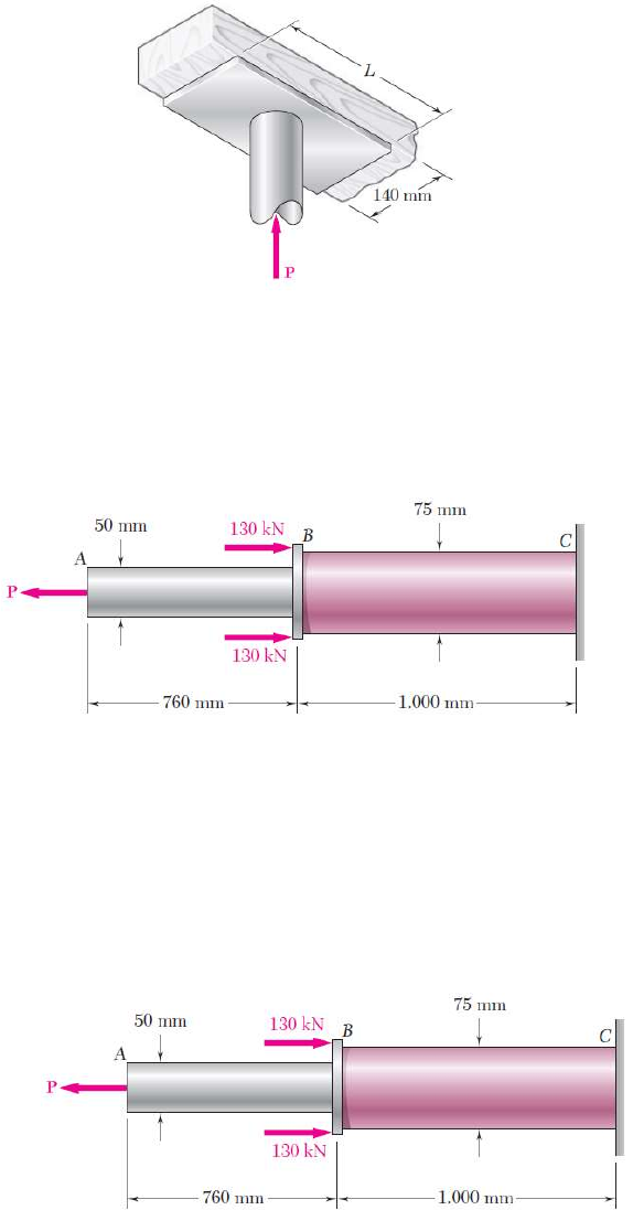 MECÂNICA E RESISTÊNCIA DOS MATERIAIS Lista de Exercícios 11: Resistências dos Materiais: Tensão Normal e Cisalhante Profª Fernanda Valim 1. A força axial na coluna que suporta a viga de madeira mostrada na figura é P=75 kN. Determine o menor comprimento L admissível para a chapa de contato para que a tensão normal na madeira não exceda 3,0 Mpa. 2. Duas barras cilíndricas de seção transversal cheia AB e BC são soldadas uma à outra em B e submetidas a um carregamento conforme mostra a figura. Determine a intensidade da força P para a qual a tensão normal de tração na barra AB é duas vezes a intensidade da tensão de compressão da barra BC. 3. Conforme a figura a seguir, sabendo que P = 177,9 kN, determine a tensão normal média no ponto médio da a) barra AB b) barra BC 4. Na estrutura de aço mostrada na figura é utilizado um pino de 6 mm de diâmetro em C e são utilizados pinos de 10 mm de diâmetro em B e D. O limite da tensão de cisalhamento é 150 MPa em todas as conexões, e o limite da tensão normal é 400 MPa na barra BD. Sabendo que se deseja um coeficiente de segurança de 3,0, determine a maior carga P que pode ser aplicada em A. Note que a barra BD não é reforçada ao redor dos furos dos pinos. 5. Resolva o problema anterior supondo que a estrutura foi reprojetada para utilizar pinos com diâmetro de 12 mm em B e D e nenhuma outra alteração foi feita. 6. As componentes de madeira A e B devem ser unidas por juntas de madeira compensada que serão totalmente coladas às superfícies em contato. Como parte do projeto da junção, e sabendo que a folga entre as extremidades das componentes deve ser 6 mm, determine o comprimento L mínimo permitido para que a tensão de cisalhamento média na cola não exceda 700 kPa. 7. A carga P aplicada ao pino de aço é distribuída para o suporte de madeira por uma arruela anelar. O diâmetro do pino é de 22 mm e o diâmetro interno da arruela é de 25 mm, sendo este ligeiramente maior que o diâmetro do orifício. Determine o menor diâmetro externo d admissível da arruela, sabendo que a tensão normal axial no pino de aço é de 35 MPa e a tensão média de contato entre a arruela e a madeira não pode exceder 5 MPa. 8. No suporte mostrado na figura, a parte superior do elemento ABC tem 9,5 mm de espessura e as partes inferiores têm 6,4 mm de espessura cada uma. É utilizada resina epóxi para unir as partes superior e inferior em B. O pino em A tem 9,5 mm de diâmetro e o pino usado em C tem 6,4 mm de diâmetro. Determine a) tensão de cisalhamento no pino A, b) a tensão de cisalhamento no pino C, c) a maior tensão normal no elemento ABC, d) a tensão de cisalhamento média nas superfícies coladas em B e) (e) a tensão de esmagamento no elemento em C.