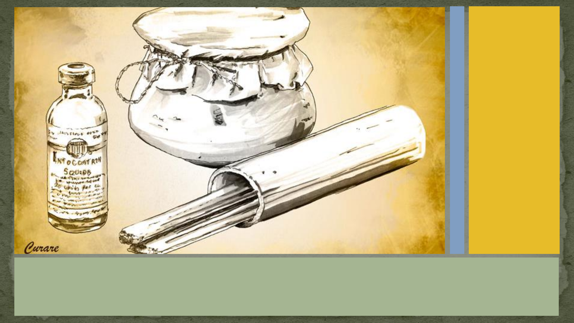 CURARE PROFESSOR JOÃO CARLOS SERAFIMSALVADOR, 2016. Termo genérico usado para descrever vários venenos utilizados nas pontas das flechas dos índios da América do Sul. Vem da palavra urari, que significa veneno, sendo conhecido também com os nomes de curari, ourari, woorari, worali. Seus principais representantes são plantas dos gêneros Strychnos toxifera, Strychnos castelnai , Strychnos crevauxii e Chondrodendron tomentosum. Cissampelos pereirii Aconitum napellus Acokanthera venenata Antiaris toxica Physostigma venenosum Abrus precatorius Vários alcalóides encontrados no curare, tais como a curarina, a tubocurarina e a protocurarina, fazem dele um veneno muito forte. NMe H O Me2N H MeO OH OH OMe O +( ) tubocurarina + https://www.youtube.com/watch?v=HLlgq0koe3s É um potente bloqueador da musculatura estriada, atuando como antagonista competitivo da acetilcolina, pois compete com a Ach pela ligação aos receptores nicotínicos (de Ach) da placa terminal. Assim, ao bloquear os receptores de Ach, esses receptores não sofrem despolarização, e consequentemente não se abrirão para a entrada de íons sódio para o interior da fibra, que iriam desencadear numa alteração local da membrana da fibra muscular, chamado potencial da placa motora, que por sua vez, desencadearia um potencial de ação na membrana muscular, gerando a contração do músculo.