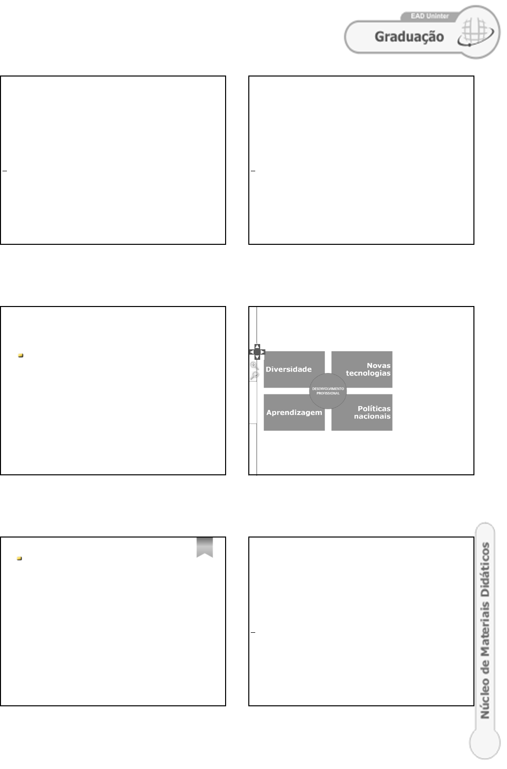 1 Aula 1 35 Prof. Janice Mendes da Silva 6 Administração Pedagógica: Instrumentos Legais 2 35 A Escola como Lócus de Formação Docente – O papel da Gestão Escolar O que de fato mudou no processo de formação continuada nos últimos anos? Tardif, Lessard e Lahaye (1991), os saberes docentes são essencialmente heterogêneos porque constituem o resultado de vários saberes: o profissional, o disciplinar, o do currículo e o da experiência 6 35 Como acontece a formação docente? 2 Processo permanente de aperfeiçoamento dos saberes necessários à atividade profissional, realizado após a formação inicial, com o objetivo de assegurar um ensino de melhor qualidade aos educandos O professor constrói seus esquemas de ação que, mesmo implícitos, são os responsáveis pelo seu fazer, na rotina ou nas improvisações diante da diversidade de problemas inerentes ao espaço pedagógico de “microdecisões” como é o da sala de aula (Perrenoud, 1993) Escola é o lugar que mais colabora para aprendizagem do professor Ela constitui o espaço real de construção da sua identidade profissional 10 35 Gestão Escolar como Mediadora da Formação Contínua de Docentes Superar a perspectiva da reciclagem, entendida como complementação ou atualização da formação inicial, mas numa visão contextualizada do processo de formação profissional (...) (...) e da construção da identidade docente, em um processo inacabado e permanente de elaboração e reelaboração 3 Candau (1997) apresenta três aspectos fundamentais para o processo de formação continuada de professores: 1)a escola, como locus privilegiado de formação 2)a valorização do saber docente 3)o ciclo de vida dos professores Isto significa que a formação continuada precisa: primeiro, partir das necessidades reais do cotidiano escolar do professor depois, valorizar o saber docente, ou seja, o saber curricular e/ou disciplinar, mais o saber da experiência por fim, valorizar e resgatar o saber docente construído na prática pedagógica (teoria + prática) 16 35 Formação Continuada e prática pedagógica Diretamente ligada ao papel do professor: as possibilidades de transformação de suas práticas pedagógicas e nas possíveis mudanças do contexto escolar 4 Transformação prática – ir além das atualizações científicas, didáticas ou pedagógicas do trabalho docente, supõe uma prática cujo alicerce é balizado na teoria e na reflexão 20 35 Situações de conflito – como conduzir? Se posicionar a favor da situação que esteja de acordo com o projeto Político Pedagógico da escola, uma vez que seu compromisso é com o cumprimento dos objetivos da escola É necessário evitar uma postura moralista no trato com este professor Conhecer a história do profissional, do grupo e da instituição Fazer a análise crítica da realidade escolar e das ações dos educadores, para identificar as contradições presentes e trabalhá-las para ajudar na tomada de consciência e na busca da superação Ações importantes Colocar os professores em contato com práticas pedagógicas que estão dando certo no meio educacional 5 A leitura de textos com os professores como uma das estratégias, pois fortalece teoricamente professores e supervisores, mas não a única O acompanhamento da aula do professor Fortalecer os professores que estão abertos à mudança e ao trabalho coletivo Reduzir o burocrático ao mínimo 27 35 Perfil de Liderança e a Gestão Participativa O diretor autocrático - se coloca no centro das decisões O democrático é ciente de sua responsabilidade pela escola, mas da oportunidade de expressão, valorizando a participação de todos na tomada de decisões O diretor laissez- faire é aquele que deixa o grupo à vontade, para decidir por sua própria conta os assuntos de seu interesse. (DIAS, apud, MENESES, 1998) Perfil do Diretor Capacidade de liderar Habilidoso comunicador Foco na aprendizagem Acompanhar os resultados das avaliações 6 Socializar as informações e conhecimentos Espaços para diálogos 32 35 Mensagem Ninguém nega o valor da educação e que um bom professor é imprescindível Mas, ainda que desejem bons professores para seus filhos, poucos pais desejam que seus filhos sejam professores Isso nos mostra o reconhecimento que o trabalho de educar é duro, difícil e necessário, mas que permitimos que esses profissionais continuem sendo desvalorizados Apesar de mal remunerados, com baixo prestígio social e responsabilizados pelo fracasso da educação, grande parte resiste e continua apaixonada pelo seu trabalho. (Mensagem: Paulo Freire)