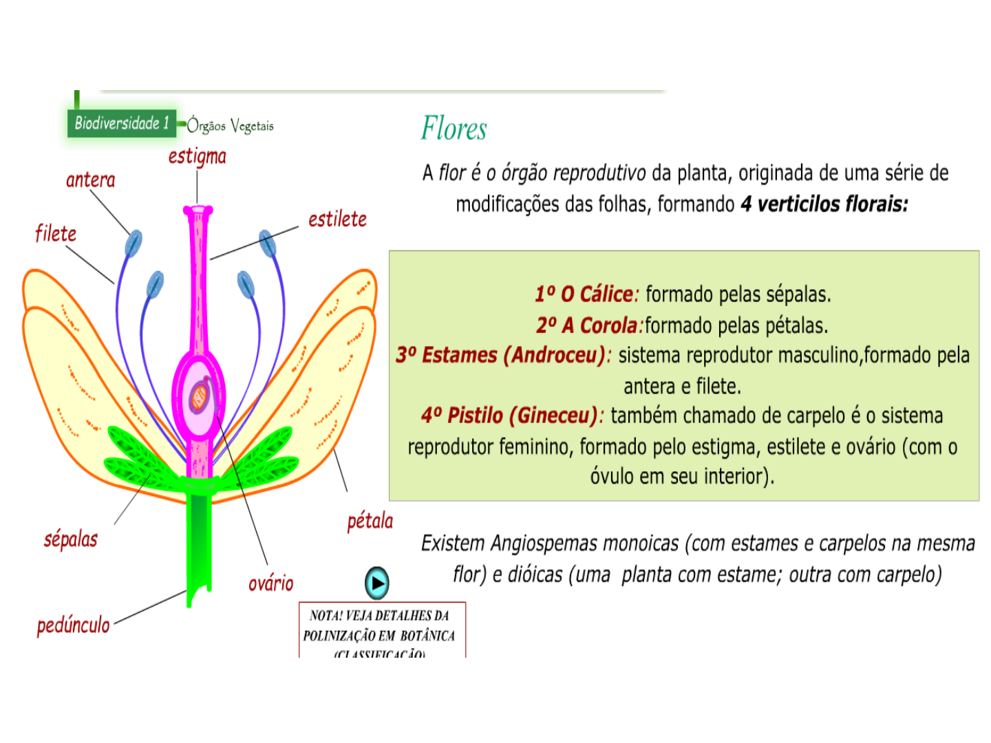 Fruto O fruto é o resultado do amadurecimento do ovário, garantindo a proteção e auxiliando a dispersão das sementes surgidas após a fecundação. Ocorre exclusivamente nas Angiospermas No sentido morfológico, não apenas aquelas estruturas conhecidas como "frutas" (maçã, laranja, etc.), mas também as conhecidas como "legumes"(feijão, ervilha, etc.) e "cereais"(arroz, milho, etc.) são frutos Formação do Fruto A partir da fecundação, inicia-se o desenvolvimento da semente, através de uma série de transformações no saco embrionário e outros tecidos do óvulo. A parede do ovário desenvolve-se em PERICARPO, o qual é formado por 3 camadas : epicarpo, mesocarpo e endocarpo. Alguns frutos, como a banana e o abacaxi podem formar-se sem fecundação prévia e portanto, nesse caso, não possuem sementes. São chamados frutos PARTENOCÁRPICOS. Classificação Fruto Simples Derivados de um único ovário de uma flor. Podem ser secos ou carnosos, deiscentes ou indeiscentes. Frutos Simples Carnosos Frutos simples carnosos: possuem pericarpo suculento. Existem dois tipos: Baga: uma ou mais sementes livres. Exs.: tomate, uva, laranja, abóbora. Drupa: uma só semente, concrescida com o endocarpo. Exs.: ameixa, azeitona, pêssego. Frutos simples secos: possuem pericarpo seco. Deiscentes: abrem na maturidade Indeiscentes: Não abrem na maturidade Pseudofrutos São frutos provenientes de receptáculos florais. Recebem hormônios dos embriões. Dilatam-se e formam frutos como caju e maçã. Sicônio Inflorescência que se fecha após a fecundação , deixando o receptáculo suculento. Frutos internos.
