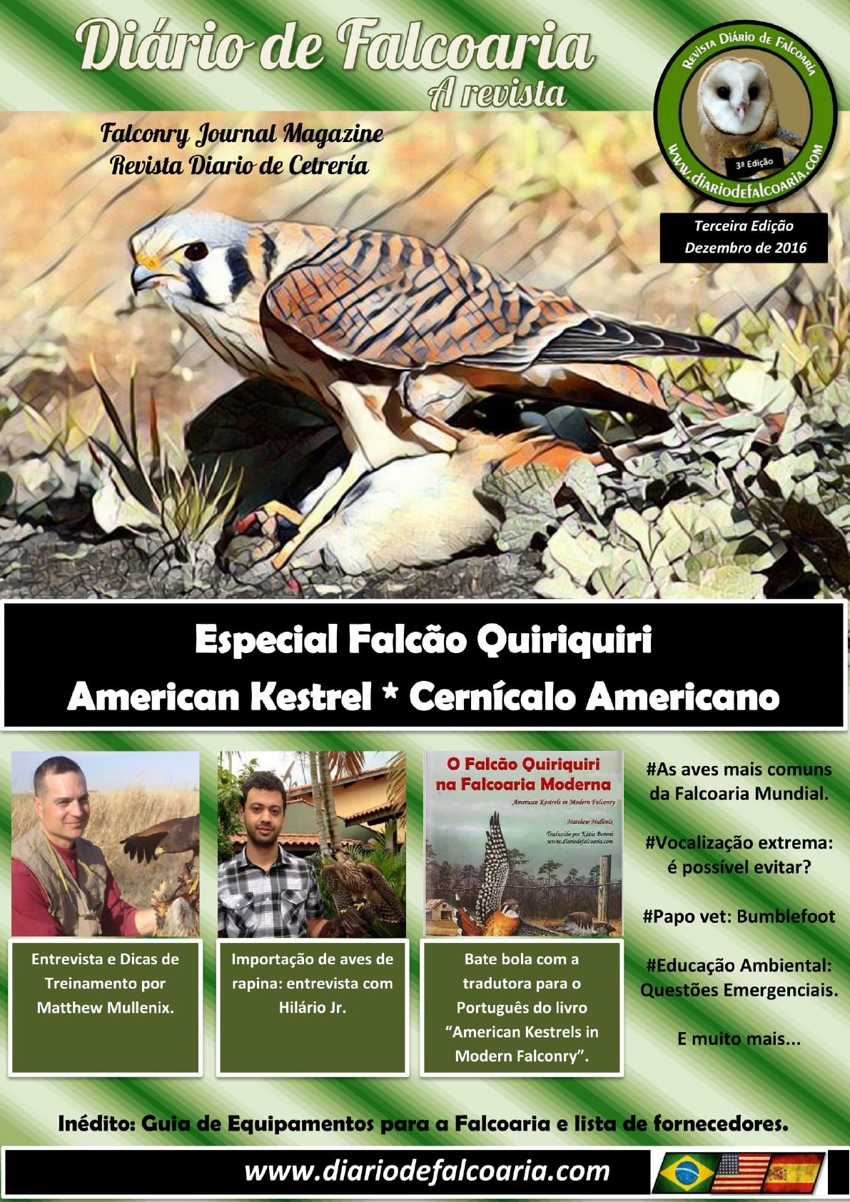 www.diariodefalcoaria.com * Dezembro de 2016 1 www.diariodefalcoaria.com * Dezembro de 2016 2 Editorial p.3 Quem sou eu – Who am I – Quién soy yo p.8 Quiriquiris, uma escolha adequada para os iniciantes? p.9 Por dentro das espécies: Falcão Quiri quiri p.14 Entrevista / Interview Matthew Mullenix p.23 Bate papo com a tradutora do livro “O Falcão quiriquiri na Falcoaria Moderna“ de Matthew Mullenix Charla con la traductora del libro de Matthew Mullenix Chat with the translator of Matthew Mullenix´s book. p.32 Dicas de treinamento por Matthew Mullenix Training tips * Guia de entrenamiento p.35 História de uma ave: Amarití p.38 Hilário Jr.: Importação de aves de Rapina Interview about importation of Birds of Prey Entrevista acerca de la importación de aves de presa. p.41 As aves mais comuns na Falcoaria Mundial p.52 Vocalização extrema: é possível evitar? p.57 Educação Ambiental: Questões emergenciais p.63 Papo vet – bulblefoot , por Dr. Rafael Nudelman p.66 Corujando por aí p.69 Parceiros - Partners p.70 Guia de Equipamentos para a Falcoaria p.74 Contato – Contact - Contacto p.78 Índice - Contents www.diariodefalcoaria.com * Dezembro de 2016 3 3ª Edição: Os falcões quiriquiris Celebrando um ano de conquistas e crescimento O site Diário de Falcoaria completou um ano em Novembro de 2016, e neste seu primeiro ano de vida ele evoluiu muito. O site está mais bonito e organizado, e cada vez mais profissional, em grande parte devido ao aprendizado do meu MBA em jornalismo digital, curso que comecei neste ano exatamente por causa dele. Além de um novo logo, agora com a foto da Sophia, o site ganhou vários apoiadores. Foi um ano de conquistas, primeiro com o lançamento da Revista Digital Diário de Falcoaria, que une conteúdo do site e conteúdo inédito em três idiomas. Mas o mais incrível foi ter traduzido o livro de Matthew Mullenix “American Kestrels in Modern Falconry” para o português, com a autorização do autor. É claro que as entrevistas não poderiam faltar, e vários falcoeiros e educadores ambientais nacionais e internacionais foram entrevistados. Além disso, o projeto de Educação Ambiental do Diário de Falcoaria, chamado Corujando por aí, ganhou blog próprio para poder abordar este tema tão importante na atualidade. E a forma de comemorar este ano de sucesso é lançando a terceira edição da Revista Diário de Falcoaria, que é dedicada ao falcão quiriquiri em homenagem a tradução do livro sobre esta espécie. Começamos com um texto de Matthew Mullenix se esta espécie seria a mais adequada aos iniciantes na Falcoaria, e depois uma ficha completa sobre eles. Depois temos a entrevista exclusiva dada por Matthew Mullenix para o site Diário de Falcoaria, assim como dicas de treinamento. E para fechar a parte dedicada ao falco sparverius, temos a História de uma ave: Amarití, onde Marcos Faustino nos conta como foi o início do treinamento de sua primeira ave, uma fêmea de falcão quiriquiri. E há muito mais! Para quem quer uma ave europeia e achava que não era possível, temos a entrevista com o Falcoeiro Brasileiro Hilário Jr., que já realizou muitas importações de aves de rapinas da Europa para o Brasil. Na reportagem especial Vocalização extrema: é possível evitar, veremos a opinião de vários especialistas sobre como evitar o temido imprint alimentar e com isso a vocalização constante. No Papo vet, o médico veterinário Rafael Nudelman fala sobre a temida bumblefoot ou pododermatite, que é facilmente evitada porém de complicado tratamento. 3ª Edição: Os falcões quiriquiris Celebrando um ano de conquistas e crescimento www.diariodefalcoaria.com * Dezembro de 2016 4 Na Educação Ambiental vamos saber quais são os maiores riscos para as aves de rapina atualmente. E o conteúdo inédito da revista é O Guia de Equipamentos para a Falcoaria, onde há uma lista dos itens indispensáveis para um futuro proprietário de uma ave de rapina, assim como uma lista de fornecedores. Eu só tenho a agradecer a todos os meus leitores, seguidores, amigos, apoiadores e colaboradores que participaram do site e que me apoiam tanto. Eu fico imensamente feliz com o feedback que sempre recebo de vocês, e podem ter certeza que o site não apenas continuará em 2017, como trará muitas novidades! Obrigada, obrigada, obrigada! Um grande abraço, Kátia Boroni. www.diariodefalcoaria.com * Dezembro de 2016 5 The Falconry Journal website completed a year in November 2016, and in its first year of life it has evolved a lot. The site is more beautiful and organized, and more and more professional, largely due to my MBA studies in Digital Journalism, a course that I started this year exactly because of my site. In addition to a new logo, now with Sophia´s photo, the site has won several supporters. It was a year of achievements, first with the launch of the Falconry Journal Digital Magazine, which unites content of the site and unpublished content in three languages. But the most incredible thing was to have translated Matthew Mullenix´s book "American Kestrels in Modern Falconry" into Portuguese, with the author's permission. Of course there were a lot of interviews with falconers and Environmental educators from Brazil and abroad. In addition, the environmental education project of the site Falconry Journal called Corujando por aí (Owldering around) has now its own blog, where I can write about this so important theme. And the way to celebrate this year of success is launching a new edition, the third one of the Falconry Journal Magazine, which is dedicated to the American Kestrel, in honor of translated book on this species. We begin with a text by Matthew Mullenix if this species would be the most suitable for beginners in Falconry, and then a complete guide about the Kestrels. Then we have the exclusive interview given by Matthew Mullenix to the Falconry Journal website, as well as training tips. And to finish the part d