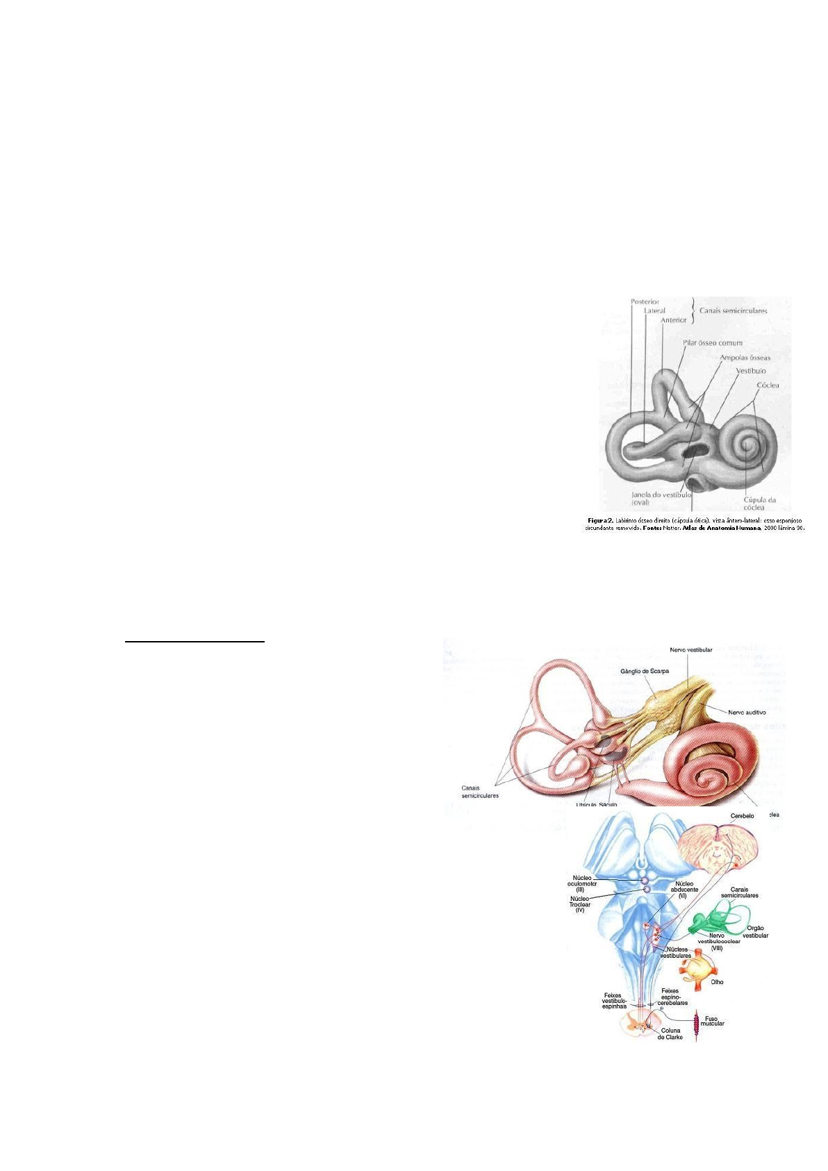 ANATOMOFISIOLOGIA DO SISTEMA VESTIBULAR O equilíbrio corporal é uma função reflexa. Para que ele funcione, dependemos do trabalho conjunto de alguns sistemas. São eles: vestibular, visual e proprioceptivo. As informações sensoriais enviadas por estes sistemas serão integrados nos núcleos vestibulares no tronco encefálico, sempre sob a coordenação do cerebelo. O sistema vestibular mantém sua conexão com olhos por meio do reflexo vestíbulo ocular > RVO Olhos > reflexo vestíbulo ocular > visão clara durante movimento Com o tronco e os membros a conexão ocorre por meio do reflexo vestíbulo espinal > RVE Tronco e os membros > reflexo vestíbulo espinal > estabilidade da cabeça e do corpo O monitoramento destes reflexos é feito pelo sistema nervoso central. - Aferência sensorial: vestibular/visual/proprioceptivo - Eferência motora: postura corporal e ocular - Integração: Tronco encefálico. SISTEMA VESTIBULAR O Sistema Vestibular Periférico e Central tem a função de: • Transformar as forças provocadas pela aceleração da cabeça e da gravidade em um sinal biológico (Potencial de Ação) • Informar o SNC sobre a velocidade da cabeça e sua posição no espaço • Iniciar reflexos necessários para a estabilização do olhar, da cabeça e do corpo SISTEMA VESTIBULAR PERIFÉRICO (Anterior: Canais semicirculares e Posterior: Cóclea) Labirinto Posterior: • Cristas Ampulares (Ductos semicirculares) • Máculas (Utrículo/Sáculo) • Fibras nervosas aferentes e eferentes • Gânglio de Scarpa • Nervo vestibular Superior e Inferior SISTEMA VESTIBULAR CENTRAL Núcleos Vestibulares (IV ventrículo do TE) Vias Ascendentes Vias Descendentes Inter-relações com a formação reticular e outras áreas do SNC LABIRINTO MEMBRANOSO É um sistema de vesículas e ductos preenchidos pela endolinfa. Endolinfa: rica em potássio, pobre em sódio (= líquido intracelular) . Está contido pelo espaço perilinfático, dentro do labirinto ósseo. Mecanorreceptores - Células ciliadas • Órgão de Corti • Máculas (sáculo/utrículo ) • Cristas Ampulares (ductos semicirculares) A disposição das máculas (sáculo e do utrículo) permite a detecção de variações de aceleração linear horizontal e vertical e também ser sensível à gravidade. Tanto a mácula do utrículo, quanto do sáculo, são formadas por células ciliadas. Essas células estão mergulhadas em uma cúpula gelatinosa sobre a qual se encontram cristais de carbonato de cálcio, conhecidos como estatocônias (otólitos). A função dos estatocônias é fazer pressão sobre os cílios das células ciliadas RECEPTORES SENSORIAIS MACULAS Mácula – estrutura receptora: formada pelas células ciliadas, células de sustentação e pela membrana otolítica Massa gelatinosa: contém cristais de cálcio (Otólitos), formando a membrana otolítica MACULA SACULAR • Fica em posição oblíqua quando a cabeça está ereta • Os otólitos ficam lateralizados em relação aos cílios • Podem detectar movimentos para frente ou para trás e para cima e para baixo (PLANO VERTICAL) MACULA UTRICULAR • Fica horizontalizada quando a cabeça está ereta • Os otólitos ficam dispostos sobre os cílios • Fazem a detecção de movimentos para frente ou para trás e de um lado para o outro (PLANO HORIZONTAL) • É sensível à gravidade, à força centrífuga e à aceleração linear – movem os EC em relação aos CC CANAIS SEMICIRCULARES O canal semicircular lateral direito trabalha em cooperação com o canal semicircular lateral esquerdo. O canal semicircular anterior direito faz par sinérgico com o canal semicircular posterior esquerdo. E o canal semicircular posterior direito funciona em associação com o canal semicircular anterior esquerdo. Em cada um dos pares sinérgicos, passa um plano espacial. O ducto semicircular do lado para o qual se faz a movimentação é sempre ativado; o outro lado é inibido CANAIS SEMICIRCULARES (CSC) posterior e anterior = Canais verticais São sensíveis à movimentação da cabeça para cima ou para baixo ➢ abaixar a cabeça: DUCTO SEMICIRCULAR Anteriores - ativação DSC Posteriores - inibição ➢ levantar a cabeça: DUCTO SEMICIRCULAR (DSC) Posteriores - ativação DSC Anteriores - inibição CANAIS SEMICIRCULARES (CSC) lateral = Canais laterais São sensíveis à movimentação da cabeça para os lados Na porção terminal de cada canal semicircular há uma dilatação. Essa dilatação se denomina ampola. Dentro de cada ampola encontra-se o órgão sensorial, chamado de crista ampular, composto por vários estereocilios e um cinocilios, responsáveis pela captação das variações de aceleração angular (movimentos de rotação da cabeça). As células são recobertas por uma massa gelatinosa > cúpula da crista ampular. Movimentos da cabeça ➢ sentido angular ou tangencial ➢ movimentos dos canais semicirculares ➢ movimentos das cristas ampulares ➢ despolarização e hiperpolarização de células ➢ nervo vestibular ➢ sistema nervoso central que provoca equilíbrio corporal Nos CSC laterais > cinocílio próximo ao utrículo Corrente endolinfática com deslocamento em direção à ampola, provocando deflexão da cúpula em direção ao utrículo > corrente ampulípeta (esterocilios vão em cireção ao cinocilio - despolarização/ excitação) Corrente endolinfática com direção ao sentido contrário da ampola, a cúpula deflete em direção oposto ao utrículo, ou seja, em direção do canal semicircular > corrente ampulífuga (cinocilios vão em direção ao esterocilios - hiperpolarização/inibição) Nos CSC anterior e posterior > cinocílio está próximo ao canal e não ao utrículo Corrente ampulipeta: CC em direção ao esterocilios (inibição/hiperpolarização) Corrente ampulifuga: Esterocilios em direção ao CC (excitação/despolarização) A despolarização causa aumento na secreção de neurotransmissores excitatórios e a hipe