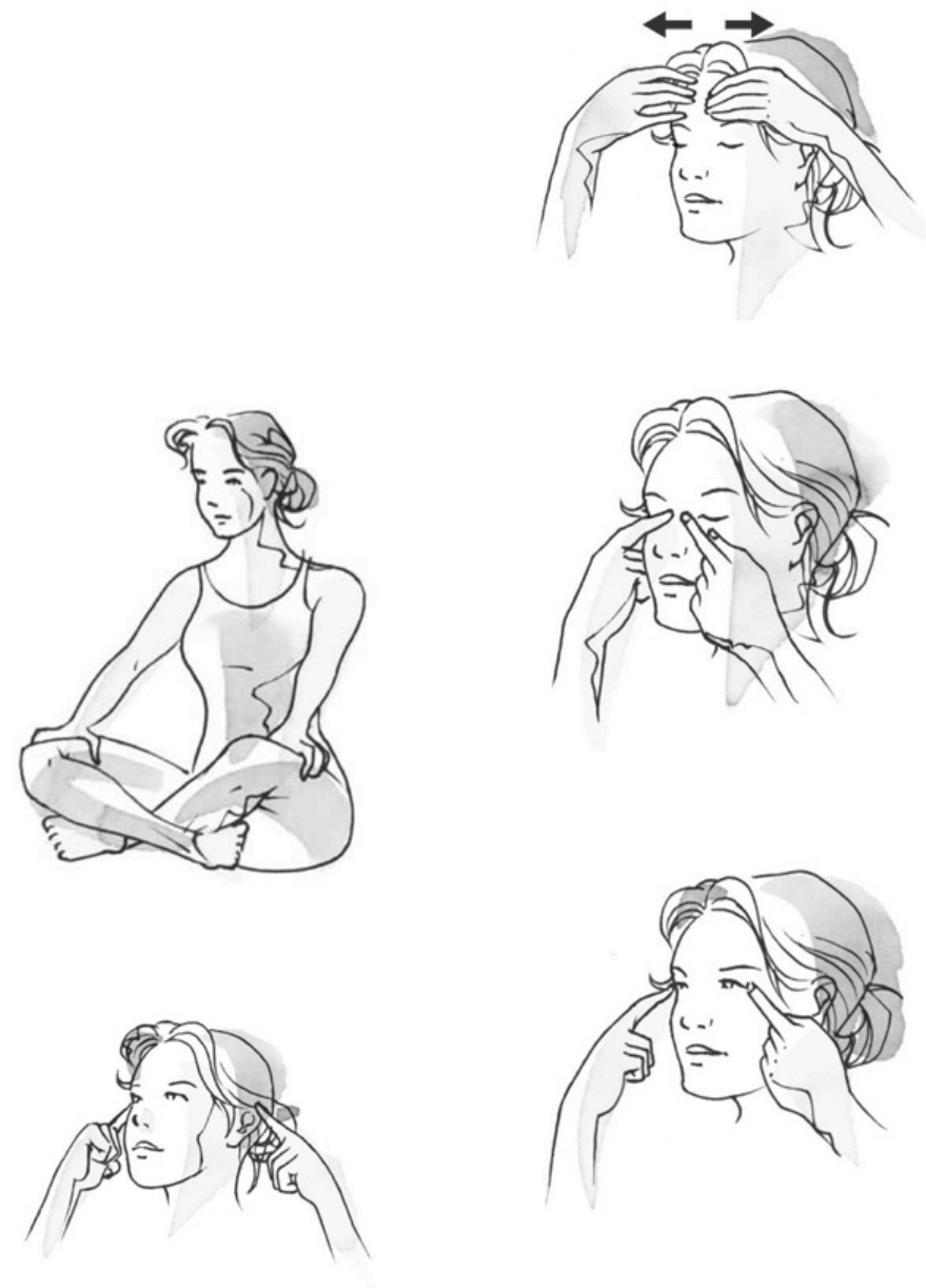 Seqüência completa de automassagem Os exercícios descritos a seguir foram inspirados no livro Curso de Massagem Oriental, de Armando S. B. Austregésilo e podem ser feitos em casa, de manhã ou à tardinha. Para quem está cansado, a intensidade da massagem deve ser leve, com pressões e palmadas superficiais. Já quem anda sedentário e tem se alimentado em excesso se beneficiará com uma pressão mais forte. 1. Sente-se confortavelmente, com as costas eretas. Respire calmamente procurando focar sua atenção em si mesmo. Esfregue as mãos e toque o rosto massageando a mandíbula. 2. Com os dedos indicadores, acompanhe o desenho interno das orelhas, tampando os ouvidos no final (por cerca de 10 segundos). 3. Deslize os oito dedos (exceto os polegares) pela testa, quatro de cada lado finalizando o movimento com uma fricção circular na região das têmporas 4. Pressione o canto interno dos olhos. 5. Em seguida, pressione o canto externo da órbita ocular. 6. Faça a mesma pressão no ponto entre as sobrancelhas. 7. Agora, pressione os cantos externos das sobrancelhas. Para terminar o movimento, feche os olhos e massageie suavemente os globos oculares, exercendo uma pressão leve sobre as pálpebras. 8. Deslize as mãos pelas laterais do nariz saindo pela maçã do rosto. 9. No topo da cabeça, com a polpa dos dedos, friccione o couro cabeludo. 10. Como se estivesse tocando piano, dê pequenas batidinhas com as pontas dos dedos no couro cabeludo. 11. Use os polegares para pressionar os pontos logo abaixo da caixa craniana, acima dos músculos que ladeiam a coluna vertebral 12. Atente para a nuca e ombros: prenda os músculos da nuca como se suas mãos fossem duas pinças descendo da cabeça para baixo e para os lados até chegar aos ombros. 13. Com a mão direita, pince o ombro esquerdo enquanto gira o ombro 360 graus. Repita do outro lado da mesma forma. 14. Para as costas e a coluna: eleve os braços e dobre- os para trás, caminhando com as mãos para baixo (partindo dos ombros) em direção à cintura. 15. Una as mãos às costas, posicionando uma das mãos por baixo e a outra por cima. Flexione o tronco para frente expirando. Repita o exercício trocando a posição das mãos. 16. Para massagear a região sacral, deite de costas e, com as pernas flexionadas, mexa a base da coluna como se fosse um mata-borrão, para cima e para baixo (imagem b), e lateralmente, deitando as pernas até tocar os joelhos no chão (imagem c). Faça o mesmo do outro lado. 17. Ainda deitada, segure os joelhos com as mãos e aproxime-os do tronco, soltando o ar. Observe o toque de cada vértebra da coluna no chão. Isso alonga a região lombar. 18. Com as pernas flexionadas e os pés no chão, eleve e abaixe o quadril lentamente (solte o ar ao elevá-lo). 19. Para alongar a coluna cervical fique deitada, com as pernas esticadas e eleve apenas a cabeça do chão, girando-a lentamente para um lado e para o outro. Solte o ar ao abaixá-la, também suavemente. 20. Flexione novamente as pernas, respire em ritmo calmo e profundo e massageie com a ponta dos dedos toda a extensão abdominal, subindo pela direita, atravessando para a esquerda e descendo. Repita a seqüência três vezes e com a musculatura abdominal relaxada 21. Escolha oito pontos em volta do umbigo, como se fosse traçar duas cruzes, e pressione-os no sentido horário (para intestinos normais ou presos) e no sentido anti-horário (para intestinos soltos). 22. Massageie com a ponta dos dedos os espaços intercostais. 23. Sente-se. Para liberar a tensão dos braços, inicie dando pequenos soquinhos com a mão fechada no braço oposto. Comece a partir do ombro até a mão (que deve estar com a palma para cima). Volte percutindo com a palma da mão para baixo, na face externa do braço até o ombro. Atenção: toque as articulações com cuidado. Termine deslizando e friccionando ligeiramente o braço e o antebraço. 24. As mãos também merecem cuidado especial. Inicie atritando bem as palmas e o dorso das mesmas. 25. Cuide dos dedos, pressionando e massageando cada um deles desde a articulação até a extremidade. 26. Deitada de costas, una as solas dos pés e afaste os joelhos o máximo que conseguir. Relaxe a musculatura pélvica massageando atentamente toda a região (músculos, ossos, tendões) e observando dores e desconfortos. 27. Sentada e, ainda com os pés unidos e joelhos afastados, massageie a curvatura dos pés. 28. Na mesma posição, dê pequenos soquinhos na parte interna da perna e da coxa obedecendo sempre essa direção: dos pés para o quadril. Repita algumas vezes. 29. Junte os joelhos, deixando as pernas flexionadas e os pés no chão e faça a percussão agora pelo lado externo da coxa e da perna, começando de cima para baixo, isto é, do quadril para o pé. Repita algumas vezes. (Toque atentamente os joelhos e os tornozelos). 30. Termine a automassagem caprichando no relaxamento dos pés. Primeiro, com os polegares, massageie bem a sola de um dos pés. Em seguida, dê suaves batidinhas com a mão fechada sobre o calcanhar e, depois, com a palma das mão, deslize por toda a sola. Faça o mesmo no outro pé. 31. Agora trate do dorso dos pés. Com os polegares pressione toda a área, em seguida cuide de cada dedo como você fez com os das mãos e termine deslizando a mão por todo o pé (dorso e sola). Repita o mesmo no outro pé. Pronto! Observe como você está mais relaxada e desfrute o prazer dessa consciência corporal. Seqüência completa de automassagem