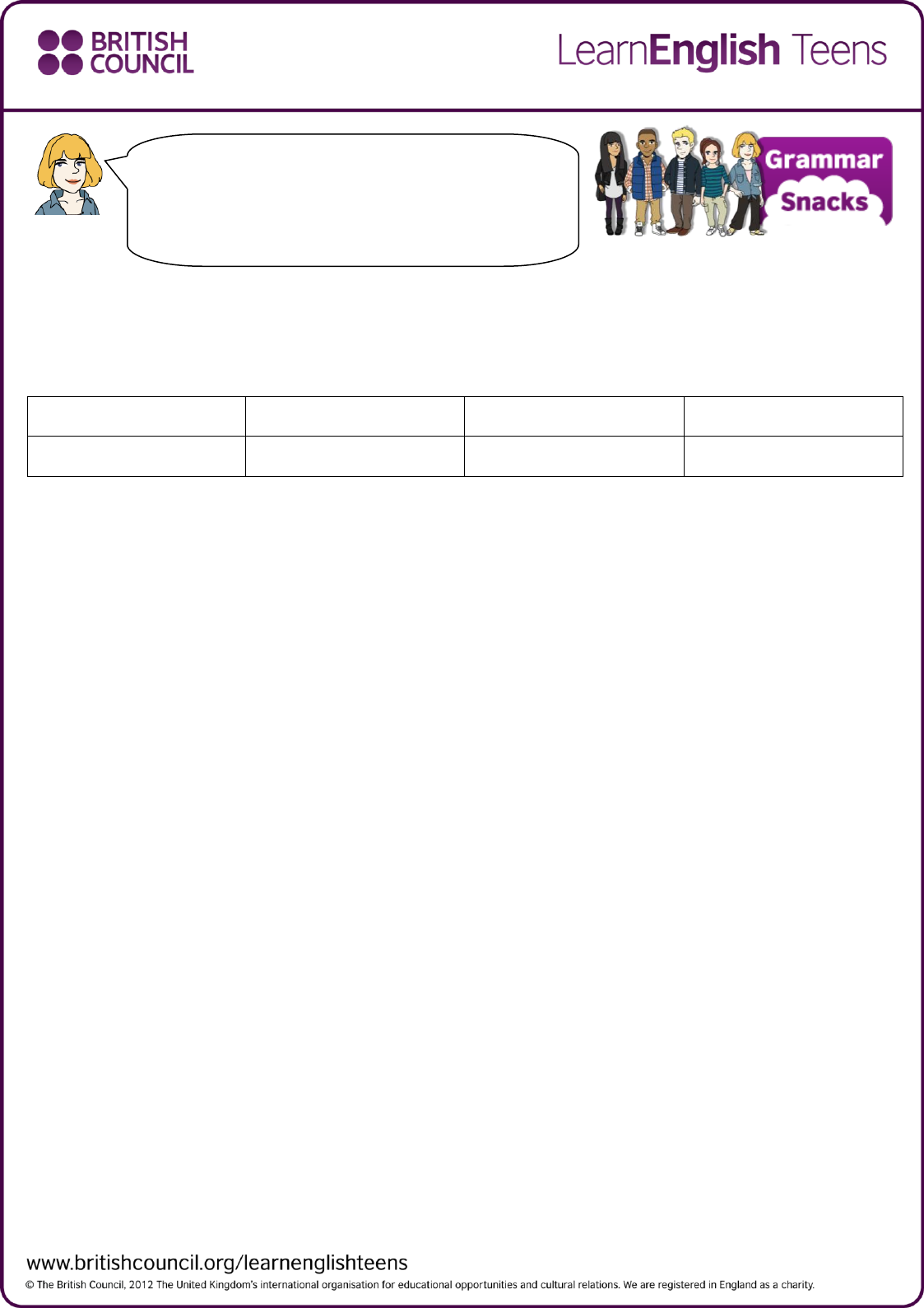 1. Check your grammar: gap fill – question words Complete the gaps with a word from the box. What Where How How often When Why Who whose 1. A: ____________________ are you going on holiday? B: Next Friday 2. A: ____________________ are you going? B: Croatia 3. A: ____________________ bought the tickets? B: My mum did. 4. A: ____________________ do you go on holiday? B: Once every two years. 5. A: ____________________ don’t you go more often? B: Because we don’t want to. 6. A: ____________________ do you do the other years? B: We relax in the garden and visit friends. 7. A: ____________________ do you choose your holiday destination? B: We use the internet. 8. A: And ____________________ idea was it to go to Croatia? B: Our neighbours recommended it. 2. Check your grammar: rewrite sentences – question words Write the questions adding the word in brackets. Don't forget to change capital letters if necessary. 1. What you have for lunch? (did) …………………………………………………………………………………………………. Grammar snacks: Question words - exercises Watch the video and read the conversation between Sophie and Neema. Then do these exercises to check your question words. You can watch the video at: http://bit.ly/10yt68N 2. Where is that letter? (from) …………………………………………………………………………………………………. 3. She always sing in the shower? (does) …………………………………………………………………………………………………. 4. When we go and visit Gran? (can) …………………………………………………………………………………………………. 5. Who bought those boots? (you) …………………………………………………………………………………………………. 6. How do you go to the cinema? (often) …………………………………………………………………………………………………. 7. What did he in Germany? (do) …………………………………………………………………………………………………. 8. You like another piece of cake? (would) …………………………………………………………………………………………………. 9. Who are you going to the party? (with) …………………………………………………………………………………………………. 3. Check your grammar: word 2 word – question words Write the words in the correct order to make sentences. 1. to Who were you ? talking …………………………………………………………………………………….………………….. 2. are at they ? looking What …………………………………………………………………………………….………………….. 3. music ? down the you Could turn …………………………………………………………………………………….………………….. 4. is for What homework the today ? …………………………………………………………………………………….………………….. 5. Who that photo ? took …………………………………………………………………………………….………………….. 6. match time does ? the start What …………………………………………………………………………………….………………….. 7. you How clean often ? do teeth your …………………………………………………………………………………….………………….. 8. penguins bears Why don’t ? polar eat …………………………………………………………………………………….…………………..