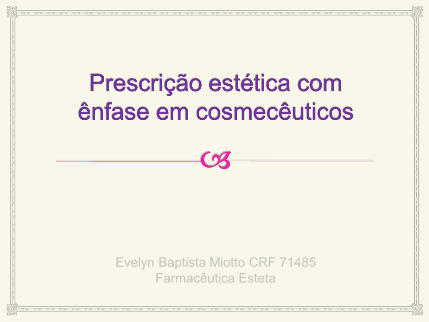 Evelyn Baptista Miotto CRF 71485 Farmacêutica Esteta » Objetivo do Curso: Abordar os principais conceitos da cosmetologia atual e avançada, focando ativos, concentrações e formulações de produtos profissionais e cosmecêuticos, aplicados nas principais afecções estéticas, com aplicabilidade Home Care Profissional. » Conteúdo Abordado: Fisiopatologias Estéticas Faciais (Acne; Envelhecimento; Hipercromias facial; periocular e Rosácea). Introdução » Cosméticos: São produtos industriazializados que atuam na camada mais superficial da pele, sem alterar a estrutura da pele. Exs: (esmalte, maquiagem, shampoo). A sua função é temporária. » Cosmecêuticos: Termo não reconhecido pela Anvisa nem pelos órgãos regulatórios de produtos cosméticos e farmacêuticos internacionais. Atuam como produtos mais funcionais, tratando de forma específica a afecção estética relatada pelo cliente. A indicação e ou prescrição estética reforça a utilização das substâncias existentes com dose adequada e com boa orientação gerando bons resultados. A OMS informou que a adesão dos pacientes ao tratamento é abaixo de 50%, isso implica na necessidade de nós profissionais desse segmento, saber qual a verdadeira necessidade do nosso cliente, individualizando dessa forma o protocolo sugerido. Para isso sugere-se as Formulações Magistrais Indicação ou Prescrição cosmética Particularidades magistrais A farmácia de manipulação trabalha com produtos naturais (extrato de própolis e sintéticos com patente (exsynutriment) ou sem patente (Thalaspheras de Vitamina C). Toda matéria prima é adquirida mediante a nota fiscal que acompanha um laudo de análise dessa matéria prima de fornecedores legalizados e qualificados que são fiscalizados pela ANVISA. Quando a matéria prima chega na farmácia é obrigatório que se faça testes de controle de qualidade, comparando o laudo do fornecedor com os testes realizados na farmácia, mantendo dessa forma um padrão de qualidade e eficácia dessa matéria prima. Conceitos utilizados na manipulação QSP (quantidade suficiente para): Utiliza-se para finalizar a formulação, indicando qual a quantidade de veículo necessária para que se alcance o volume solicitado pelo prescritor. Exemplo: Talasferas de Vitamina C 5% Serum qsp 30g ãa:(lê-se “aná”) abreviatura latina que significa “de cada”, utilizada para designar uma dose comum de várias substâncias de uma formulação. Exemplo: Ácido ascórbico Vitamina E ãa100mg CoenzimaQ10 Forma farmacêutica: É a apresentação de um medicamento, que pode ser: cápsulas (cap), comprimidos (cp), xaropes, cremes, pomadas, suspensões, óvulos, injetáveis, etc. Como prescrever? » Usar os termos: “preparar, “manipular”, aviar, mandar ou “fazer”; » Em prescrição de cápsulas, terminar usando: “Excipiente qsp 1 cap” ou veiculo qsp; » Ter a preocupação de escolher a base correta como veículo da sua formulação, garantindo assim maior penetrabilidade, eficácia dos ativos, sensorial agradável, respeitando o biótipo cutâneo para atender a necessidade do seu cliente. Bases dermatológicas » CREMES: são emulsões óleo/água ou água/óleo de boa consistência (maior viscosidade); » LOÇÃO: micro emulsões de baixa ou média viscosidade; » GÉIS: redes poliméricas hidratáveis (natrosol, carbopol, aristoflex, sepigel, etc) de boa consistência em geral; » TÔNICOS: soluções vasodilatadoras, refrescantes, rubefacientes e cicatrizantes. São próprias para recuperar a nutrição e regular o pH cutâneo. Finalizam a etapa de limpeza; » SÉRUM OU LEITE: veículo fluido que permite a penetração dos ativos veiculados. Por possuir gel em sua formulação, proporciona toque seco. » BASE ÔMEGA GOLD: A base Ômega Gold é desenvolvida com tecnologia dos Fosfolipídeos de Girassol e da Oliva, que possui propriedades funcionais e sensoriais únicas à pele juntamente com um toque sofisticado; oil-free; refrescante e reconstituição da função de barreira da pele. Estes constituintes facilitam a absorção carreando os ativos com maior eficácia. » BASE HYDRA FRESH: A formulação da Base Hydra Fresh® foi desenvolvida para atender todos os tipos de pele, inclusive peles sensíveis, pois apresenta um conceito petrolato-free, parabeno-free, silicone-free e propilenoglicol-free. É uma base hipoalergênica e não-comedogênica. Prescrição Cosmética na Rosácea CALMALINE Calmaline é um potente calmante, anti-irritante e imunorregulador que reforça as defesas naturais da pele, protegendo-a de qualquer reação indesejada, minimizando os processos inflamatórios e sensibilizantes.(Dosagem recomendada: 3,0 – 6,0% pH de estabilidade: 4,0 – 7,0) Betaglucam Estimula o sistema imune, acelera os processos de cicatrização, reduz o aparecimento de rugas finas, regenera a matriz colágena restaurando a pele. Eficácia no tratamento de queimaduras e na ativação de macrófagos, inibindo o processo inflamatório. Glicirrizinato de potássio Inibe o processo inflamatório e reações alérgicas na pele, potente antioxidante, previne envelhecimento cutâneo. Efeito anti- inflamatório e cicatrizante comprovados. D-pantenol Atua sobre a pele ressecada proporcionando sensorial agradável e hidratante contínuo. ALFA BISABOLOL O Alfa Bisabolol apresenta propriedades anti-inflamatórias, antissépticas, bactericidas, antimicóticas e cicatrizantes, portanto indicado em casos de pequenas lesões cutâneas, inflamações leves e queimaduras. A ação antiinflamatória do alfa-bisabolol é atribuída à inibição da ciclo-oxigenase e lipoxigenase. Dosagem recomendada: 0,1-a 1% É um ativo de alta performance, obtido de extrato marinho, atua como inibidor de metaloproteinases (MMP), enzimas que degradam e destroem a rede de colágeno da pele. A atividade dessas enzimas aumenta com o envelhecimento, em ambientes irritantes e com o estresse, afetando a integridade da matriz