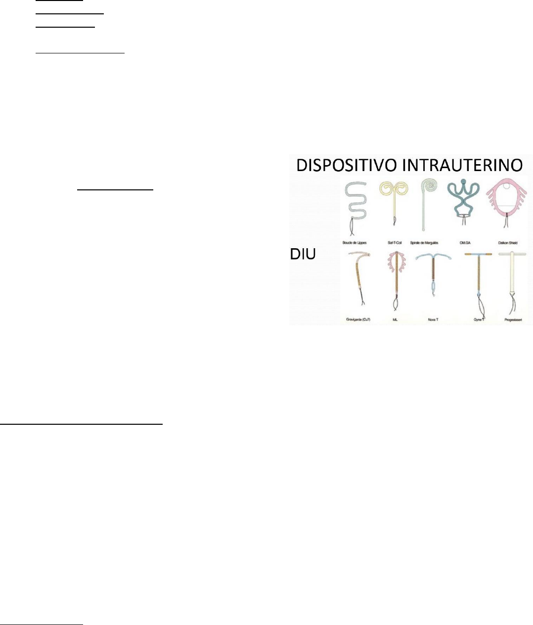 CONTRACEPÇÃO NÃO HORMONAL CLASSIFICAÇÃO Temporários: · Hormonal: DIU com progesterona. · Não hormonal: Dispositivo intra-uterino (DIU) · De barreira: Femininos: Diafragma; Espermicida; Esponja; Capuz cervical; Camisinha feminina. Masculinos: Condon; · Comportamentais: Ogino-Knaus; Curva térmica; Billings; Sintotérmico; Coito extragenital; Definitivos: · Feminino: Laqueadura tubária (vias laparotômica e laparoscópica); · Masculino: vasectomia. DISPOSITIVO INTRAUTERINO – DIU O DIU consiste em um dispositivo que é colocado dentro do útero e é um método extremamente antigo sendo o mais antigo a alça de Lippes – que é um dispositivo plástico que fica enrolado dentro do útero no qual faz uma reação de corpo estranho e essa reação de corpo estranho, essa inflamação causada pela presença do DIU produz a contracepção. Existem outros tipos de DIU. Atualmente, tem o DIU medicado de cobre que é usado o 380, Multiload e o DIU de progesterona. O DIU medicado usado é o Multiload e o T de Cobre. No SUS tem o T de cobre 380 (o 380 é referente aos milímetros de cobre presentes no dispositivo). O DIU é o método contraceptivo não hormonal reversível mais usado mundialmente. TIPOS DE DIU · Inerte: alça de Lippes®; Saf T Coel®; Dalkon Shields® · Medicado: cobre 380 A (fixo, ‘7’, ‘T’, Multiload); Tcu 200; Progesterona MECANISMO DE AÇÃO DO DIU Produzir uma reação de corpo estranho que é hostil a implantação do ovo e é espermicida. O cobre aumenta a eficácia contraceptiva, pois também é espermicida, diminui a capacidade de fertilização do espermatozoide. E a progesterona espessa o muco cervical e induz à atrofia do endométrio, pois diminui os receptores de estrogênio. Então, mesmo que a mulher esteja ovulando normalmente, não tem proliferação endometrial visto que a progesterona está ali sendo liberada paulatinamente. Na prática, a diferença consiste em não haver nenhum hormônio no uso do DIU de cobre. A paciente está com trombose venosa e necessita realizar contracepção: o DIU de cobre é uma alternativa interessante nessa situação e continua a menstruação regular, não há como controlar nem programar o volume menstrual. Se acontece o uso do DIU de progesterona, acontece, aproximadamente, 40% da absorção dessa progesterona. E, além disso, não há menstruação, pois, a progesterona irá atrofiar o endométrio. DIU: INSERÇÃO Geralmente, o DIU é colocado com a paciente menstruada. Por que? Porque na gravidez é contraindicado o uso do DIU, ocasionaria em abortamento. A garantia de que não ocorrerá o abortamento é que a paciente venha menstruada para a inserção do DIU. Além de que, quando há a menstruação, há a diminuição da tonicidade do orifício interno do útero para o sangue cair, causando maior conforto para colocar o DIU. Para colocar o DIU, passa o espéculo, visualiza o colo do útero, lava/limpa a vagina. Depois pinça o colo do útero e é colocado o histerômetro que é uma haste de metal que tem uma ponta romba e é centimetrada. Então coloca isso no canal, bate no fundo do útero e se mede a distância do fundo do útero até o orifício externo e quando for colocar o DIU, insere o dispositivo e corta grande o fio para dobrar lá dentro (cuidado no corte porque como é um fio de nylon pode ficar espetando nas relações sexuais). O DIU ficará dentro do útero fazendo efeito. Se for o DIU de cobre 200, a durabilidade é de 04 anos. O DIU 380, 10 anos. E o DIU de progesterona, 05 anos. Para retirar o DIU, é só puxar o fio que tem no dispositivo que fica no lado de fora do útero. Caso a paciente queira tirar o DIU, é só puxar o fio que o dispositivo sai. · T Cobre 200: 4 anos. · T Cobre 380 A: 10 anos. (Não é justificado usar o T Cobre 200 uma vez que o de 380 tem durabilidade que é mais que o dobro). Em termos de saúde pública, é muito mais conveniente o T Cobre 380 sendo que a mulher tem a contracepção garantida por maior tempo. · Levonorgestrel: 5 anos – é o Mirena DIU: CONTRAINDICAÇÕES ABSOLUTAS MEC=4 Certeza ou suspeita de gravidez; sepse puerperal ou abortamento séptico; mola com β-HCG positivo; tuberculose pélvica/DIP/endocervicite atual; câncer cervical/endométrio: inserção; hemorragia de origem desconhecida; mioma ou malformação com distorção da cavidade; câncer mama atual (LNG) (≥5 anos =3) Se há suspeita ou certeza de gravidez. Qualquer situação em que haja inflamação/infecção pélvica, sepse puerperal, abortamento séptico, endometrite, doença inflamatória pélvica, tuberculose pélvica ou infecção do colo do útero (endocervicite) não se deve colocar DIU, pois irá comportar-se como um corpo estranho, colonizando as bactérias oriundas da infecção que, posteriormente, não será possível as combater com antibióticos mesmos que sistêmico. Então, não será possível tratar a infecção se há a presença do DIU. Primeiro é realizado o tratamento da infecção e depois é colocado o DIU. Mola com β-HCG positivo: Mola é a degeneração neoplásica da placenta. O critério de cura para mola é o β-HCG diminuir mais a cada vez até negativar, se não tem β-HCG negativado não pode inserir o DIU até que se considere aquela mola tratada. Em casos de tuberculose pélvica ou endocervicite (infecção do colo do útero, da endocervice), para chegar na cavidade uterina se faz necessário passar, primeiramente, pelo colo uterino, então as bactérias da endocervice são levadas para a cavidade peritoneal, produzindo uma endometrite, que será instrumental certa vez que o responsável pelo procedimento induzirá tal quadro. Então, antes de colocar o DIU, é necessário examinar a paciente, descartar que esta apresente algum sinal de endocervicite ou endometrite. Caso tenha, faz-se necessário o tratamento para posteriormente colocar o DIU. É necessário examinar a paciente sem que ela esteja no período menstrual, pois, na presen