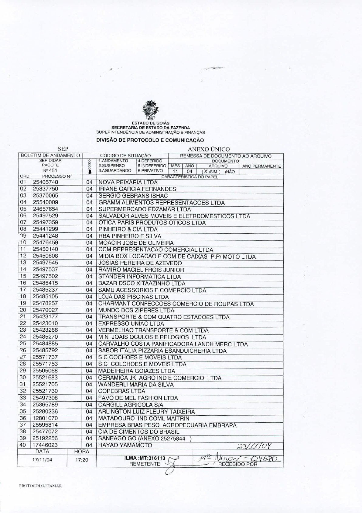 BOLETIM DE ANDAMENTO CODIGOOESITUA AO REMESSADE DOCUMENTOAO AROUIVO