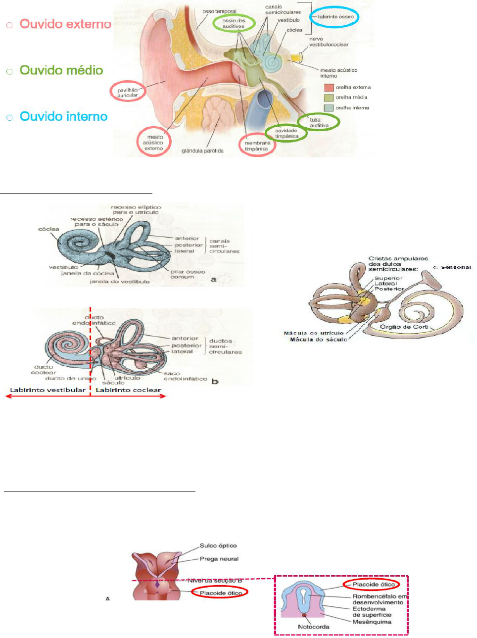 Embriologia Aula 4 – 15/04/2019 Desenvolvimento das Orelhas ANATOMIA DA ORELHA: DESENVOLVIMENTO DA ORELHA INTERNA: Anatomia da orelha interna: A orelha interna é composta pelo labirinto ósseo (vestíbulo, cóclea e canais semicirculares) e pelo labirinto membranoso (sáculo, utrículo, ducto coclear e ductos semicirculares; esse último fica dentro do labirinto ósseo). Ao longo do labirinto membranáceo, tem regiões sensoriais como as máculas, as cristas ampulares e o órgão de corti. Desenvolvimento da orelha interna: a partir da 4ª semana de gestação. Inicia-se com um espessamento do ectoderma superficial em ambos os lados do mielencéfalo chamado de placóide ótico; O tubo neural ainda não se encontra totalmente fechado. O placóide ótico vai se invaginar para dentro do mesênquima formando a fosseta ótica. As bordas da fosseta ótica aproximam-se e fundem-se formando a vesícula ótica, que é um primórdio do labirinto membranoso; A vesícula continua o seu desenvolvimento e perde a conexão com o ectoderma da superfície, ficando solta no mesênquima; O placóide ótico, a fosseta ótica e a vesícula ótica são estruturas originadas do ectoderma superficial. A vesícula ótica se divide, inicialmente, em duas partes: porção utricular e porção sacular: -Porção utricular: utrículo e os ductos semicirculares; -Porção sacular: sáculo e ducto coclear. A partir da vesícula ótica cresce um divertículo que se alonga formando o ducto e o saco endolinfático. Na 6ª semana, surgem discos (evaginações) achatadas da porção utricular da vesícula ótica, que cresce dorsalmente e ventralmente; Essas evaginações / discos se expandem e as porções centrais das suas paredes desaparecem, originando os ductos semicirculares (abertura nos discos); Formam-se dilatações nas extremidades de cada ducto semicircular que são chamadas de ampolas; Na 6ª semana, o sáculo forma uma evaginação tubular em seu polo inferior originando o ducto coclear; O ducto coclear cresce e se espiraliza até o final da 8ª semana, quando completa 2,5 voltas em torno de si mesmo; A conexão do ducto coclear com a porção remanescente do sáculo é chamada de ducto reuniens. O mesênquima que circunda o ducto coclear se diferencia formando a cápsula ótica cartilaginosa; A cápsula ótica cartilaginosa cresce ao redor do ducto coclear e sofre vacuolização (surgem espaços) e forma 2 espaços perilinfáticos (preenchidos por perilinfa) que são a escala vestibular (porção superior) e a escala timpânica (porção inferior). O ducto coclear é separado da escala vestibular pela membrana vestibular e da escala timpânica pela membrana basilar (a partir dela é formado o órgão de corti, região sensorial do ducto coclear); O vértice, que é o eixo da cóclea é chamado de modíolo. Concluindo, o labirinto membranáceo formou-se a partir do mesênquima. Na 9ª semana, o mesênquima que circunda o labirinto membranáceo é substituído por tecido cartilaginoso formando a cápsula ótica cartilaginosa em toda a extensão do labirinto membranáceo; Do 3º ao 5º mês, a cápsula ótica cartilaginosa sofre vacuolização formando o espaço perilinfático; O espaço perilinfático é preenchido por perilinfa, que se comunica com o líquido cérebro-espinal através do ducto perilinfático; Entre a 16ª e a 23ª semana ocorre ossificação do que restou da cápsula ótica cartilaginosa formando as paredes do labirinto ósseo (se forma ao redor de todo o labirinto membranáceo. Ao mesmo tempo da formação da vesícula ótica, as células ganglionares do nervo vestíbulococlear (NC VIII) formam o gânglio estatoacústico / vestíbulococlear na região ventral da vesícula ótica; O gânglio vestíbulococlear se divide em 2 ramos: coclear (ou espiral; inerva o ducto coclear) e vestibular (inerva as cristas e as máculas). As células ciliadas da orelha interna (mecanotransdutores especializadas) surgem de 6 regiões pró-sensoriais (são inervadas pelo gânglio vestíbulococlear) da vesícula ótica: -Ducto coclear: órgão de Corti (1 região); -Sáculo e utrículo: Máculas (2 regiões); -Ductos semicirculares: cristas ampulares (3 regiões). DESENVOLVIMENTO DA ORELHA MÉDIA: Anatomia da orelha média: Desenvolvimento da orelha média: A partir do 1º arco faríngeo surge a primeira bolsa faríngea que origina o recesso tubotimpânico. O recesso tubotimpânico tem 2 partes: -Parte distal: que forma a cavidade timpânica; -Parte proximal: forma a tuba farigotimpânica, que no final origina a tuba auditiva. Os ossículos auditivos estão relacionados com as cartilagens dos arcos faríngeos; A cartilagem do primeiro arco faríngeo (chamada de cartilagem de Meckel) forma o martelo e a bigorna; A cartilagem do segundo arco faríngeo (chamada de cartilagem de Reichert) forma o estribo. Os ossículos permanecem envolvidos no mesênquima até o 8º mês de gestação; No 9º mês de gestação, a cavidade timpânica se expande e envolve os ossículos; O endoderma da cavidade timpânica forma o epitélio dos ossículos. O músculo tensor do tímpano se insere no martelo e foi formado a partir do mesênquima do 1º arco faríngeo e é inervado pelo nervo trigêmeo (NC V); O músculo tensor do estribo (estapédio) se insere no estribo e foi formado a partir do mesênquima do segundo arco faríngeo e é inervado pelo nervo facial (NC VII). DESENVOLVIMENTO DA ORELHA EXTERNA: Anatomia da orelha externa: Desenvolvimento da orelha externa: O meato acústico externo se desenvolve a partir da extremidade dorsal do primeiro sulco faríngeo, que se alonga originando um tubo em forma de funil; As células ectodérmicas do fundo do tubo proliferam-se formando um tampão do meato. No final do período fetal, as células centrais desse tampão se degeneram formando o meato acústico externo propriamente dito; O meato acústico externo é curto ao nascimento e atinge seu comprimento final por volta dos 9 ou 10 an
