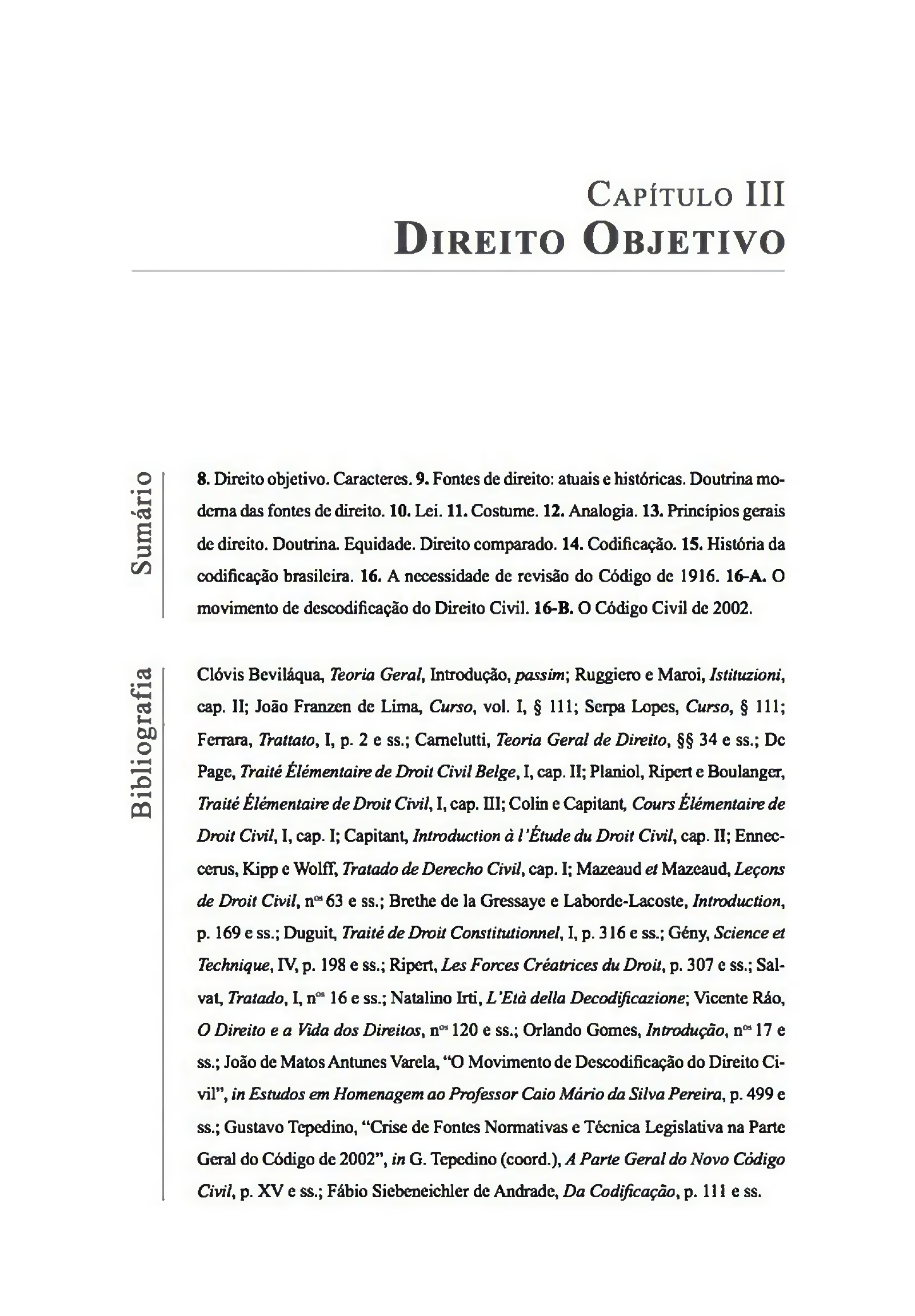 B ib lio gr af ia Su m ár io C a p í t u l o I I I D i r e i t o O b j e t i v o 8. Direito objetivo. Caracteres. 9. Fontes de direito: atuais e históricas. Doutrina mo derna das fontes de direito. 10. Lei. 11. Costume. 12. Analogia. 13. Princípios gerais dc direito. Doutrina. Equidade. Direito comparado. 14. Codificação. 15. História da codificação brasileira. 16. A necessidade dc revisão do Código de 1916. 16-A. O movimento de descodificação do Direito Civil. 16-B. O Código Civil de 2002. Clóvis Beviláqua, Teoria Geral, Introdução, passim ; Ruggicro e Maroi, Istituzioni, cap. II; João Franzen de Lima, Curso, vol. I, § 111; Serpa Lopes, Curso, § 111; Ferrara, Trattato, I, p. 2 e ss.; Camelutti, Teoria Geral de Direito, §§ 34 e ss.; Dc Page, Traité Élémentaire de Droit Civil Belge, I, cap. II; Planiol, Ripert e Boulanger, Traité Élémentaire de Droit Civil, I, cap. III; Colin e Capitant, Cours Élémentaire de Droit Civil, I, cap. I; Capitant, Introduction à l Étude du Droit Civil, cap. II; Enncc- ccrus, Kipp e WolfT, Tratado de Derecho Civil, cap. I; Mazcaud et Mazcaud, Leçons de Droit Civil, nw 63 e ss.; Brethe de la Grcssayc e Labordc-Lacostc, Introduction, p. 169 e ss.; Duguit, Traité de Droit Constitutionnel, I, p. 316 e ss.; Gény, Science et Technique, IV, p. 198 e ss.; Ripert, Les Forces Créatrices du Droit, p. 307 e ss.; Sal- vat, Tratado, I, n°* 16 e ss.; Natalino Irti, L ’Età delia Decodificazione; Vicente Ráo, O Direito e a Vida dos Direitos, n°* 120 e ss.; Orlando Gomes, Introdução, n0817 e ss.; João de Matos Antunes Varela, “O Movimento de Descodificação do Direito Ci vil”, in Estudos em Homenagem ao Professor Caio Mário da Silva Pereira, p. 499 e ss.; Gustavo Tcpedino, “Crise de Fontes Normativas e Técnica Legislativa na Parte Geral do Código de 2002”, in G. Tcpedino (coord.), A Parte Geral do Novo Código Civil, p. XV e ss.; Fábio Siebcneichler de Andrade, Da Codificação, p. 111 e ss. D ir e it o O b je t iv o us est norma agendi. Considerado objetivamente, o direito é nor 8 . D ir e it o o b je t iv o . C a r a c t e r e s ma de comportamento, que se traduz num complexo de regras dis- ciplinadoras da conduta. Não se pode dizer como apareceram elas, origi nariamente, perdidas que se acham na noite dos tempos, pois no momento em que o historiador ou o sociólogo recua as suas pesquisas aos primór dios de qualquer civilização, e situa o fenômeno jurídico na sua gênese, já encontra o agrupamento disciplinado. Mesclado a princípio o elemento jurídico ius ao religioso fas, a norma de conduta envolve ao mesmo tempo o dever para com a divindade e o dever para com o próximo, aquele mais importante, este menos, ambos, porém, definidos e impostos de maneira coativa, revestidos de sanções pesadas e graves. Só com o tempo, e na me dida em que evolve a civilização, é que se discrimina, da confusão origi nária, a regra de conduta dos indivíduos, na sua intercomunicação social. E quando se destaca em toda a sua pureza o ordenamento jurídico, pode situar-se a regra de comportamento, no estabelecimento dos comandos de finidores da convivência. Deixando de lado a indagação de sua origem, focalizamos o direito na sua expressão disciplinadora, afirmando que é simultaneamente uma necessidade imposta pela convivência social, e uma criação desta mesma convivência. Na expressão de Ferrara, é um produto necessário da vida social, como forma de estabelecimento de limitações ao comportamento individual, constituído em favor dos homens, para satisfação dos interes ses humanos.1 Não aparece, porém, sob a forma de conselho ou de regra facultativa, senão como determinação impositiva, pela qual se consegue a obrigatoriedade do preceito. Esta é a expressão da necessidade de um comportamento restritivo da Uberdade do indivíduo como condição de so brevivência do grupo. O decálogo de Moisés diz em forma singela o que o homem deve fazer e o que não deve fazer: “honrar pai e mãe”; “não matar”. A necessidade social do respeito aos pais, ou à vida do próximo, está definida. Mas, permanecesse sob a forma de uma explicação ou de uma exortação, e não se converteria em norma de conduta que pressupõe o imperativo, a determinação, para ordenar ou para proibir. A necessidade de respeitar a integridade física do próximo é uma condição da convivên cia, e a recomendação neste sentido é um preceito, que se converte em 1 Ferrara, Trattato, I, p. 4. I n s t it u iç õ e s d e D ir e it o C iv il • In t r o d u ç ã o a o D ir e it o C iv il norma, quando ditado imperativamente, como na Lei das XII Tábuas: “Si membrum rupsit, ni cum eo pacit, talio esto”.2 A norma é jurídica, consti tui direito objetivo, quando se faz um comando, uma ordem revestida de sanção.3 Cada comando, cada determinação de comportamento constitui uma norma, à sua vez expressiva de um dever de conduta, geradora de uma faculdade individual. O conjunto das normas, o seu complexo, forma o direito objetivo ou ordenamento jurídico. Conforme o tipo de organização estatal, conforme o modo de ela boração, a norma se apresenta, ora sob o aspecto de princípio ditado pelo órgão do Estado, ora sob a modalidade de uma definição judicial de com portamento, ora sob o aspecto de regra observada consuetudinariamente pelos indivíduos dentro do agrupamento social. Sua apresentação externa ou sua morfologia pode variar. Mas para que constitua direito objetivo, há de encontrar, sem embargo da diversificação extrínseca, o conteúdo de legitimidade que a caracterize como expressão da vontade coletiva, a obrigatoriedade que a define como determinação à obediência de todos, e a sanção, sem a qual se desfigura em mero conselho, ou preceito moral, insuscetível de coibir o transgressor e de regular as relações humanas.4 O direito objetivo reveste, pois, formas diversas, e pode ser mais extensa ou 