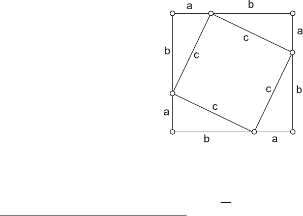 Geometria Básica Bruno Holanda ∗ 12 de novembro de 2011 Resumo Este trabalho representa um conjunto de notas de aulas de um curso inicial em Geometria Euclidiana Plana para alunos do ensino fundamental. A principal tafera dos exerćıcios aqui apresentados é a formação do rigor matemático necessário em problemas de geometria, porém sem grandes aprofundamentos teóricos. Portanto, nos focaremos em três pontos principais: Teorema de Pitágoras, áreas e ângulos. 1 Teorema de Pitágoras O Teorema de Pitágoras é um dos mais antigos e usados teoremas da geometria plana. Também é ele que forma a base da geometria anaĺıtica de Descartes. Apesar de toda a sua fama, muitos estudiosos da História da Matemática afirmam que Pitágoras não foi o verdadeiro autor desse teorema. E que, muito posśıvelmente, os alunos da escola pitagórica sejam os reais autores. Existem muitas provas, a maioria delas usa algum argumento de área. A solução a seguir é uma das mais simples. Figura 1: Teorema de Pitágoras Prova. Na figura 1, temos um quadrado de lado (a + b) particionado em um quadrado de lado c e quatro triângulos retângulos de área a·b 2 . Dáı, por uma equivalência de áreas, temos que ∗Outros materiais como este podem ser encontrados em http://brunolholanda.wordpress.com/ 1 http://brunolholanda.wordpress.com/ (a+ b)2 = c2 + 2ab, ou seja: a2 + b2 = c2. Problema 1. Prove o Teorema de Pitágoras de duas novas maneiras: (a) (George Airy) Mostre como cortar dois quadrados em triângulos e quadriláteros e usar os pedaços para formar um único quadrado maior. (b) (Henry Perigal) Dados dois quadrados, mostre como cortar um deles em quatro partes iguais que, juntas com o outro quadrado, formem um único quadrado maior. Problema 2. Determine x nas seguintes figuras: 6 8 4 x 6 4 3 2 √ 5 x 17 x 9 10 x x 2 √ 13 10 Problema 3. Na figura abaixo ABCD é um quadrado de área 64cm2 e EFGH um quadrado de área 36cm2. Determine a área do quadrado CMHN . A B M E F D C N H G Problema 4. Na figura abaixo os dois ćırculos são têm o mesmo centro e os cinco quadriláteros são quadrados. Se o ćırculo menor tem raio igual a 1cm determine o raio do ćırculo maior. 2 Problema 5. Seja ABCD um quadrado de lado 28. Seja P um ponto no seu interior e E um ponto no lado CD de modo que CD⊥PE e AP = BP = PE. Ache AP . Problema 6. Suponha que ABC seja um triângulo retâgulo escaleno, e P seja o ponto na hi- potenusa AC tal que ∠ABP = 45◦. Dado que AP = 1 e CP = 2, calcule a área do triângulo ABC. Problema 7. Na figura abaixo temos dois ćırculos de raios 3 e 2 e cuja distância centro a centro é 10. Ache o comprimento da tangente comum PQ. P Q Problema 8. (Cone Sul 1989 - adaptado) Na figura abaixo temos dois quadrados, um de lado dois e outro de lado um. Determine o raio do ćırculo que é tangente aos lados do maior e passa pelo vértice do menor. Problema 9. Nos lados AB e DC do retângulo ABCD, os pontos F e E são escolhidos de modo que AFCE seja um losango. Se AB = 16 e BC = 12, ache EF . D A F B C E Problema 10. P é um ponto no interior do retângulo ABCD. Se PA = 2; PB = 3, e PC = 10. Ache PD. Problema 11. (Maio 2006) Um retângulo de papel 3cm× 9cm é dobrado ao longo de uma reta, fazendo coincidir dois vértices opostos. Deste modo se forma um pentágono. Calcular sua área. Solução. Seja ABCD o retângulo e ABEFD′ o pentágono formado ao dobrar o paple como é mostrado na figura a seguir: 3 b A b B b C b D b E b F bD ′ 2 Trabalhando com Ângulos Ao lado da “distância”, o “ângulo” é uma unidade de medida fundamental para o estudo da geo- metria plana. Explicando de uma maneira formal, o ângulo mede a diferença entre as inclinações de duas retas. Problema 12. (Torneio das Cidades 1994) No triângulo ABC, retângulo em C, os pontos M e N são escolhidos sobre a hipotenusa de modo que BN = BC e AM = AC. Ache a medida do ângulo ∠NCM . Problema 13. Seja ABCDEF um hexágono com todos os ângulos internos iguais a 120◦. Mostre que AB −DE = CD − FA = EF −BC Solução. Sejam AF ∩ BC = P,ED ∩ AF = Q,BC ∩ ED = R. Como todos os ângulos internos são 120◦ obtemos que todos os triângulos △PAB,△QEF,△RCD,△PQR são equiláteros. Como PQ = PR temos: AB + AF + FE = PA + AF + FQ = PB + BC + CR = AB + BC + CD, então CD −AF = FE −BC. A outra igualdade é análoga. Problema 14. O octógono ABCDEFGH é equiangular. Sabendo que AB = 1, BC = 2, CD = 3, DE = 4, e EF = FG = 2, calcule o perimetro do octógono. Problema 15. Seja ABCDEF um hexágono com todos os ângulos internos iguais a 120◦. Mostre que AB −DE = CD − FA = EF −BC 4 Problema 16. Seja RSTUV pentagono regular. Construa um triangulo eqüilátero PRS com P no interior do pentagono. Ache a medida do ângulo ∠PTV . Problema 17. Ache a soma dos ângulos internos de uma estrela Problema 18. No triângulo isósceles ABC com AB = AC, P é o ponto médio do lado AB tal que AP = PC. Se a bissetriz do ângulo ∠ABC corta PC em O de modo que PO = BO, ache os ângulo do triângulo. Problema 19. No trapésio ABCD, de bases AB e CD, temos AD = 39, CD = 14, ∠ABC = 69◦ e ∠CDA = 138◦. Ache a medida de AB. Problema 20. (OBM) No retângulo ABCD, E é o ponto médio do lado BC e F é o ponto médio do lado CD. A interseção de DE com FB é G. O ângulo EÂF mede 20◦. Quanto vale o ângulo EĜB? A B CD E F G Problema 21. DEFG é um quadrado no exterior do pentágono regular ABCDE. Quanto mede o ângulo EÂF? Problema 22. No triângulo ABC, D e E são pontos sobre os lados BC e AC respectivamente. Determine ∠CDE sabendo que AB = AC, AE = AD e ∠BAD = 48◦. Problema 23. Determine BÂC na figura abaixo sabendo que AB = AC e BC = CD = DE = EF = FA. F C B A D E 5 Problema 24. No triângulo ABC com AB = BC, ∠ABC = 144◦. Seja K um ponto em AB, L um ponto em BC e M em AC de modo que KL ‖ AC, KM ‖ BC e KL = KM . A reta LM corta o prolongamento de AB em P . Ache a medida do ân