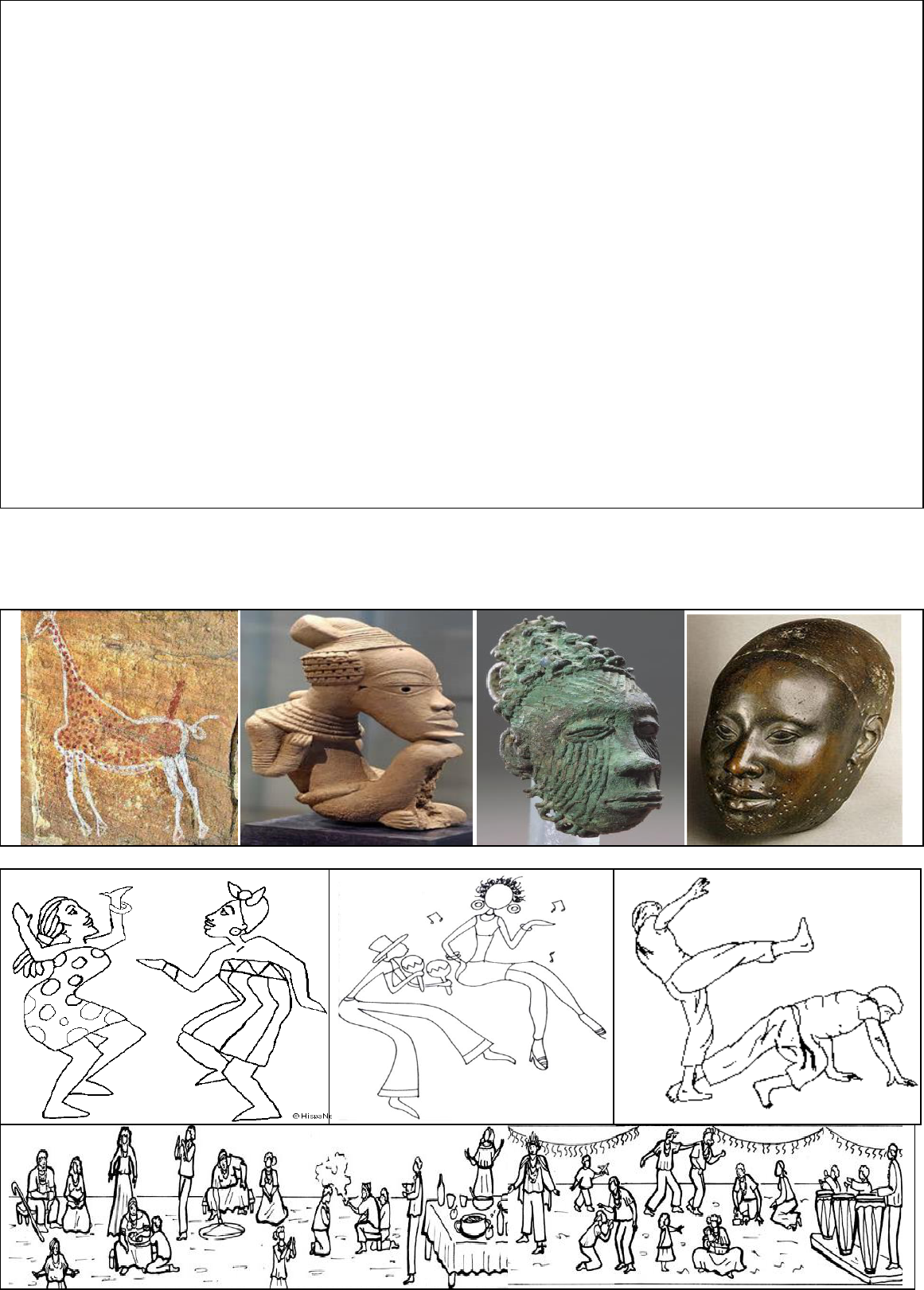 A ARTE AFRICANA É UM CONJUNTO DE MANIFESTAÇÕES ARTÍSTICAS PRODUZIDAS PELOS POVOS DA ÁFRICA SUBSAARIANA AO LONGO DA HISTÓRIA. História e características da arte africana. O continente africano acolhe uma grande variedade de culturas, caracterizadas cada uma delas por um idioma próprio, tradições e formas artísticas características. O deserto do Saara atua como uma barreira natural entre o norte da África e o resto do continente. Podemos identificar atualmente, na região sul do Saara, características da arte islâmica. A arte africana é um reflexo fiel das ricas histórias, mitos, crenças e filosofia dos habitantes deste enorme continente. A riqueza desta arte tem fornecido matéria-prima e inspiração para vários movimentos artísticos contemporâneos da América e da Europa. Artistas do século XX admiraram a importância da abstração e do naturalismo na arte africana. A história da arte africana remonta o período pré-histórico. As formas artísticas mais antigas são as pinturas e gravações em pedra, na região do Saara (6000 AC ao século I da nossa era). Outros exemplos da arte primitiva africana são as esculturas modeladas em argila dos artistas da cultura Nok (norte da Nigéria), feitas entre 500 AC e 200 DC. Destacam-se também os trabalhos decorativos de bronze de Igbo-Ukwu (séculos IX e X) e as magníficas esculturas em bronze e terracota de Ifé (do século XII ao XV). Estas últimas mostram a habilidade técnica e estão representadas de forma tão naturalista que, até pouco tempo atrás, acreditava-se ter inspirações na arte da Grécia Antiga. Os povos africanos faziam seus objetos de arte utilizando diversos elementos da natureza. Faziam esculturas de marfim, máscaras entalhadas em madeira e ornamentos em ouro e bronze. Os temas retratados nas obras de arte remetem ao cotidiano, a religião e aos aspectos naturais da região. Desta forma, esculpiam e pintavam mitos, animais da floresta, cenas das tradições, personagens do cotidiano etc. Chegada ao Brasil. A arte africana chegou ao Brasil através dos escravos, que foram trazidos para cá pelos portugueses durante os períodos colonial e imperial. Em muitos casos, os elementos artísticos africanos fundiram-se com os indígenas e portugueses, para gerar novos componentes artísticos de uma magnifíca arte afro-brasileira. 1. Numere as obras africanas (1) Pinturas e gravações em pedra, na região do Saara (6000 aC) (2) Esculturas modeladas em argila dos artistas da cultura Nok, feitas entre 500 AC e 200 DC. (3) Trabalhos decorativos de bronze de Igbo-Ukwu (séculos IX e X) (4) Esculturas em bronze e terracota de Ifé (do século XII ao XV) 2. Identifique as heranças culturais negras abaixo. Leia o texto e responda Encontre os sete erros. Colora as mascaras e faça uma exposição na escola.