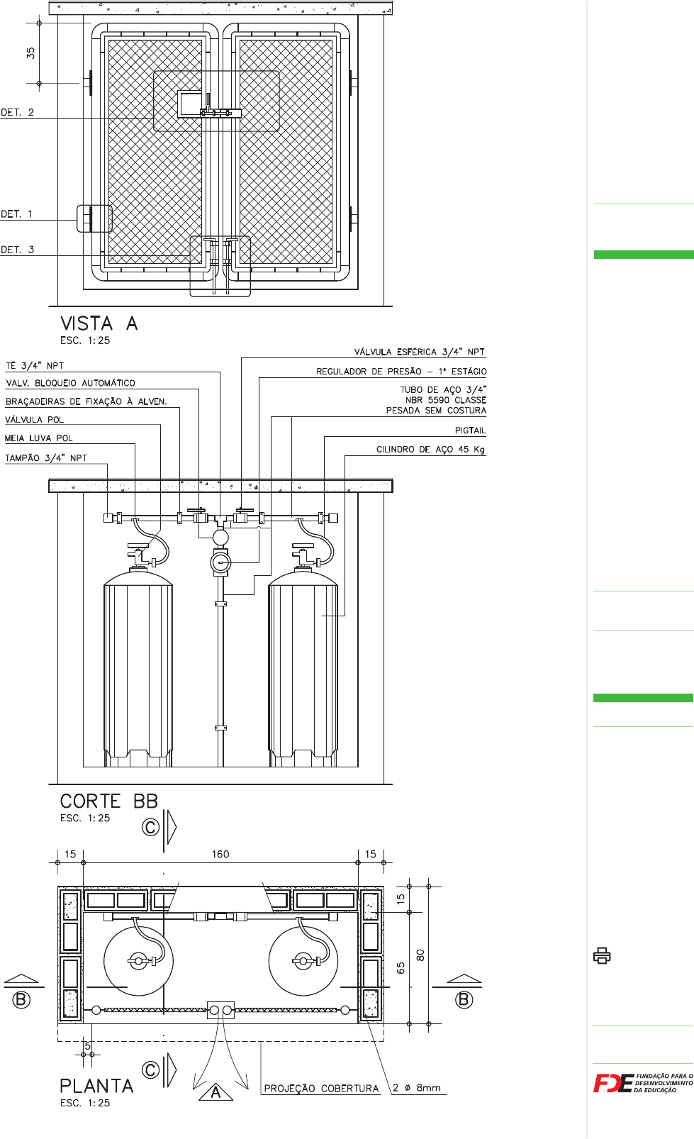 Componentes Respeite o Meio Ambiente. Imprima somente o ne- cessário Atenção Preserve a escala Quando for imprimir, use folhas A4 e desabilite a função “Fit to paper” Página 1/4 Revisão Data 4 05/06/07 AG-04 Abrigo de gás 2 cilindros 45 Kg Código de listagem 0802001 Componentes Respeite o Meio Ambiente. Imprima somente o ne- cessário Atenção Preserve a escala Quando for imprimir, use folhas A4 e desabilite a função “Fit to paper” Página 2/4 Revisão Data 4 05/06/07 AG-04 Abrigo de gás 2 cilindros 45 Kg Código de listagem 0802001 Componentes Respeite o Meio Ambiente. Imprima somente o ne- cessário Atenção Preserve a escala Quando for imprimir, use folhas A4 e desabilite a função “Fit to paper” Página 3/4 Revisão Data 4 05/06/07 AG-04 Abrigo de gás 2 cilindros 45 Kg Código de listagem 0802001 DESCRIÇÃO Constituintes • Base de concreto simples. • Pilares de concreto armado. • Alvenaria de blocos de concreto de 39 x 19 x 11,5cm. • Tampo de cobertura de concreto armado. • Argamassa de revestimento da alvenaria. • Cimentado liso para revestimento do piso. • Portas conforme desenho: - Tela articulada de arame galvanizado, fi o 10, malha qua- drangular de 2”; - Requadros de chapa de ferro dobrada l de 1” x 1/8” para fi xação da tela; - Quadro estrutural em tubos de ferro galvanizado Ø=2”, e=1/8”; - Curvas de 90º de ferro maleável Ø=2”; - Fixadores de ferro chato galvanizado 1” x 3/16”; - Dobradiças e barras de fi xação na alvenaria / estrutura (detalhe 1); - Fecho central em aço, com porta cadeado e trinco em barra redonda Ø=1/2” (detalhe 2); - Fecho inferior em aço, duplo, um para cada porta, em barra redonda Ø=1/2” (detalhe 3). Acessórios • Botijões P45 com carga, tubos e conexões para gás confor- me desenho (tubos de aço galvanizado classe pesada NBR 5590 e conexões em ferro maleável NBR 6925). • Regulador industrial de pressão de 1º estágio, pressão de saída: 150kPa vazão mínima de 5kg/h. Rosca NPT 3/4”. Sem regulagem de pressão manual e sem manômetro. • Válvula de bloqueio automático, com rearme manual. • Válvula de esfera: corpo em latão, esfera em latão (acaba- mento cromado) e sede em Tefl on. • Contrachapa: ferro chato 2” x 1/8”, chumbado no piso para fechamento inferior da porta. • Cadeado: de latão maciço 35mm. • Braçadeiras galvanizadas e buchas para fi xação da tubula- ção na alvenaria. • Placas de sinalização. • Extintores (se defi nido em projeto). Acabamentos • Portão: - Primer à base de zinco (galvanização à frio) nos pontos de solda e cortes; - Galvite nas demais superfícies galvanizadas; - Tinta esmalte sintético na cor alumínio sobre toda a superfície. • Alvenaria: pintura com tinta látex na cor branca. • Tubulação de condução de gás: acabamento em esmalte sintético amarelo padrão Munsell 5Y8/12, sobre fundo para galvanizados, conforme NBR 12694. Protótipo comercial • Conjunto composto de regulador Industrial de 1º Estágio com válvula de bloqueio automático: • Obs.: Este produto não possui dispositivo de regulagem manual e manômetro. - ALIANÇA - Ref: 76511/02 VM DSA - VERMELHO - COMAP - Ref: APZ120 OPSO - CB58550 • Tinta de fundo: - GALVITE • Válvula de esfera: - COMAP - JACKWALL - MIPEL APLICAÇÃO • Utilizado exclusivamente para recipientes transportáveis, no complemento da capacidade em ampliações de sistemas existentes e cantinas. • A sua aplicação é limitada em ampliações, sendo necessá- rio, para estes casos, a reestruturação da rede do abrigo, de maneira que um único regulador de primeiro estágio esteja interligado a todos os botijões, tanto os antigos como os da nova instalação (ampliação). ESPECIFICAÇÕES GERAIS • O abrigo, os recipientes de GLP e o conjunto de válvulas e regulador de 1º estágio devem ser instalados somente no exterior das edifi cações, em locais ventilados, próximos aos acessos de entrada. Preferencialmente devem estar instala- dos em áreas onde não transitam alunos. • Dentro do abrigo devem estar a tubulação, conexões, botijões, válvula de bloqueio automático, válvulas de esfera e o regulador de primeiro estágio que deve reduzir a pressão dos botijões para 150 Kpa e é o início da rede de primeiro estágio. • As instalações da Central devem permitir o reabastecimen- to de GLP (troca de botijões) sem interrupção de forneci- mento de gás. O abrigo deve estar em local de fácil acesso para veículos de carga que operam com cilindros P45. • Toda instalação elétrica que se fi zer necessária na área da central de gás, deve ser à prova de explosão e executada conforme as NBR 5363, NBR 5418, NBR 5419 e NBR 8447. • A pressão de projeto para a instalação da central de GLP é de 1,7MPa. • Os recipientes e os dispositivos de regulagem inicial da pressão do GLP não devem fi car em contato com a terra, nem estarem localizados em locais sujeitos à temperaturas excessivas ou acúmulo de água de qualquer origem. • Os recipientes podem ser instalados ao longo do limite de propriedade, desde que seja construída uma parede e uma cobertura resistente ao fogo, com tempo de resistência ao fogo (TRF), mínimo de 2 horas, posicionada ao longo do abrigo, com altura mínima de 1,8m. • Os recipientes de gás devem distar no mínimo 1,5m das aberturas, como ralos, canaletas e outras que estejam em nível inferior aos recipientes. • Os recipientes devem distar no mínimo 3m de qualquer fonte de ignição, inclusive estacionamento de veículos. • Os recipientes de gás devem distar no mínimo 6m de qual- quer outro depósito de materiais infl amáveis. • Na central de GLP, é expressamente proibida a armazena- gem de qualquer tipo de material, bem como outra utilização diversa da instalação. • Os recipientes não podem ser localizados sob redes elétri- cas, devendo ser respeitado o afastamento mínimo de 3m d