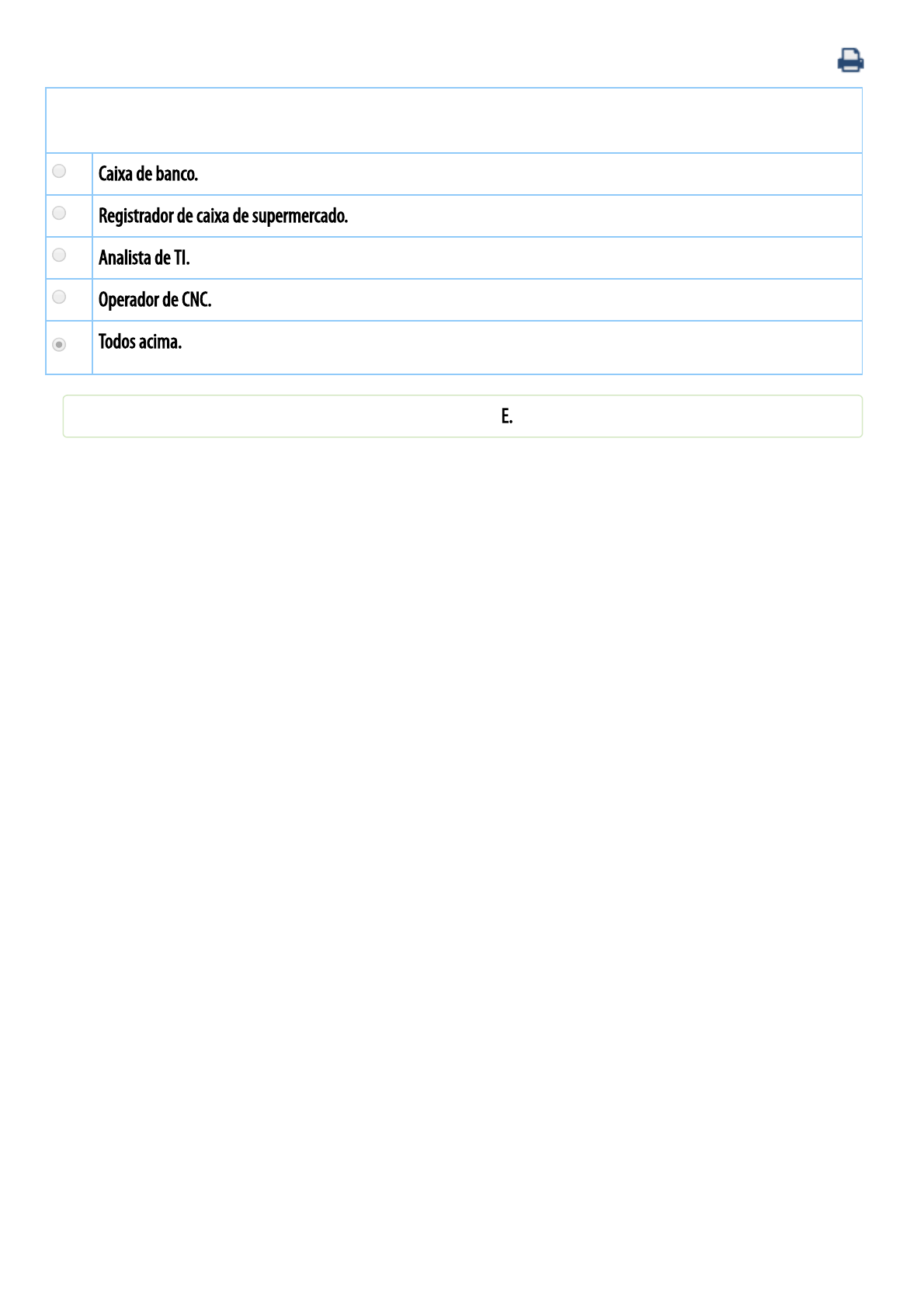 10/03/2020 Universidade Paulista - UNIP : Disciplina On-line. https://www.unip.br/presencial/central/Interna.aspx 1/1 Quem pode ser considerado um “Peopleware”? A Caixa de banco. B Registrador de caixa de supermercado. C Analista de TI. D Operador de CNC. E Todos acima. Você já respondeu e acertou esse exercício. A resposta correta é: E.