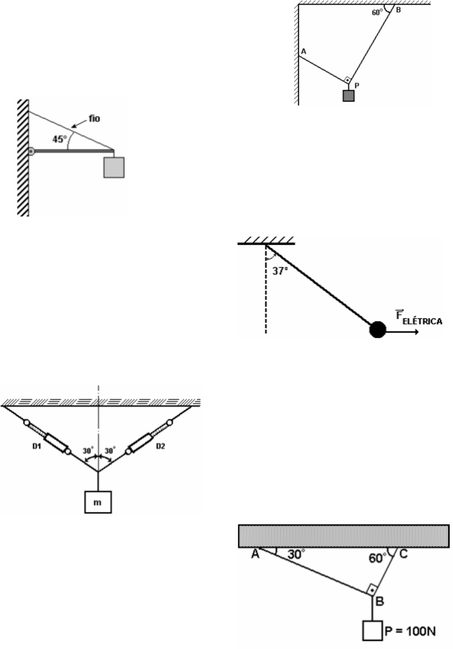 LISTA DE EXERCÍCIOS - ESTÁTICA 1. (Ufpe) A figura mostra um peso de 44 N suspenso no ponto P de uma corda. Os trechos AP e BP da corda formam um ângulo de 90°, e o ângulo entre BP e o teto é igual a 60°. Qual é o valor, e newtons, da tração no trecho AP da corda? 2. (Ufpe) Uma barra horizontal de massa desprezível possui uma de suas extremidades articulada em uma parede vertical. A outra extremidade está presa à parede por um fio que faz um ângulo de 45° com a horizontal e possui um corpo de 55 N pendurado. Qual o módulo da força normal à parede, em newtons, que a articulação exerce sobre a barra? 3. (Fatec) Uma pequena esfera de massa igual a 4,0 g, carregada eletricamente, está suspensa por uma corda. Sob a ação de uma força elétrica horizontal, a corda se desloca até que atinge o equilíbrio ao formar um ângulo de 37° com a vertical. Sabendo que cos 37° = 0,80 e sen 37° = 0,60, a intensidade da força elétrica e a tensão na corda são, respectivamente: a) 70 N e 56 N b) 30 N e 50 N c) 7,0 N e 5,6 N d) 3,0 N e 5,0 N e) 3,0 x 10 -2 N e 5,0 x 10 -2 N 4. (Fei) Sabendo-se que o sistema a seguir está em equilíbrio, qual é o valor da massa M quando os dinamômetros indicam 100N cada um? a) 17,32 kg b) 20 kg c) 10 kg d) 100 kg e) 200 kg 5. Na figura anterior, o corpo suspenso tem o peso 100N. Os fios são ideais e têm pesos desprezíveis, o sistema está em equilíbrio estático (repouso). A tração na corda AB, em N, é: (Dados: g=10m/s²; sen30°=0,5 e cos30°=√3/2). a) 20 b) 40 c) 50 d) 80 e) 100 6. O corpo M representado na figura pesa 80N e é mantido em equilíbrio por meio da corda AB e pela ação da força horizontal ù de módulo 60N. Considerando g = 10m/s², a intensidade da tração na corda AB, suposta ideal, em N, é: a) 60 b) 80 c) 100 d) 140 e) 200 7. Dois atletas estão sentados em lados opostos de uma gangorra, como mostra a figura. Determine o momento resultante em relação ao eixo de rotação? Determine ainda para que lado a gangorra cairá? 8. Uma tábua uniforme de 3m de comprimento é usada como gangorra por duas crianças com massas 25 kg e 54 kg. Elas sentam sobre as extremidades da tábua de modo que o sistema fica em equilíbrio quando apoiado em uma pedra distante de 1m da criança mais pesada. Qual o peso da tábua? Dado: g = 10 m/s² 9. Um fio, cujo limite de resistência é de 25N, é utilizado para manter em equilíbrio, na posição horizontal, uma haste de metal, homogênea, de comprimento AB = 80 cm e peso de 15N. A barra é fixa em A, numa parede, através de uma articulação, conforme indica a figura a seguir. Calcule a menor distância X, para a qual o fio manterá a haste em equilíbrio? 10. A barra a seguir é homogênea e está apoiada nos pontos A e B. Sabendo-se que a reação no apoio A é NA = 200N e que F1 = 100N e F2 = 500N, calcule o peso da barra. 11. Um cachorro de 4 kg está sentado em uma barra de 6m de comprimento. Considere o peso da barra desprezível. Calcule a reação dos apoios A e B, quando o cachorro está sentado a 1,5m do apoio B. 12. Para se estabelecer o equilíbrio da barra homogênea de 0,5 kg, apoiada em C, deve-se suspender em: a) A, um corpo de 1,5 kg. b) A, um corpo de 1,0 kg. c) A, um corpo de 0,5 kg. d) B, um corpo de 1,0 kg. e) B, um corpo de 1,5 kg. 13 – O sistema da figura ao lado está em equilíbrio. O peso da carga Q = 20 N e da carga S = 10 N. Desprezando o peso da barra, determine o peso da carga P. GABARITO: 1 – 22 2 – 55 N 3 – E 4 – A 5 – C 6 – C 7 – 2 N.m (anti-horário) 8 – 80 N 9 – 24 cm 10 – 100 N 11 – NA = 10 N ; NB = 30 N 12 – B 13 – 55 N
