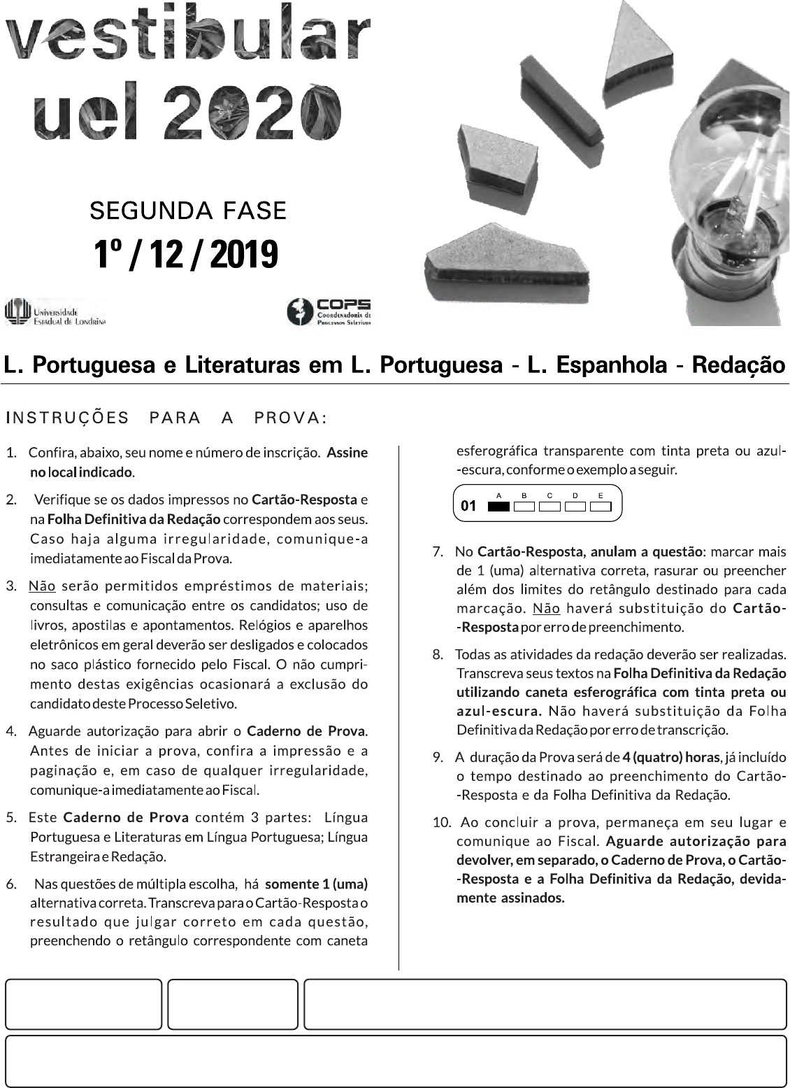O gabarito oficial provisório estará disponível no endereço eletrônico www.cops.uel.br a partir das 20 horas do dia 1º de dezembro de 2019. LÍNGUA PORTUGUESA E LITERATURAS EM LÍNGUA PORTUGUESA Leia o texto a seguir, que contém o início do conto “A menina do futuro torcido”, incluído em Vozes anoitecidas, de Mia Couto, e responda às questões de 1 a 3. Joseldo Bastante, mecânico da pequena vila, punha nos ouvidos a solução da sua vida. Viajante que passava, carro que parava, ele aproximava e capturava as conversas. Foi assim que chegou de ouvir um destino para sua filha mais velha, Filomeninha. Durante toda uma semana, chegavam da cidade notícias de um jovem que fazia sucesso virando e revirando o corpo, igual uma cobra. O rapaz tinha sido contratado por um empresário para exibir suas habilidades, confundir o trás para a frente. Percorria as terras e o povo corria para lhe ver. Assim, o jovem ganhou dinheiro até encher caixas, malas e panelas. Só devido das dobragens e enrolamentos da espinha e seus anexos. O contorcionista era citado e recitado pelos camionistas e cada um aumentava uma volta nas vantagens elásticas do rapaz. Chegaram mesmo a dizer que, numa exibição, ele se amarrou no próprio corpo como se fosse um cinto. Foi preciso o empresário ajudar para desatar o nó; não fosse isso, ainda hoje o rapaz estaria cintado. COUTO, Mia. Vozes anoitecidas. São Paulo: Companhia das Letras, 2013. p. 127. 1 Quanto ao destino de Filomeninha, assinale a alternativa correta. a) Ela treina muito à espera do empresário, mas este, ao chegar à vila, a recusa, já desinteressado pelo contorcionismo. b) Ela é iludida pelo empresário e abandona a vila com ele, sem corresponder às expectativas do pai. c) Ela se apaixona pelo contorcionista e abandona a vila, sem dar explicações à família. d) Ela ingressa no mundo do espetáculo com o contorcionista e garante muito dinheiro à família. e) Ela é acolhida pelo empresário, mas, no dia da estreia de seu espetáculo, morre devido ao treinamento exaustivo. Alternativa correta: a) Justificativa O empresário chega à vila, mas não ilude Filomeninha que também não sai daquele local. A personagem não entra em contato com o contorcionista nem ingressa no mundo do espetáculo. O empresário não acolhe Filomeninha. 2 O trecho contém uma frase significativa tanto para este conto quanto para outros contos do livro: “O rapaz tinha sido contratado por um empresário para exibir suas habilidades, confundir o trás para a frente.”. Sobre a relação desse trecho com os outros contos do livro, assinale a alternativa correta. a) O que se percebe tanto nesse conto quanto em outros contos do livro é um conjunto muito farto de habilidades extraordinárias nas personagens que as conduz à superação de adversidades. b) A imagem do contorcionista e de seus movimentos corporais inusitados é representativa dos esforços de diversas personagens dos contos do livro que convivem com a miséria e com a ignorância. c) Um traço comum entre esse conto e outros contos do livro é a circulação de empresários por espaços muito pobres, o que provoca o progresso tanto dos lugares quanto das personagens que ali vivem. d) A questão central da frase é a ideia de confusão, que, nesse conto, se exemplifica pelo fato de Joseldo ter compre- endido mal as notícias, uma vez que as histórias sobre o contorcionista eram falsas. e) As inversões do tempo constituem aspecto relevante desse conto e de outros do livro, pois a sequência dos eventos narrados sofre sistematicamente a interferência dos desvarios das personagens. Alternativa correta: b) Justificativa As personagens desse conto e de outros não superam as adversidades com que se deparam, apesar de possuírem algumas habilidades. A circulação de empresários não é marca frequente nos contos do livro, e eles não estão associados com o progresso dos lugares e das personagens. Joseldo não compreende mal as notícias, que, no caso específico do contorcionista, não eram falsas. Nesse conto, não há inversão na narração de eventos. As personagens empreendem esforços em suas rotina, o que cria a afinidade com o contorcionismo. 1 / 25 3 Assinale a alternativa que explica corretamente a frase: “O contorcionista era citado e recitado pelos camionis- tas e cada um aumentava uma volta nas vantagens elásticas do rapaz.” a) Com a frase, o narrador enfatiza como Joseldo ficava embevecido com as histórias a respeito do contorcionista. b) A frase demonstra que os relatos dos caminhoneiros eram convincentes porque eram repetitivos. c) O trecho “aumentava uma volta” aponta tanto para as habilidades corporais do jovem quanto para os relatos desiguais dos caminhoneiros. d) O termo “elásticas” está mais associado à forma do relato dos caminhoneiros do que às habilidades corporais do contorcionista. e) O termo “vantagens” já demonstra que o contorcionista era um falsário, embora os caminhoneiros acreditassem nas habilidades de seus movimentos. Alternativa correta: c) Justificativa A frase não focaliza as reações de Joseldo. O caráter repetitivo dos relatos existe, mas não os torna mais convincentes; ao contrário, é apontada uma marca exagerada que torna os relatos questionáveis. O termo “elásticas” é específico para caracterizar as habilidades do contorcionista, assim como as “vantagens” são as próprias habilidades. A ideia de aumentar uma volta, tem tanto um sentido literal, correspondente ao movimento do contorcionista, quanto um sentido figurado referente aos relatos. Leia os trechos a seguir, extraídos de A hora da estrela, de Clarice Lispector, e responda às questões 4 e 5. (Há os que têm. E há os que não têm. É muito simples: a moça não tinha. Não tinha o quê? É apenas isso mesmo: não tinha. Se der para me entenderem, está bem. Se não, também está bem. Mas por que trato dessa moça quando o que mais desejo é trigo pur