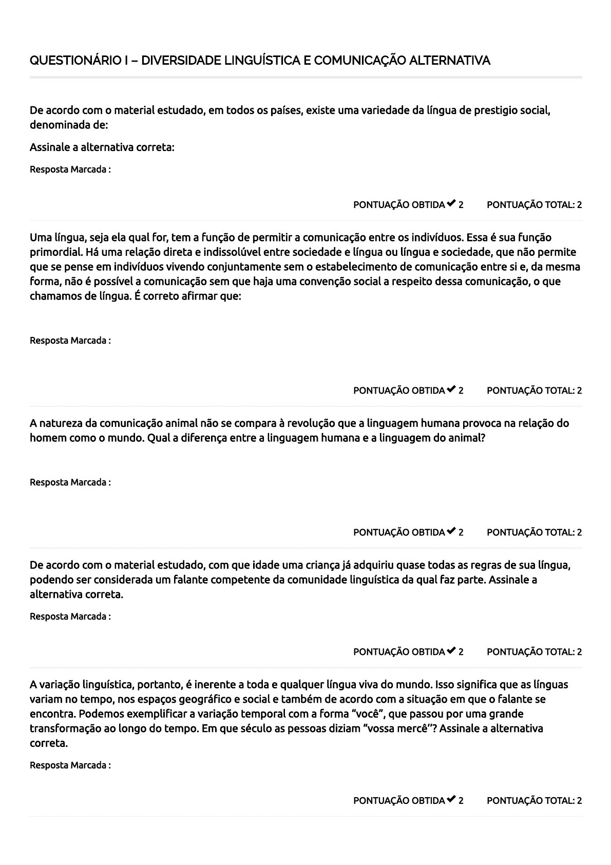 19/03/2020 Course Status – Centro Universitário Faveni https://ava.unifaveni.com.br/course-status/ 1/2 QUESTIONÁRIO I – DIVERSIDADE LINGUÍSTICA E COMUNICAÇÃO ALTERNATIVA PONTUAÇÃO TOTAL: 2PONTUAÇÃO OBTIDA 2 De acordo com o material estudado, em todos os países, existe uma variedade da língua de prestigio social, denominada de: Assinale a alternativa correta: Resposta Marcada : Língua padrão PONTUAÇÃO TOTAL: 2PONTUAÇÃO OBTIDA 2 Uma língua, seja ela qual for, tem a função de permitir a comunicação entre os indivíduos. Essa é sua função primordial. Há uma relação direta e indissolúvel entre sociedade e língua ou língua e sociedade, que não permite que se pense em indivíduos vivendo conjuntamente sem o estabelecimento de comunicação entre si e, da mesma forma, não é possível a comunicação sem que haja uma convenção social a respeito dessa comunicação, o que chamamos de língua. É correto a�rmar que: Resposta Marcada : Língua nada mais é que um conjunto de convenções sociais historicamente constituídas, que permite que os seres humanos se comuniquem entre si. PONTUAÇÃO TOTAL: 2PONTUAÇÃO OBTIDA 2 A natureza da comunicação animal não se compara à revolução que a linguagem humana provoca na relação do homem como o mundo. Qual a diferença entre a linguagem humana e a linguagem do animal? Resposta Marcada : A diferença entre a linguagem humana e a ‘’linguagem’’ do animal está no fato de que este não conhece o símbolo, mas somente o índice. PONTUAÇÃO TOTAL: 2PONTUAÇÃO OBTIDA 2 De acordo com o material estudado, com que idade uma criança já adquiriu quase todas as regras de sua língua, podendo ser considerada um falante competente da comunidade linguística da qual faz parte. Assinale a alternativa correta. Resposta Marcada : Aos 3 anos PONTUAÇÃO TOTAL: 2PONTUAÇÃO OBTIDA 2 A variação linguística, portanto, é inerente a toda e qualquer língua viva do mundo. Isso signi�ca que as línguas variam no tempo, nos espaços geográ�co e social e também de acordo com a situação em que o falante se encontra. Podemos exempli�car a variação temporal com a forma “você”, que passou por uma grande transformação ao longo do tempo. Em que século as pessoas diziam “vossa mercê’’? Assinale a alternativa correta. Resposta Marcada : No século XII 19/03/2020 Course Status – Centro Universitário Faveni https://ava.unifaveni.com.br/course-status/ 2/2 16 / 20 PONTUAÇÃO TOTAL: 2PONTUAÇÃO OBTIDA 2 De acordo com o material estudado, quais são os tipos de variações linguísticas existentes? Resposta Marcada : Variedades geográ�cas, variedades históricas, variedades sociais e variedades situacionais. PONTUAÇÃO TOTAL: 2PONTUAÇÃO OBTIDA 0 Os aspectos gerais dos tipos de texto concretizam-se em situações cotidianas de comunicação nos gêneros textuais, textos �exíveis e adaptáveis que apresentam uma intenção comunicativa bem de�nida e uma função social especí�ca, adequando-se ao uso que se faz deles. Quais os gêneros textuais pertencentes aos textos narrativos? Resposta Marcada : Romance, novelas e crônicas. PONTUAÇÃO TOTAL: 2PONTUAÇÃO OBTIDA 2 Redação o�cial é uma forma especí�ca de escrever que deve seguir algumas normas e técnicas estabelecidas. É comumente utilizada em momentos formais que necessitam ser documentados ou quando envolvem os três poderes constituído pelo Estado. Assim como qualquer correspondência, essa forma de escrita deve apresentar algumas características básicas. Quais são elas? Resposta Marcada : Formalidade, padronização e concisão. PONTUAÇÃO TOTAL: 2PONTUAÇÃO OBTIDA 0 A sintaxe visa a determinar quais combinações de palavras são bem formadas em determinada língua. É uma das partes da Gramática na qual são estudadas as disposições das palavras nas orações, nos períodos, bem como a relação lógica estabelecida entre elas. É correto a�rmar que: Resposta Marcada : Para que o falante de uma língua possa interagir verbalmente com outros, ele não necessita organiza as sentenças linguísticas para que possa transmitir um signi�cado completo e, assim, ser compreendido. PONTUAÇÃO TOTAL: 2PONTUAÇÃO OBTIDA 2 De acordo com o material estudado, as leis, cláusulas contratuais e edital de concursos públicos, fazem parte de qual gênero textual? Assinale a alternativa correta Resposta Marcada : Gêneros textuais pertencentes aos textos prescritivos. Total