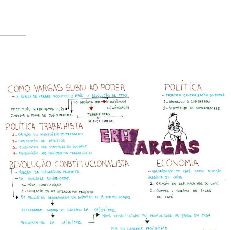 Era Vargas A Era Vargas foi o período de quinze anos da história brasileira que se estendeu de 1930 a 1945 e no qual Getúlio Vargas era o presidente do país. A ascensão de Vargas ao poder foi resultado direto da Revolução de 1930, que destituiu Washington Luís e impediu a posse de Júlio Prestes (presidente eleito que assumiria o país). Ao longo desse período, Getúlio Vargas procurou centralizar o poder. Muitos historiadores, inclusive, entendem o período 1930-1937 como a “gestação” da ditadura de Vargas. Vargas também ficou marcado pela sua aproximação com as massas, característica que se tornou muito marcante durante o Estado Novo. Permaneceu no poder até 1945, quando foi forçado a renunciar à presidência por causa de um ultimato dos militares. Com a saída de Vargas do poder, foi organizada uma nova Constituição para o país e iniciada outra fase da nossa história: a Quarta República (1946-1964). Mapa Mental: Era Vargas Características da Era Vargas Resumir as características da Era Vargas é uma tarefa complexa, principalmente porque cada fase assumiu aspectos diferentes. De maneira geral, as seguintes características podem ser destacadas. Centralização do poder → Ao longo de seus quinze anos no poder, Vargas tomou medidas para enfraquecer o Legislativo e reforçar os poderes do Executivo. Essa característica ficou evidente durante o Estado Novo. Política Trabalhista → Vargas atuou de maneira consistente no sentido de ampliar os benefícios trabalhistas. Para isso, criou o Ministério do Trabalho e concedeu direitos aos trabalhadores. Era uma forma de reforçar seu poder aproximando-se das massas. https://brasilescola.uol.com.br/historiab/washington-luis.htm https://brasilescola.uol.com.br/historiab/vargas.htm https://brasilescola.uol.com.br/historiab/republica-populista-1945-1964.htm Propaganda Política → O uso da propaganda como forma de ressaltar as qualidades de seu governo foi uma marca forte de Vargas e que também ficou evidente durante o Estado Novo a partir do Departamento de Imprensa e Propaganda (DIP.) Capacidade de negociação política → A capacidade política de Vargas não surgiu do nada, mas foi sendo construída e aprimorada ao longo de sua vida política. Vargas tinha uma grande capacidade de conciliar grupos opostos em seus governos, como aconteceu em 1930, quando oligarquias dissidentes e tenentistas estavam no mesmo grupo apoiando-lhe. A postura de Vargas no poder do Brasil durante esse período pode ser também relacionada com o populismo, principalmente pelos seguintes aspectos: 1. Relação direta e não institucionalizada do líder com as massas; 2. Defesa da união das massas; 3. Liderança baseada no carisma; 4. Sistema partidário frágil. Transição de poder Vargas e militares aliados em foto tirada quando a Revolução de 1930 estava em curso.** A ascensão de Getúlio Dornelles Vargas à presidência aconteceu pela implosão do modelo político que existia no Brasil durante a Primeira República. Ao longo da década de 1920, inúmeras críticas foram feitas ao sistema oligárquico que vigorava em nosso país, sendo os tenentistas um dos movimentos de oposição de maior destaque. A implosão da Primeira República concretizou-se de fato durante a eleição de 1930. Nessa eleição, a oligarquia mineira rompeu abertamente com a oligarquia paulista porque o presidente Washington Luís recusou-se a indicar um candidato mineiro para concorrer ao cargo. A indicação para presidente foi do paulista Júlio Prestes. https://brasilescola.uol.com.br/historiab/o-dip-estado-novo.htm https://brasilescola.uol.com.br/o-que-e/historia/o-que-foi-tenentismo.htm https://brasilescola.uol.com.br/historiab/republica-velha-1889-1930.htm Isso desagradou profundamente à oligarquia mineira, uma vez que a atitude do presidente rompia com o acordo existente entre as duas oligarquias (Política do Café com Leite). Assim, os mineiros passaram a conspirar contra o governo e, aliando-se às oligarquias paraibana e gaúcha, optaram por lançar um candidato para concorrer à presidência: Getúlio Vargas. A disputa eleitoral travada entre Júlio Prestes e Getúlio Vargas teve como desfecho a vitória do primeiro. No entanto, mesmo derrotados, membros da chapa eleitoral de Vargas (chamada Aliança Liberal) começaram a conspirar para destituir Washington Luís do poder (Vargas, porém, havia aceitado a derrota). Essa conspiração tornou-se rebelião de fato quando João Pessoa, vice de Getúlio Vargas, foi assassinado em Recife por João Dantas. O assassinato de João Pessoa não tinha nenhuma relação com a eleição disputada, mas o acontecido foi utilizado como pretexto para que um levante militar contra Washington Luís fosse iniciado. A revolta iniciou-se em 3 de outubro de 1930 e estendeu-se por três semanas. No dia 24 de outubro de 1930, o presidente Washington Luís foi deposto da presidência. Uma junta militar governou o Brasil durante 10 dias e, em 3 de novembro de 1930, Getúlio Vargas, que aderiu à rebelião quando ela estava em curso, assumiu a presidência do Brasil. Fases da Era Vargas Os historiadores dividem a Era Vargas em três fases: Governo Provisório (1930-34), Governo Constitucional (1934-37) e Estado Novo (1937-1945). Governo Provisório (1930-34) Getúlio Vargas no Palácio do Catete (palácio presidencial) após o sucesso da Revolução de 1930.*** O governo provisório, como o próprio nome sugere, deveria ter sido uma fase de transição em que Vargas rapidamente organizaria uma Assembleia Constituinte para elaborar uma nova Constituição https://brasilescola.uol.com.br/historiab/politica-cafe-com-leite.htm https://brasilescola.uol.com.br/historiab/governo-vargas.htm https://brasilescola.uol.com.br/historiab/governo-vargas.htm https://brasilescola.uol.com.br/historiab/governo-vargas.htm https://brasilescola.uol.com.br/historiab/vargas.htm para o Brasil. Getúlio Vargas, porém, nesse momento, já deu mo
