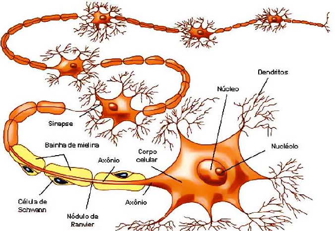Prof. Heiner Borges Neuroanatomia Aula 03 Tecido Nervoso • O tecido compreende basicamente dois tipos celulares: os neurônios e as células gliais ou neuróglia. • O neurônio tem a função básica de receber, processar e enviar informações. • A neuróglia compreende células que ocupam os espaços entre os neurônios, com funções de sustentação, revestimento ou isolamento, modulação da atividade neuronal e defesa. • Quando os neurônios morrem como resultado de programação natural ou por efeito de toxinas, doenças ou traumatismos jamais serão substituídos. • Já a neuróglia conserva a capacidade de mitose (divisão celular) após completa diferenciação. Neurônios • São células altamente excitáveis que se comunicam entre si ou com células efetuadoras (células musculares ou secretoras), usando basicamente uma linguagem elétrica. • A maioria dos neurônios possui três regiões responsáveis por funções especializadas: corpo celular, dendritos (do grego, déndron = árvore) e axônio (do grego áxon = eixo). Corpo celular • Contém núcleo e citoplasma com as organelas citoplasmáticas usualmente encontradas em outras células. • No pericário/ corpo celular / soma, salienta-se a riqueza em ribosomas, retículo endoplasmático granular e agranular e aparelho de Golgi, ou seja, as organelas envolvidas em síntese. • Mitocôndrias, abundantes e geralmente pequenas, estão distribuídas por todo o pericário, especialmente ao redor dos corpúsculos de Nissi, sem, no entanto, penetrá-los. • O corpo celular é o centro metabólico do neurônio, responsável pela síntese de todas as proteínas neuronais, bem como pela maioria dos processos de degradação e renovação de constituintes celulares, inclusive as membranas. • O corpo celular é como os dendritos, local de recepção de estímulos, através de contatos sinápticos. Dendritos • Geralmente são curtos (de alguns micrômetros a alguns milímetros de comprimento) e ramificam-se profusamente, à maneira de galhos de uma árvore, em ângulo agudo, originando dendritos de menor diâmetro. • Apresentam contorno irregular. Podem apresentar os mesmos constituintes citoplasmáticos do pericário. • Os dendritos são especializados em receber estímulos, traduzindo-os em alterações do potencial de repouso da membrana. Axônio • A grande maioria dos neurônios possui um axônio, prolongamento longo e fino que se origina do corpo ou de um dendrito principal. • O axônio apresenta comprimento muito variável, dependendo do tipo de neurônio, podendo ter, na espécie humana, de alguns milímetros a mais de um metro. É cilíndrico e, se ramifica, o que faz em ângulo obtuso, originando colaterais de mesmo diâmetro do inicial. Estruturalmente, apresenta, além da membrana plasmática ou axolema, o citoplasma axônico ou axoplasma, contendo microtúbulos, neurofilamentos, microfilamentos, retículo endoplasmático agranular, mitocôndrias e vesículas. • O axônio é especializado em gerar e conduzir o potencial de ação. Sinapses • Através de suas terminações axônicas, entram em contato com outros neurônios, passando-lhes informações. • Quanto a morfologia e ao modo de funcionamento, reconhecem-se dois tipos de sinapses: sinapses elétricas e sinapses químicas. Neuróglia • Tanto no SNC como no SNP, os neurônios relacionam-se com essas células, também chamadas de glia ou gliócitos. • São as células mais frequentes do SN, variação de 1:10 a 1:50. Neuróglia do Sistema nervoso central • No sistema nervoso central, a neuróglia compreende: astrócitos, oligodendrócitos, microgliócitos e as células ependimárias. • Os astrócitos e oligodendrócitos são coletivamente denominados como macróglia e os microgliócitos como micróglia. A macróglia e a micróglia colocam- se entre os neurônios. Astrócitos • Forma semelhante a estrela. São abundantes e caracterizados por inúmeros prolongamentos. • Há dois tipos: Astrócitos Protoplasmáticos, localizados na substancia cinzenta. E Astrócitos Fibrosos, encontrados na substancia branca. • Tem funções de sustentação e isolamento de neurônios. • Após injuria, os astrócitos aumentam localmente por divisão celular (mitose) e ocupam áreas lesadas à maneira de cicatriz. Oligodendrócitos • São menores que os astrócitos e possuem poucos prolongamentos. • Distinguem-se dois tipos: oligodendrócito satélite ou perineuronal, situado junto ao corpo celular e dendritos; e oligodendrócito fascicular, encontrado junto as fibras nervosas. • Os oligodendrócitos fasciculares são responsáveis pela formação da bainha de mielina em axônios do sistema nervoso central. Microgliócitos • São células pequenas e alongadas com núcleo denso também alongado e de contorno irregular, possuem poucos prolongamentos, que partem das suas extremidades. • São encontrados tanto na substância branca como na cinzenta e apresentam funções fagocíticas. • Alguns autores acreditam que os microgliócitos de tecido nervoso normal sejam apenas células pouco diferenciadas, capazes de transformarem-se em astrócitos ou oligodendrócitos. • Tem função de fagocitose, ou seja, remoção de células mortas, detritos e microorganismos invasores. Células Ependimárias • São células cuboidais ou prismáticas que forram, como epitélio de revestimento simples, as paredes dos ventrículos cerebrais, do aqueduto cerebral e do canal central da medula espinhal. • Apresentam em sua face luminal inúmeras microvilosidades e geralmente são ciliadas. • Cada célula ependimária possui um prolongamento que penetra o tecido nervoso ao redor das cavidades. • Nos ventrículos cerebrais, um tipo de célula ependimária modificada recobre tufos de tecido conjuntivo, que se projetam da pia-máter, constituindo os plexos corióideos, responsáveis pela formação do líquido cérebro-espinhal. Neuróglia do Siste