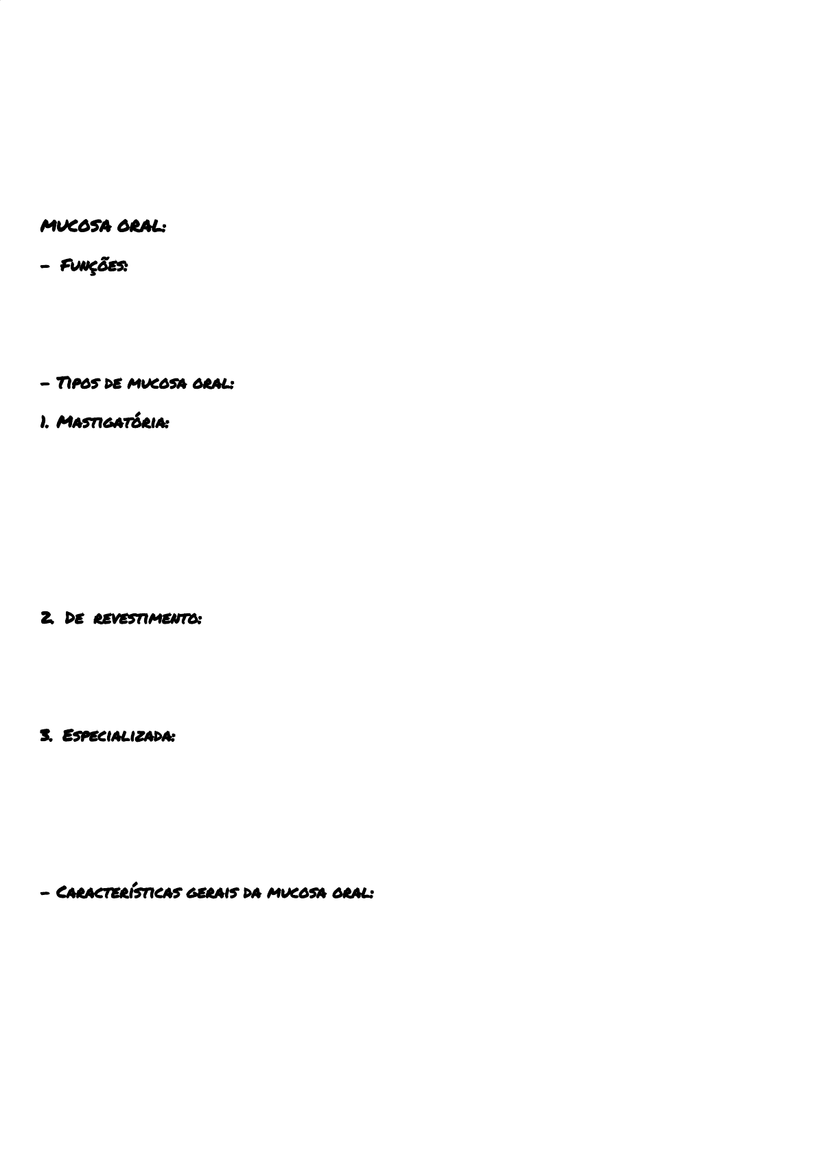 Aula 3 - 23/10/2019 Alterações histológicas do epitélio de revestimento da mucosa oral Por: Vinicius da Silva Morais MUCOSA ORAL: Tecido úmido que reveste a cavidade oral. - Funções: proteção (contra traumas e penetração de microorganismos), sensação (paladar, temperatura, etc) e secreção (presença de glândulas salivares e sebáceas). - Tipos de mucosa oral: 1. Mastigatória: Corresponde a 25% do total da mucosa oral. É encontrada em gengiva e palato duro. Está em contato com alimentos durante a mastigação. É geralmente QUERATINIZADA, já que precisa ser firme para suportar esforços mastigatórios. *Além da firmeza adquirida na presença de queratina pelo palato duro, suas fibras se aderem ao periósteo, o tornando mais firme ainda. 2. De revestimento: Corresponde a 60% do total da mucosa oral. É encontrada em assoalho de boca, ventre da língua, mucosa alveolar, mucosa jugal, bochechas, lábios e palato mole. Geralmente, é NÃO queratinizada. 3. Especializada: Corresponde a 15% do total da mucosa oral. É representada pelas papilas epiteliais/papilas linguais. São encontradas no dorso da língua. *Tipos de papilas: fungiformes, filiformes, foleáceas e circunvaladas. - Características gerais da mucosa oral: 1. Separada da pele pela zona “vermelhão dos lábios”; 2. Fatores que contribuem para a cor da mucosa oral: Concentração e estado de dilatação dos vasos sanguíneos presentes no tecido conjuntivo subjacente ao epitélio, espessura do epitélio, grau de queratinização, quantidade de pigmentação melânica. *Clinicamente, a cor fornece fornece uma indicação clínica da condição da mucosa. - Diferenças entre mucosa oral e pele: Cor: A pele tende a ser mais “clara” que a mucosa; Superfície: Quando comparadas, a mucosa é úmida e a pele é seca (exceto quando há atividade das glândulas sudoríparas); Presença de estruturas anexas da pele: A pele possui folículos pilosos, glândulas sudoríparas e glândulas sebáceas. A mucosa oral possui glândulas salivares e glândulas sebáceas (Grânulos de Fordyce); Presença de glândulas salivares menores no tecido conjuntivo: A mucosa oral tem, mas a pele não; Firmeza: A mucosa oral apresenta uma variação na sua firmeza, como já foi visto estudando os tipos de mucosa oral. GRÂNULOS DE FORDYCE Naturalmente, a mucosa oral apresenta glândulas sebáceas no tecido conjuntivo. Quando essas glândulas passam a se projetar no tecido epitelial, recebem o nome de Grânulos de Fordyce. São caracterizadas como “variação da normalidade” e comumente aparecem mucosa jugal, podendo também aparecer em lábios e mucosa alveolar. Apresentam coloração amarelo pálido. ESTRUTURA / composição DA MUCOSA ORAL: Epitélio + Tecido conjuntivo 1. Epitélio: O epitélio da mucosa oral é classificado como epitélio estratificado escamoso. É composto por 3 camadas: superficial, escamosa ou intermediária, basal. 1.1 Superficial: Composto por células achatadas, planas e com núcleos ovais pequenos que são continuamente perdidos. 1.2 Intermediária / espinhosa: Composta por células ovais; representa o maior volume do epitélio. *Por que “espinhosa”? As células se contraem em reação ao corante e projetam demossomos para manterem conexão entre si. Essas projeções demossomicas possuem formato de espinho, dando nome à camada. 1.3 Basal: Composto por células cúbicas enfileiradas e organizadas; são células progenitoras, que fornecem novas células para substituir as que foram perdidas no estrato superficial. A ausência do estrato basal causa desarranjo celular, já que ela sustenta todos os estratos epiteliais sobrejacentes. *OBS: A camada ou estrato basal é DIFERENTE de membrana ou lâmina basal. - Note: Membrana basal -> Lâmina fibrosa que sustenta a camada basal. Também é uma interface entre epitélio e tecido conjuntivo. Seus principais componentes são: colágeno IV e VII, laminina, moléculas de adesão. É IMPORTANTE OBSERVAR QUE HÁ PROJEÇÕES ENTRE TECIDO EPITELIAL E TECIDO CONJUNTIVO. - AS PROJEÇÕES DE EPITÉLIO QUE TENTAM INVADIR CONJUNTIVO -> CRISTAS EPITELIAIS; - AS PROJEÇÕES DE CONJUNTIVO QUE TENTAM INVADIR EPITÉLIO -> PAPILAS CONJUNTIVAS. 2. Tecido conjuntivo: É composto por duas camadas: lâmina própria (camada superficial) e camada submucosa (onde é possível identificar os glóbulos de glândulas salivares). Nele há nervos, vasos sanguíneos. 2.1 Lâmina própria: Divide-se em papilar e reticular. 2.1.1 Papilar: Área de tecido conjuntivo que adentra a papila conjuntiva. 2.1.2 Reticular: Todo o resto da lâmina própria. 2.2 Submucosa: Onde, nas lâminas de laboratório, é possível observar os glóbulos das glândulas salivares. Possui uma grande concentração de vasos sanguíneos e nervos. IMPORTANTE: Logo, temos - em ordem: ¹Epitélio (camada superficial, camada espinhosa, camada basal) ¹Membrana basal (que não é possível observar no microscópio do laboratório) e ¹Tecido conjuntivo (lâmina própria e camada submucosa). TERMOS HISTOPATOLÓGICOS - EPITÉLIO ORAL 1. ORTOCERATOSE: Quando, no epitélio escamoso estratificado ceratinizado superficial, as células são achatadas, com citoplasma homogêneo, cor rosa claro e SEM NÚCLEO. 2. PARACERATOSE: Quando, no epitélio escamoso estratificado ceratinizado superficial, as células são achatadas, com citoplasma homogêneo acidófilo (predileção por corantes ácidos), HAVENDO NÚCLEOS PICNÓTICOS (azuis, devido ao alto grau de condensação da cromatina). 3. CERATOSE: Ceratinização de epitélios que normalmente NÃO SÃO ceratinizados. Ex.: Leucoplasia em mucosa jugal. ALTERAÇÕES HISTOLÓGICAS DO EPITÉLIO DE REVESTIMENTO DA MUCOSA ORAL ACANTOSE: Espessamento da camada intermediária / espinhosa do epitélio da mucosa oral. Ex: Papiloma oral. HIPERCERATOSE: Espessamento da camada de queratina ou surgimento desta eu superfícies que normalmente não a contém. Ex: Leucoplasia. *variações da hiper
