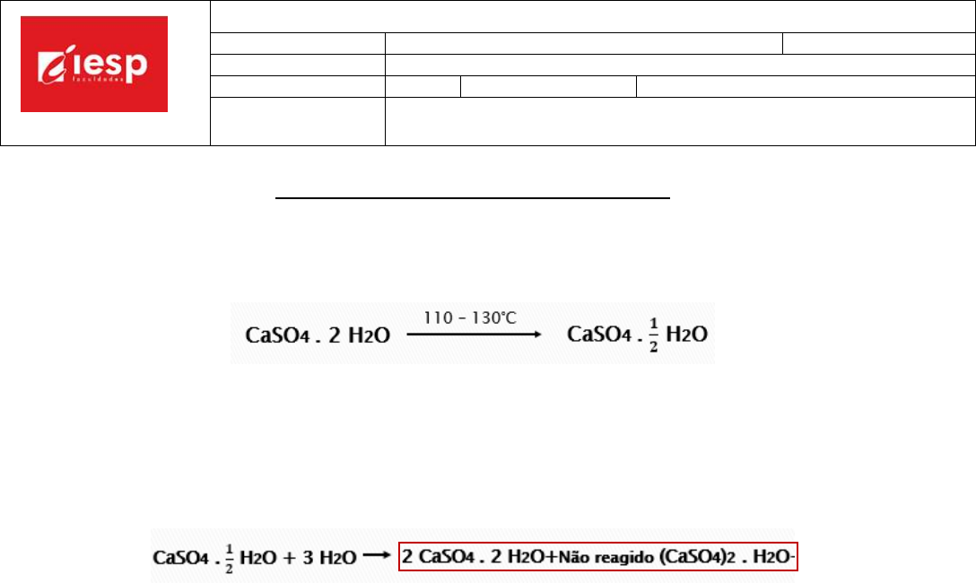 INSTITUTO DE EDUCAÇÃO SUPERIOR DA PARAÍBA – IESP BR 230 - Km 14 Cabedelo – Paraíba – CEP 58.310-000 CNPJ: 70.118.716/0001-73 – Telefone: 83.2106.3800 INSTITUTO DE EDUCAÇÃO SUPERIOR DA PARAÍBA CURSO: ODONTOLOGIA TURNO: DISCIPLINA: MATERIAIS DENTÁRIOS PERÍODO: 3° C.H.: 3h/aula SEMESTRE: PROFESSOR: Veruska Lima Exercícios de fixação sobre “Gessos Odontológicos” 1. Quais as aplicações dos gessos da odontologia? 2.Que reação está descrita abaixo? Qual o produto obtido? 3.O processo de obtenção de gessos pode levar a obtenção de diferentes hemi-hidratos. Quais são eles? Eles representam a mesma substância química? Quais as diferenças entre eles? 4.Cite as indicações dos diferentes tipos de gesso. 5. O trecho em destaque na reação abaixo se refere a um processo endotérmico ou exotérmico? 6.Cite alguns fatores que interferem no tempo de presa do gesso. 7.Descreva o processo de expansão de presa sofrido pelo gesso. 8.Quais os reflexos das diferenças de proporcionamento exigidas por cada tipo de gesso? 9.Que cuidados durante a manipulação do gesso devemos ter para reduzir a quantidade de ar incorporado? Que reflexos a permanência desse ar na massa manipulada por ter no modelo obtido ao final?