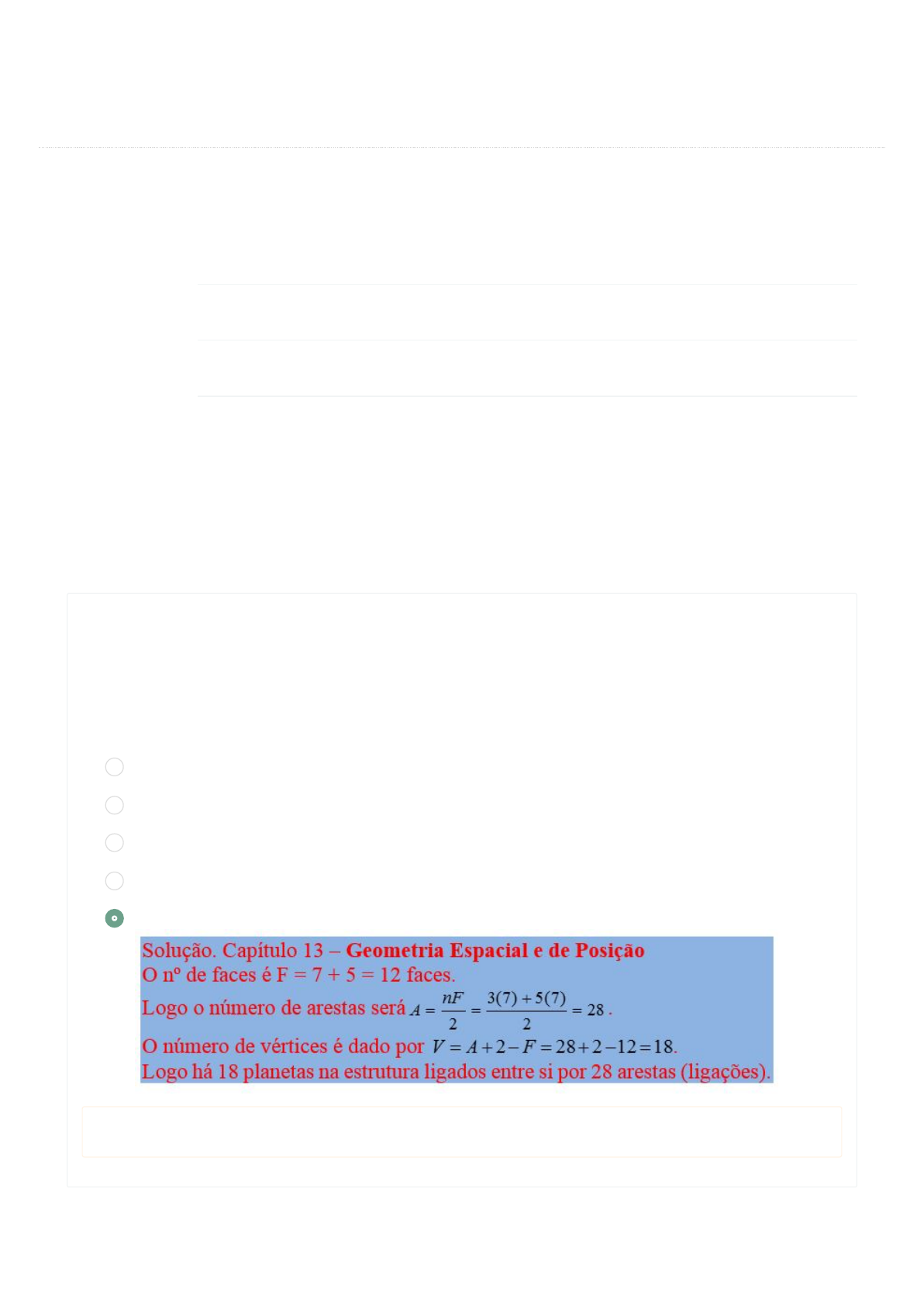 / Geometria e Desenho Geométrico Atividade anterior Iniciado em sexta, 27 Mar 2020, 13:34 Estado Finalizada Concluída em sexta, 27 Mar 2020, 13:42 Avaliar 10,00 de um máximo de 10,00(100%) Questão 1 Correto O professor Otávio pede aos seus alunos que criem através de poliedros convexos uma escultura moderna. André cria um sistema de planetas ligados por palitos de churrasco, onde cada planeta é representado por um vértice do poliedro. Sua estrutura tridimensional possui 7 faces triangulares e cinco faces heptagonais. Qual é o número de planetas nessa estrutura? E o número de ligações entre eles? Escolha uma: A resposta correta é: Há 18 planetas ligados entre si por 28 arestas.. a. Há 18 planetas ligados entre si por 56 arestas. b. Há 12 planetas ligados entre si por 56 arestas. c. Há 20 planetas ligados entre si por 46 arestas. d. Há 12 planetas ligados entre si por 28 arestas. e. Há 18 planetas ligados entre si por 28 arestas. https://aula.fael.edu.br/mod/quiz/view.php?id=61616&forceview=1 https://aula.fael.edu.br/ / Questão 2 Correto Sabendo que em um poliedro de 8 arestas a soma dos ângulos das faces é 1080º , determine o número de faces. Escolha uma: A resposta correta é: 5. a. 8 b. 6 c. 3 d. 4 e. 5 https://aula.fael.edu.br/ / Questão 3 Correto A soma, em graus, dos ângulos das faces de um Octaedro é: Escolha uma: A resposta correta é: 1440°. a. 720° b. 1800° c. 1440° d. 2160° e. 1080° https://aula.fael.edu.br/ / Questão 4 Correto Uma embalagem de amanteigados é um poliedro que apresenta faces hexagulares e quadrangulares. A soma dos ângulos das faces é igual a 3600°. Determine o número de faces hexagulares e quadrangulares dessa embalagem, sabendo que ele tem 18 arestas. Escolha uma: A resposta correta é: 2 faces hexagulares e 3 quadrangulares.. a. 6 faces hexagulares e 8 quadrangulares. b. 4 faces hexagulares e 3 quadrangulares. c. 2 faces hexagulares e 3 quadrangulares. d. 3 faces hexagulares e 4 quadrangulares. e. 1 faces hexagulares e 10 quadrangulares. https://aula.fael.edu.br/ / Questão 5 Correto Sobre as retas perpendiculares é incorreto dizer que: Escolha uma: Sua resposta está correta. A resposta correta é: Uma reta perpendicular a duas retas distintas de um plano é perpendicular ao plano. a. Uma reta perpendicular a duas retas paralelas de um plano está contida nesse plano b. Uma reta ortogonal a duas retas reversas, paralelas a um plano, é perpendicular ao plano Solução: Capítulo 14 – Geometria Espacial Métrica Conforme conceitos c. Uma reta perpendicular a duas retas distintas de um plano é perpendicular ao plano d. Duas retas distintas perpendiculares a um plano são paralelas entre si e. Uma reta perpendicular a duas retas concorrentes de um plano é perpendicular ao plano https://aula.fael.edu.br/ / Questão 6 Correto A bola futebolística, quando bem feita, permite que os jogadores a chutem por inúmeras vezes mantendo-se intacta até o �nal da partida. A bola que chegou em 1894 no Brasil, trazida pelo inglês Charles Miller, era um tanto antiquada: feita de couro curtido com uma costura bem grosseira ao centro. Na hora de cabecear a bola, eis o maior problema, os cordões machucavam a testa dos jogadores. A bola de futebol utilizada na Copa do Mundo de 1970, foi inspirada em um poliedro convexo de Arquimedes formado por 12 faces pentagonais e 20 faces hexagonais, todas regulares. Quantos vértices possui esse poliedro? Escolha uma: Sua resposta está correta. A resposta correta é: 60. a. 100 b. 60 c. 120 d. 90 e. 32 https://aula.fael.edu.br/ / Questão 7 Correto Analise as a�rmativas abaixo: I. Se uma reta r é perpendicular a uma reta de um plano, então ela é perpendicular a qualquer reta do plano. II. Se uma reta r forma com uma das retas do plano α um ângulo de 30º, então podemos dizer que o ângulo entre a reta e o plano α mede 30º. III. Se uma reta r forma com uma reta s contida num plano α um ângulo de 30º, então o ângulo entre a reta r e qualquer outra reta do plano α paralela à reta s mede 30º. IV. Se uma reta r forma com sua projeção sobre um plano α um ângulo de 30º, então podemos dizer que o ângulo entre a reta r e o plano α mede 30º. V. Se uma reta r é perpendicular a uma reta s contida num plano α, então a reta r é perpendicular ao plano α. Associando com V quando as a�rmativas forem verdadeiras e com F quando elas forem falsas, obtemos, respectivamente: Escolha uma: Sua resposta está correta. A resposta correta é: FFVVF. a. FFFVV b. FVVFV c. VVFFV Solução: Capítulo 14 – Geometria Espacial Métrica Capítulo 14 Conforme conceitos d. FFVVF e. VFVFV https://aula.fael.edu.br/ / Questão 8 Correto Uma peça de bronze tem a forma de uma pirâmide. A altura dessa pirâmide é de 25 cm e a base é um triângulo de lados 10 cm, 10 cm e 12 cm. Qual o “peso” dessa peça, sabendo que 1cm³ de bronze tem 8,75g? Escolha uma: Sua resposta está correta. A resposta correta é: 3,5kg. a. 3,5kg b. 8,75kg c. 10kg d. 5kg e. 12kg https://aula.fael.edu.br/ / Questão 9 Correto Um cesto de lixo tem a forma de um tronco de cone com diâmetros das bases medindo 40 cm e 30 cm, respectivamente. A altura desse cesto de lixo é de 50 cm. No supermercado, há quatro opções de sacos de lixo: para 100L, 75L, 50L, 35L e 25L. Qual desses sacos seria a melhor opção para essa cesta de lixo? Escolha uma: Sua resposta está correta. A resposta correta é: 50L. a. 50L b. 35L c. 100L d. 75L e. 25L https://aula.fael.edu.br/ / Questão 10 Correto Um recipiente metálico de 12cm de altura, está na posição vertical, completamente cheio com 30cm³ de água e 42 cm³ de azeite de oliva. A altura da coluna de azeite é, em centímetros, igual a: Escolha uma: Sua resposta está correta. A resposta correta é: 7 cm. a. 7 cm b. 8,27 cm c. 10,99 cm d. 8 cm e. 6,28 cm https://aula.fael.edu.br/