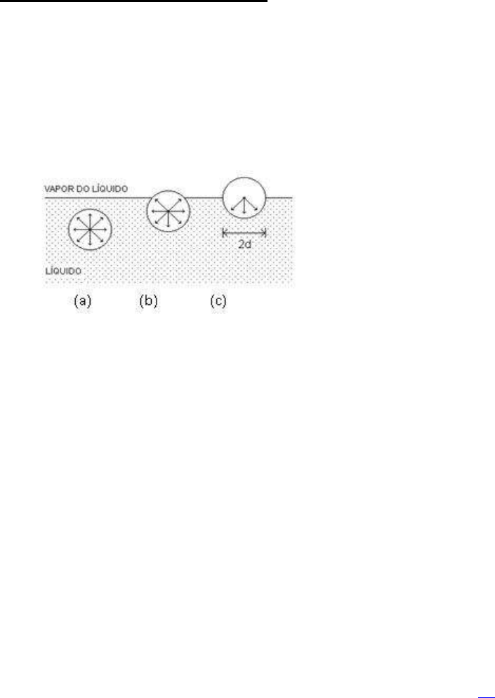 Tópico 6: Tensão Superficial dos Fluidos As forças intermoleculares nos líquidos são diretamente responsáveis por fenômenos de capilaridade tais como a subida de líquido em tubos capilares, a completa umidificação de uma toalha quando uma ponta fica mergulhada na água, etc, e também por fenômenos de superfície tais como uma agulha que flutua sobre a superfície da água, muito embora sua densidade seja muito maior do que a da água, a caminhada dos insetos sobre superfícies líquidas, etc. Figura 1 Consideremos um líquido em equilíbrio com seu vapor. Uma molécula no interior do líquido (Fig.1(a)) é solicitada igualmente em todas as direções, pelas forças de atração das moléculas vizinhas, de modo que estas forças estão perfeitamente balanceadas (equilíbrio de forças). Para uma molécula que se encontra a uma distância da superfície do líquido menor do que d (Fig.1(b)), as forças sobre ela se tornam desbalanceadas, já que um hemisfério, abaixo dela, está preenchido totalmente com moléculas que a atraem, e o hemisfério acima dela, por se estender além da superfície do líquido, está preenchido apenas parcialmente com moléculas que a atraem. Para uma molécula exatamente na fronteira do líquido, o desbalanceamento das forças é máximo (Fig.1(c)). Assim, existe uma forte tendência de as moléculas que se encontram dentro de uma camada superficial ser puxada para o interior do líquido e por isso a superfície do líquido tende a se contrair espontaneamente nesta direção[1]. Se um líquido tem uma interface com o seu próprio vapor, as moléculas da camada superficial estão submetidas a uma força dirigida para o interior do líquido. Se uma molécula da camada superficial se move para o interior do líquido, esta força realiza um trabalho positivo sobre ela. E se uma molécula se move do interior do líquido para a camada superficial, esta força realiza um trabalho negativo sobre ela. Sendo dA uma variação infinitesimal da área da superfície de um líquido (a temperatura constante), o trabalho da força dirigida para o interior pode ser escrito: file:///E:/UNIP/FÃsica%20Aplicada/MecFlu/Tópico%205%20Tensão%20Superficial%20(FÃsica%20Aplicada).doc%23_ftn1 definindo o coeficiente de tensão superficial ou, simplesmente, a tensão superficial, , do líquido, para caracterizar as propriedades da camada superficial. A tabela a seguir mostra alguns valores da tensão superficial. Tensão Superficial para Líquidos em Contato com o Ar Substância Temperatura (oC) (dyn/cm) Glicerina 20 63,1 Mercúrio 20 465,0 Azeite 20 32,0 Água 0 75,6 Água 20 72,8 Água 60 66,2 As moléculas da camada superficial do líquido têm energia potencial maior do que as moléculas do interior, energia esta que resulta do trabalho realizado pelas forças de atração exercidas pelas moléculas do interior do líquido sobre as que se deslocam para a superfície. E como qualquer sistema em equilíbrio está no estado, dentre os possíveis, para o qual a sua energia é mínima, um líquido em equilíbrio deve ter a menor área superficial possível, ou seja, devem existir forças agindo no sentido de reduzir esta área. Um líquido se comporta, portanto, como se existissem forças tangentes à superfície, chamadas forças de tensão superficial, e o coeficiente pode ser pensado como a força de tensão superficial por unidade de comprimento. A tensão superficial decresce com o aumento da temperatura. Com maior energia cinética, as moléculas passam menos tempo próximas umas das outras e as forças intermoleculares perdem eficiência. Resumo: Quando há uma molécula no interior de um líquido, ela está mercê de forças que a atraem por todas as direções, e o vetor dessas forças é nulo. Entretanto se uma molécula está na superfície de um líquido, então ela é solicitada para o interior do líquido por uma força de coesão que é perpendicular à superfície do mesmo necessitando de certo trabalho para deslocar as moléculas dessa força oposta. O termo tensão superficial é utilizado para identificar a tensão aparente na camada superficial de um líquido, essa camada comporta-se como uma membrana distendida e pode ocasionar uma diferença de pressão através de uma superfície líquida curva, como descreve Brighton e Hughes (1979). As unidades da tensão superficial são as de força por comprimento N/m ou lb/ft. A força da tensão superficial resulta do comprimento multiplicado pela tensão superficial, sendo o comprimento do fluido em contato com o sólido. Tensoativos A água não molha muito bem as superfícies onde é aplicada e, por isso, não lava eficientemente. Isto pode ser observado quando enchemos um copo e o esvaziamos: o recipiente fica umedecido internamente de forma irregular, apresentando áreas secas e áreas úmidas. Para aumentar a eficiência da água na remoção de manchas e sujeiras de roupas, por exemplo, adicionam-se compostos chamados tensoativos que diminuem a tensão superficial, favorecendo o seu espalhamento e promovendo um contato mais íntimo com a superfície a ser limpa. Estes compostos são os principais componentes dos detergentes. Os tensoativos reduzem a tensão superficial porque suas moléculas têm uma cabeça hidrofílica (com afinidade com a água) e uma cauda hidrofóbica (com pouca ou nenhuma afinidade com a água). A primeira adere às moléculas de água, quebrando suas atrações intermoleculares e permitindo a expansão da área de contato da água com a superfície que deve molhar. Os tensoativos também ajudam a deslocar e a dispersar as partículas de sujeira. A maior parte da sujeira é do tipo graxa. Nesse caso, as caudas hidrofóbicas das moléculas do tensoativo se fixam na sua superfície, com as cabeças hidrofílicas em contato com a água. Assim, a graxa fica isolada do tecido, podendo ser deslocada com o fluxo de água. Por outro lado, depois que as partículas de sujeira são removidas,