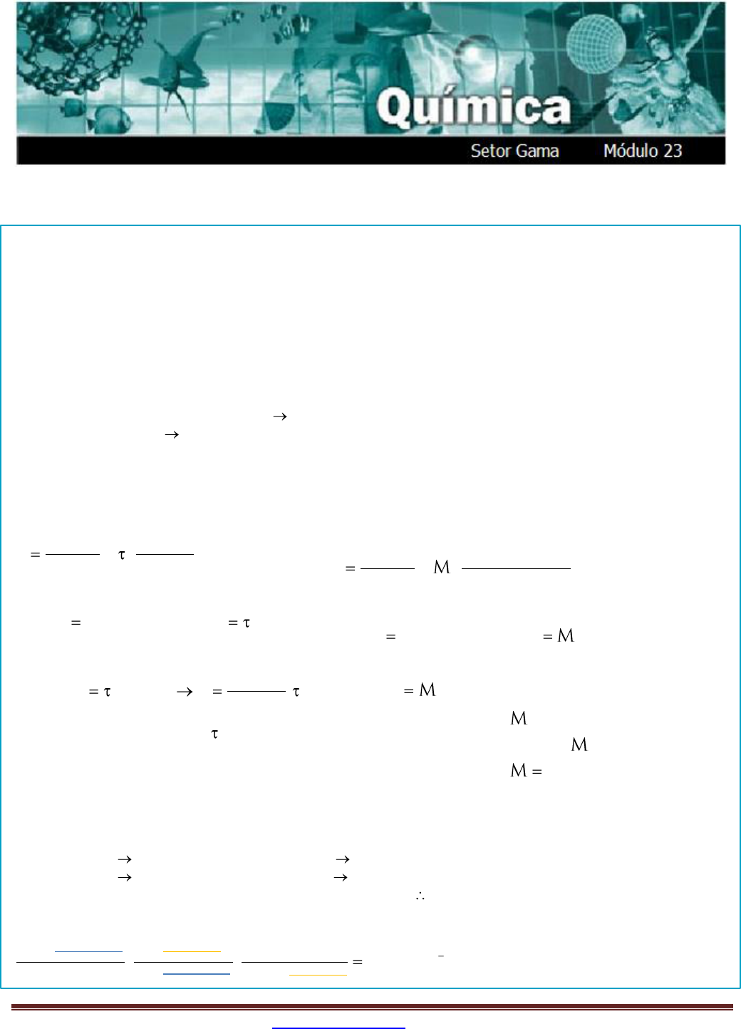 Portal de Estudos em Química (PEQ) – www.profpc.com.br Página 1 Relações entre as concentrações das Soluções EXERCÍCIO RESOLVIDO O ácido clorídrico comercial, também conhecido como ácido muriático, apresenta no rótulo de sua embalagem as seguintes informações: 20% m/m; densidade = 1,1g/mL; Massa Molar = 36,5g/mol. Com base nas informações do rótulo, calcule a concentração molar (mols/L) desse ácido. Interpretação dos dados: Soluto = HCℓ Solvente = H2O Solução = ácido clorídrico comercial - HCℓ(aq) 20% em massa = 100g de solução possui 20g de soluto, ou ainda, τ = 0,2 Densidade da solução = 1,1g/mL ou 1100g/L 1L de solução possui massa de 1100g Massa Molar = 36,5g/mol 1mol de soluto possui massa de 36,5g Existem três formas de resolução deste problema. 1ª Opção: podemos utilizar as relações entre as concentrações Lembrando que: SOLUTO SOLUTO SOLUÇÃO SOLUÇÃO SOLUTO SOLUTO SOLUTOSOLUÇÃO SOLUÇÃO SOLUÇÃO SOLUÇÃO SOLUÇÃO SOLUÇÃO m m C e = V m isolando a m nas equações: m C.V e m .m igualando as equações, ficamos com: m C.V .m C . V Por tanto teremos: C = d. Substituindo dos dados: C = 1100g/L.0,2 Com isso ficamos com: C=220g/L SOLUTO SOLUTO SOLUTOSOLUÇÃO SOLUÇÃO SOLUTO SOLUTO SOLUTO SOLUTOSOLUÇÃO SOLUÇÃO SOLUTOSOLUÇÃO SOLUÇÃO m m C e = V M .V isolando a m nas equações: m C.V e m .M .V igualando as equações, ficamos com: C.V .M .V Por tanto tere SOLUTO mos: C = .M Substituindo os dados: 220g/L= .36,5g /mol Com isso ficamos com: 6,03mol /L 2ª Opção: podemos utilizar regra de três Cálculo da massa do soluto: Cálculo do número de mols do soluto: 1100g de solução 100% 1mol soluto 36,5g soluto X(g soluto) 20% Y(mol soluto) 220g soluto X = 220g de soluto Y = 6,03mol soluto 6,03mol/L 3ª Opção: podemos utilizar a resolução por análise dimensional (melhor opção) 11100g solução 20g soluto 1mol soluto. . 6,03mol.L 1L solução 100g solução 36,5g solução Portal de Estudos em Química (PEQ) – www.profpc.com.br Página 2 EXERCÍCIOS DE APLICAÇÃO 01 Considere que uma “solução de bateria” típica apresente d = 1,3g/mL e 38% em massa de H2SO4. Determine a concentração do ácido: (H2SO4 = 98g/mol) a) em gramas por litro; b) em mols por litro. 02 Um soro caseiro para hidratação infantil foi produzido pela dissolução de 5,85g de NaCℓ e 102,6g de sacarose, em água suficiente para um litro de soro. Determine a concentração molar de cada soluto no soro. (NaCℓ = 58,5g/mol; sacarose = 342 g/mol) 03 Um vinagre contém ácido acético na concentração 0,8mol/L. Qual a massa desse ácido em cada litro de vinagre? (ácido acético = 60 g/mol) 04 (FEI-SP) Uma dada solução aquosa de ácido sulfúrico contém 25% em massa de H2SO4. Sendo a densidade da solução de 1,15 g/cm3, sua concentração, em g/L, será igual a: a) 300 b) 28,75 d) 25 c) 250 e) 287,5 05 (FGV-SP) A água de abastecimento urbano, depois de passar pela Estação de Tratamento de Água “ETA” deve conter quantidade de “cloro residual” na forma de HCℓO. A análise de uma amostra de água tratada, à saída de uma ETA, revelou concentração de HCℓO igual a 2,0 · 10-5 mol/L. Em mg/L, tal concentração é igual a: (Massa molar do HCℓO = 52,5 g/mol) a) 1,05 b) 1,05 · 103 c) 0,105 d) 2,10 e) 2,10 · 103 06 (EFEI-MG) O rótulo de um frasco contendo ácido sulfúrico, H2SO4, está parcialmente rasgado. A parte legível indica que o mesmo possui as seguintes características: d = 1,84 g/mL e 96% de pureza. Sabendo-se ainda que a massa molar do H2SO4 é de 98 g/mol, qual a concentração em mol/L deste ácido? 07 (UFSCar-SP) O flúor tem um papel importante na prevenção e controle da cárie dentária. Estudos demonstram que, após a fluoretação da água, os índices de cáries nas populações têm diminuído. O flúor também é adicionado a produtos e materiais odontológicos. Suponha que o teor de flúor em determinada água de consumo seJa 0,9 ppm (partes por milhão) em massa. Considerando a densidade da água 1 g/mL, a quantidade, em miligramas, de flúor que um adulto ingere ao tomar 2 litros dessa água, durante um dia, é igual a: a) 0,09 b) 0,18 c) 0,90 d) 1,80 e) 18,0 08 (UFCE-CE) Qual a concentração molar de uma solução aquosa de etanol, C2H6O, de concentração igual a 4,6 g/L? a) 4,6 b) 1,0 c) 0,50 d) 0,20 e) 0,10 09 Segundo a CETESB, o ar contendo 9,0ppm em volume de CO é considerado regular. Qual a porcentagem em volume do CO no ar? 10 A análise de um suco de fruta mostrou que 0,003 g de dióxido de enxofre (conservante) está contido em 50 g do suco alimentício. O suco analisado está adequado para o consumo? Dado: tolerância máxima (legislação sanitária) = 200 ppm de SO2. Portal de Estudos em Química (PEQ) – www.profpc.com.br Página 3 EXERCÍCIOS PROPOSTOS 11 (Unicamp-SP) Num refrigerante do tipo “cola”, a análise química determinou uma concentração de íons fosfato igual a 0,15g/L. Qual a concentração de fosfato em mols por litro nesse refrigerante? (Dados as massas atômicas relativas: P = 31; O = 16) 12 (PUC-MG) Uma lata de água mineral (Rhodius), de origem alemã, apresenta uma concentração em termos de íons magnésio igual a 182 mg/L. A concentração dos íons de magnésio nessa lata, em mol/L, é: (Mg=24) a) 3,8 · 10-3 b) 1,5 · 10-5 c) 3,0 · 10-2 d) 7,5 · 10-2 e) 7,5 · 10-3 13 (Fuvest-SP) Solução de ácido clorídrico, de densidade 1,20 kg/L, contém 40,0%, em massa, de HCℓ. a) Qual é a massa de água, em gramas, existente em 1,00 L de solução do ácido, nessa concentração? b) Sabendo que o mol de HCℓ corresponde a 36,5 g, calcule, com apenas dois algarismos significativos, a concentração molar da solução. 14 Uma solução aquosa de Fe2(SO4)3 tem concentração igual a 320 g/litro e densidade igual a 1,20 g/mL. Calcule o título e a concentração molar da solução. Massas molares: Fe2(SO4)3 = 400 g/mol; H2O = 18 g/mol 15 A seguir é rep
