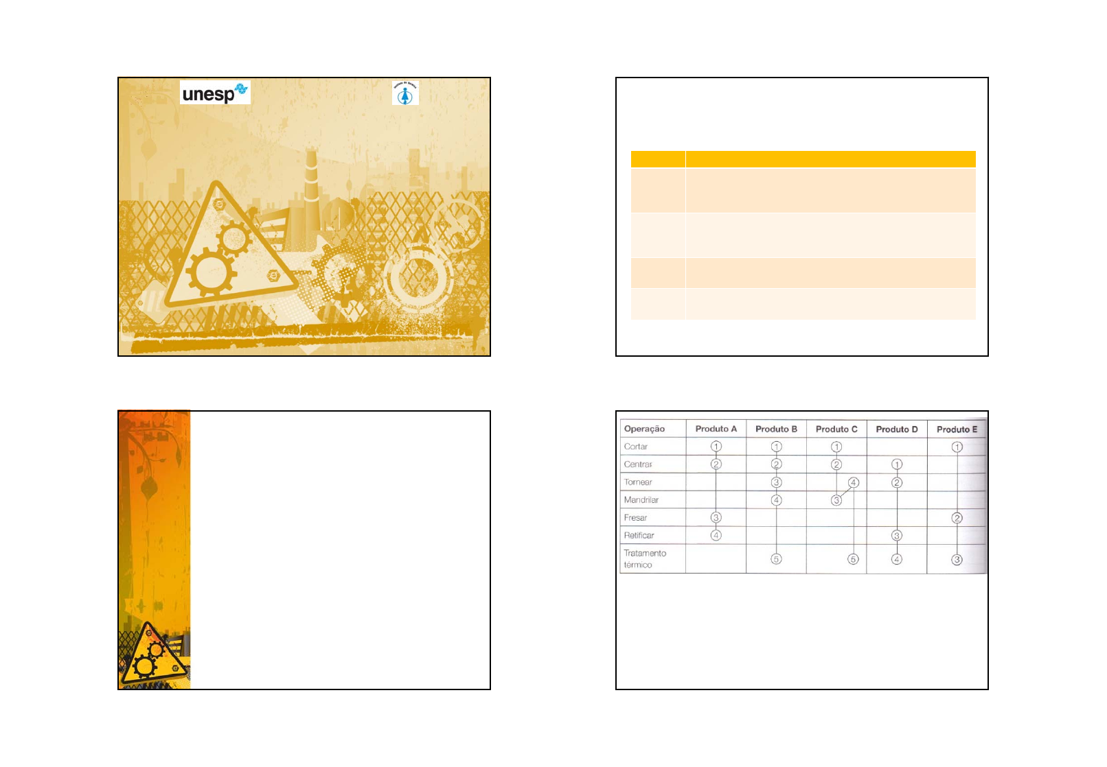 A primeira coluna lista as diferentes operações do processo, e as demais os