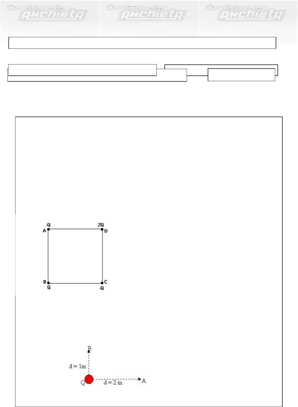 DOCENTE TATIANA LANÇA DISCIPLINA CURSO FÍSICA III ALUNO RA ATIVIDADE SEMANAL (Lista 1)Objetivo: Exercícios de fixação. Prazo de entrega: Não há! Observações: Não vale nota! Descrição da Atividade: Lei de Coulomb Dados: Carga do elétron = - 1,6.10-19 C, k = 9.109 (N.m2)/C2 1) Observe a figura ao lado. O valor de módulo de Q é 2.10-6 C. O lado do quadrado é a = 30 cm. Qual o valor da força elétrica entre as cargas dos pontos A e D? (0,8N) 2) Duas pequenas esferas metálicas, isoladas, idênticas e situadas no vácuo, estão inicialmente carregadas com +10µC e -4µC. As esferas são encostadas e, então, novamente separadas, com seus centros mantidos a 10 cm de distância um do outro. Que tipo de força eletrostática será exercida sobre essas esferas após o contato e qual o seu módulo? (8,1 N) 3) O valor da carga Q é 2µ C. O valor da carga em A é 4µ C. Qual a força entre Q e a carga em A? (1,8.10-2 N) Dado: 1µ = 1.10-6 4) Duas esferas condutoras iguais A e B possuem cargas elétricas de +4C e - 8C. Elas atraem-se com uma força eletrostática F quando separadas por uma distância d uma da outra. Se forem colocadas em contato uma com a outra e reposicionadas a uma distância 2d uma da outra, a nova força de interação eletrostática, é a) atrativa de valor 4 F b) atrativa de valor F/4 c) atrativa de valor 8 F d) repulsiva de valor F/8 e) repulsiva de valor F/32 (**) 5) Duas pequenas esferas condutoras idênticas, P e Q, estão eletrizadas com cargas de 2 C e - 8 C, respectivamente. Elas são colocadas em contato e, em seguida, separadas a uma distância de 3 m no vácuo. Qual força de interação entre elas (atração ou repulsão) e a intensidade dessa força? (9.10-3 N)