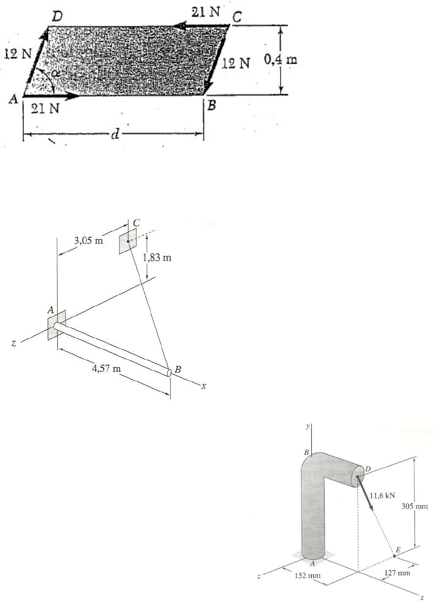 Mecânica Geral – 3ª Lista de exercícios 1. Uma placa em forma de paralelogramo sofre a ação de dois binários. Determine (a) o momento do binário formado pelas duas forças de 21 N. (b) A distância perpendicular entre as duas forças de 12 N se a resultante dos dois binários for nula. (c) O valor de 𝛼 se o binário resultante for de 1,8 N.m no sentido horário e 𝑑 = 1,05𝑚. 2. A haste AB de 4,57 m tem a extremidade A fixa, sendo a força de tração no cabo BC de 1 690 N. Substitua a força do cabo em B por um sistema força-binário equivalente em A. 3. Uma força de 11,6 kN é aplicada ao ponto D do suporte de ferro fundido da figura. Substitua a força por um sistema força-binário equivalente no centro A da seção da base. 4. Uma viga de 3 m é carregada de várias maneiras, como se vê na figura. Encontre dois carregamentos que sejam equivalentes. 5. Uma força e um binário são aplicados a uma viga. (a) Substitua esse sistema por uma força única F aplicada no ponto G e determine a distância “d”. (b) Resolva a parte a supondo que as forças de 600 N sejam invertidas. 6. Uma força horizontal P de 90 N atua sobre uma alavanca em ângulo. (a) Substitua P por um sistema força-binario equivalente em B. (b) Encontre as duas forças verticais (iguais) em C e em D que sejam equivalentes ao binário encontrado na parte a. 8. As três forças da figura e um binário de módulo M = 6 N · m são aplicados a um suporte. (a) Determine a resultante desse sistema de forças. (b) Determine os pontos onde a linha de ação da resultante corta as retas AB e BC. 9. O caminhão Munck tem uma massa de 4300kg, e é usado para descarregar uma plataforma de telhas com massa de 1600kg. Determine a reação em cada um das duas (a) rodas traseiras, (b) rodas dianteiras. 10.Duas crianças estão em pé sobre um trampolim com massa de 65 kg. Sabendo que as massas das crianças em C e em D são 28kg e 40kg, respetivamente. Determine (a) a reação em A, e (b) a reação em B. 11. Dois caixotes, cada um pesando 1125 N, são colocados na caçamba de uma caminhonete com peso de 13500 N. Determine as reações em cada uma das duas (a) rodas traseiras em A, e (b) rodas dianteiras em B. 12. Quatro caixas são colocadas em uma prancha de madeira de 14kg que está apoiada em dois cavaletes. Sabendo que a massa das caixas B e D são, respectivamente, 4,5kg e 45 kg, determine o intervalo de valores da massa da caixa A de modo que a prancha permaneça em equilíbrio quando a caixa C for removida. 13. A tração necessária no cabo AB é 800 N. Determine (a) a força vertical P que deve ser aplicada ao pedal e (b) a correspondente reação em C. GABARITO 1. a) 8,4 N.m b) 0,700 m c) 31,6° 2. F = -1334 i + 534 j – 890 k M = 4067 j + 2440 k 3. FA = -10,71 j – 4,46 k MA = -1,36 i +0,68 j -1,63 k 4. C e G 5. a) 800 N d=3,0 b) 800 N d= 0,0 m 6. a) 𝐹 = 90 𝑁 horizontal para esquerda 𝑀 = 1125 𝑁. 𝑚 sentido anti-horário b) 𝐹 = 112,5 𝑁 vertical para baixo 𝐹 = 112,5 𝑁 vertical para cima 8. a) 136 N 28° b) 18,4 mm a direita de A e 50,00 mm acima de C 9. a) 12,13 kN vertical para cima b) 16,81 kN vertical para cima 10. a) 1,182 kN vertical para cima b) 2,49 kN vertical para baixo 11. a) 3754 N vertical para cima b) 4121 N vertical para cima 12. 2,32 𝑘𝑔 ≤ 𝑚 ≤ 266 𝑘𝑔 13. a) 312 N b) 859 N 21,3°