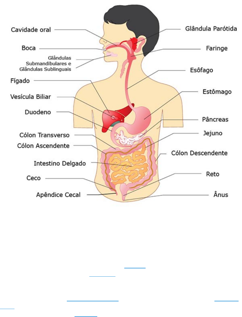Componentes do Sistema Digestório O Sistema Digestório (nova nomenclatura) divide-se em: Tubo digestório (propriamente dito) e os Órgãos anexos. O tubo digestório (antes conhecido por tubo digestivo) divide-se em: alto, médio e baixo: · Tubo digestório alto: boca, faringe e esôfago. · Tubo digestório médio: estômago e intestino delgado (duodeno, jejuno e íleo). · Tubo digestório baixo: intestino grosso (ceco, cólon ascendente, transverso, descendente, a curva sigmoide e o reto). · Órgãos anexos: glândulas salivares, dentes, língua, pâncreas, fígado e vesícula biliar. Veja aqui como funciona a digestão. Tubo Digestório Alto Formado pela boca, faringe e esôfago. Órgãos e anexos do Trato Digestório Alto BOCA A boca é a porta de entrada dos alimentos no tubo digestivo. Corresponde a uma cavidade forrada por mucosa, onde os alimentos são umidificados pela saliva, produzida pelas glândulas salivares. Com isso, durante a mastigação os alimentos passam primeiro pelo processo da digestão mecânica, ação dos dentes e da língua. Posteriormente, passam pela atividade enzimática da ptialina (amilase salivar). Sendo assim, na rápida passagem dos alimentos pela boca, a ptialina começa a atuar sobre o amido (encontrado na batata, farinha de trigo, arroz) transformando-o em moléculas menores de maltose. Leia mais sobre a Saliva. FARINGE A faringe é um tubo muscular membranoso, que se comunica com a boca, através do istmo da garganta e na outra extremidade com o esôfago. Para chegar ao esôfago, o alimento, depois de mastigado, percorre toda a faringe, que é um canal comum, para o sistema digestório e o sistema respiratório. No processo de deglutição, o palato mole é retraído para cima e a língua empurra o alimento para dentro da faringe, que se contrai voluntariamente e leva o alimento para o esôfago. Nesse momento a epiglote fecha o orifício de comunicação com a laringe, impedindo a penetração do alimento nas vias respiratórias. Leia mais sobre a deglutição e o processo da digestão. ESÔFAGO O esôfago é um conduto musculoso, controlado pelo sistema nervoso autônomo. Assim, por meio de ondas de contrações, conhecidas como peristaltismo ou movimentos peristálticos, o conduto musculoso vai espremendo os alimentos e levando-os em direção ao estômago. Tubo Digestório Médio Formado pelo estômago e intestino delgado (duodeno, jejuno e íleo). ESTÔMAGO Anatomia de Estômago Sadio e de Estômago com Úlcera O estômago é uma grande bolsa que se localiza no abdômen, responsável pela digestão das proteínas. A entrada do órgão recebe o nome de cárdia, porque fica muito próxima ao coração, separada dele somente pelo diafragma. Possui uma pequena curvatura superior e uma grande curvatura inferior. A parte mais dilatada recebe o nome de "região fúndica", enquanto a parte final, uma região estreita, recebe o nome de "piloro". O simples movimento de mastigação dos alimentos já ativa a produção do ácido clorídrico no estômago. Contudo, é somente com a presença do alimento, de natureza proteica, que se inicia a produção do suco gástrico. Este suco é uma solução aquosa, composta de água, sais, enzimas e ácido clorídrico. A mucosa gástrica é recoberta por uma camada de muco, que a protege de agressões do suco gástrico, que é bastante corrosivo. Por isso, quando ocorre um desequilíbrio na proteção, o resultado é uma inflamação da mucosa (gastrite) ou o surgimento de feridas (úlcera gástrica). A pepsina é a enzima mais potente do suco gástrico sendo regulada pela ação de um hormônio, a gastrina. A gastrina é produzida no próprio estômago no momento que moléculas de proteínas dos alimentos entram em contato com a parede do órgão. Assim, a pepsina quebra as moléculas grandes de proteína e as transforma em moléculas menores. Estas são as proteoses e peptonas. Por fim, a digestão gástrica dura, em média, de duas a quatro horas. Nesse processo o estômago sofre contrações que forçam o alimento contra o piloro, que se abre e fecha, permitindo que, em pequenas porções, o quimo (massa branca e espumosa), chegue ao intestino delgado. INTESTINO DELGADO Órgãos Anexos que participam do Processo Digestivo no Intestino O intestino delgado é revestido por uma mucosa enrugada que apresenta inúmeras projeções. Está localizado entre o estômago e o intestino grosso e tem a função de segregar as várias enzimas digestivas. Isto dá origem a moléculas pequenas e solúveis: a glicose, aminoácidos, glicerol, etc. O intestino delgado está dividido em três porções: o duodeno, o jejuno e o íleo. Assim, o duodeno é a primeira porção do intestino delgado a receber o quimo que vem do estômago, que ainda está muito ácido, sendo irritante à mucosa duodenal. Logo em seguida, o quimo é banhado pela bile. A bile é secretada pelo fígado e armazenada na vesícula biliar, contendo bicarbonato de sódio e sais biliares, que emulsificam os lipídios, fragmentando suas gotas em milhares de micro gotículas. Além disso, o quimo recebe também o suco pancreático, produzido no pâncreas, contendo enzimas, água e grande quantidade de bicarbonato de sódio, de maneira que favorece a neutralização do quimo. Assim, em pouco tempo, a “papa” alimentar do duodeno, vai-se tornando alcalina e gerando condições necessárias para ocorrer a digestão intra-intestinal. Já o jejuno e o íleo é considerada a parte do intestino delgado onde o trânsito do bolo alimentar é rápido, ficando a maior parte do tempo vazio, durante o processo digestivo. Por fim, ao longo do intestino delgado, depois que todos os nutrientes foram absorvidos, sobra uma pasta grossa, com detritos não assimilados e com bactérias, já fermentado, que segue para o intestino grosso. Leia também sobre o Intestino Delgado. Tubo Digestório Baixo Formado pelo intestino grosso (ceco, cólon ascendente, transverso, descendente, 