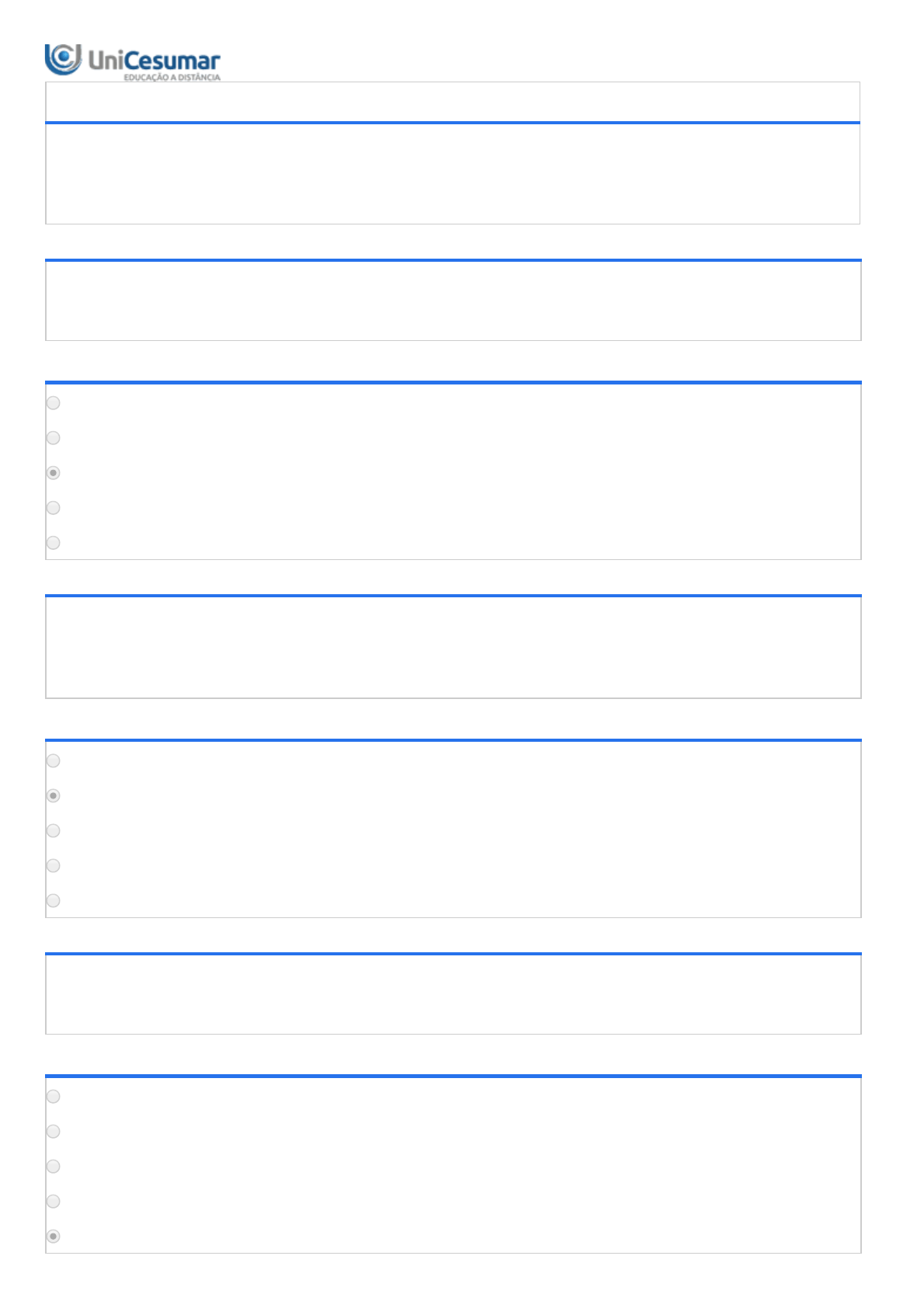 05/04/2020 Unicesumar - Ensino a Distância 1/2 ATIVIDADE 4 - NIVELAMENTO DE MATEMÁTICA - 51/2020 Período:10/01/2020 18:00 a 05/04/2020 23:59 (Horário de Brasília) Status:ABERTO Nota máxima:0,50 Gabarito:Gabarito será liberado no dia 06/04/2020 00:00 (Horário de Brasília) Nota obtida: 1ª QUESTÃO Gustavo está treinando para uma prova de corrida de 10 km. Hoje ele quer medir seu tempo a cada quilômetro para ter uma ideia de quanto tempo levará para percorrer os 10 km. Gustavo correu 6000 metros em 0,75 horas. Quanto tempo Gustavo levará para completar a prova, caso ele mantenha o mesmo ritmo? ALTERNATIVAS 70 minutos. 1 hora e 10 minutos. 1 hora e 15 minutos. 80 minutos. 82 minutos. 2ª QUESTÃO Em uma tentativa de melhorar sua alimentação, Fernanda comprou Queijo Cottage que possui 100 kcal por porção. Uma porção é equivalente a 125 gramas, e o pedaço que Fernanda comprou possui 500 gramas. Se Fernanda assumir que sua meta é somente 600 kcal por refeição, se ela comer todo o Queijo que comprou em uma refeição, qual parte da cota de caloria ela terá consumido? ALTERNATIVAS 1/3. 2/3. 2/5. 1/4. 3/5. 3ª QUESTÃO Benicio precisava fazer uma última prova para terminar seu curso. Ele sabia que se acertasse 80% da prova, seria suficiente para ser aprovado no curso. No total eram 400 pontos e ele acertou 332. Benicio passou no curso? Quantos por cento do total ele acertou? ALTERNATIVAS Reprovou com 79,5%. Reprovou com 79% Passou com 80%. Passou com 81%. Passou com 83%. 05/04/2020 Unicesumar - Ensino a Distância 2/2 4ª QUESTÃO Identifique a alternativa que possui o valor correto para a expressão numérica dada por: 10 : 2 . 5 ALTERNATIVAS 15/25. 10/25. 5/15. 16/25. 10/22. 5ª QUESTÃO Assinale a alternativa que apresenta o valor correto da operação a seguir: (6 : 3 . 5 ) . ALTERNATIVAS 1000000. 150000. 1,5.10 . 10000. 10 . 6ª QUESTÃO Quais são as raízes quadradas e cúbicas exatas de números naturais até 100? ALTERNATIVAS 0,1,4,9,10,20,30,40,50,60,70,80,90,100 e 1,30,60,90. 0,1,4,9,16,25,36,49,64,81,100 e 0,1,8,27,64. 1,4,9,16,25,36,49,64,81,100 e 0,1,8,27,64. 0,1,4,9,16,25,36,49,64, e 0,1,8,27,64,99. 4,9,16,25,36,49,64,81,100 e 0,1,8,27,64. -1 -5 -1 2 2 2 3 4 3
