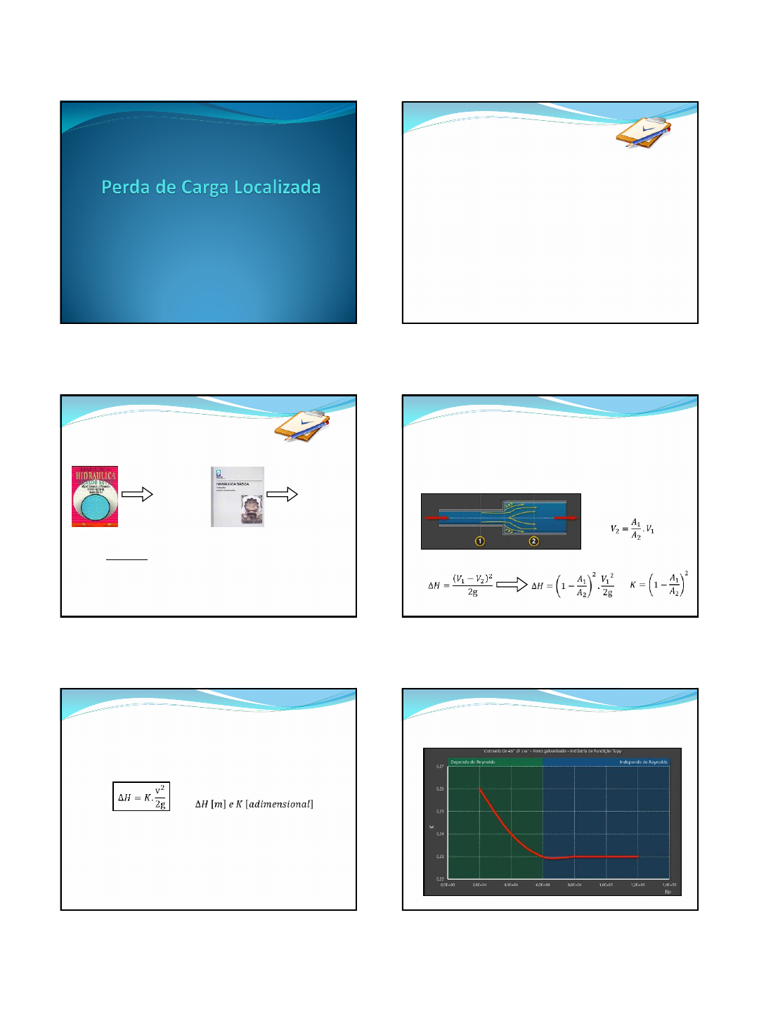 Conteúdo da aula Perda de Carga Localizada Definição Expressão Geral das Perdas Localizadas Valores de K para algumas singularidades Alargamento e Estreitamento de Seção (Brusco e Gradual) Entrada e Saída de Tubulações Cotovelos e Curvas Válvulas e Registros Cálculo das Perdas Localizadas Método dos Coeficientes de Resistência Método dos Comprimentos Equivalentes Conteúdo da aula Atenção! Este material apresenta o conteúdo programático de forma resumida e não deve substituir a consulta da bibliografia complementar indicada. Capítulo 7 Capítulo 3 É a perda de carga que ocorre em um ponto específico ou partes bem determinadas da tubulação, ao contrário do que acontece com as perdas ao longo do escoamento. Definição Expressão Geral das Perdas Localizadas Considerando: Teorema de Borda-Bélanger Desta forma: Perda de Carga Localizada Foi demonstrado experimentalmente que a perda de carga localizada pode ser expressa, para uma determinada peça, por uma expressão geral: O coeficiente adimensional K dependerá da geometria da conexão, do número de Reynolds e da rugosidade da parede. Para os casos com Re > 10 5, admite-se um valor constante que pode ser obtido por meio de tabelas e gráficos. Onde: Expressão Geral das Perdas Localizadas Perda de Carga Localizada Gráfico com relação K x número de Reynolds Expressão Geral das Perdas Localizadas Perda de Carga Localizada O valor do coeficiente K é afetado por diversos fatores, por isso são utilizados valores médios, que acabam diferindo de um fabricante para outro. A perda de carga localizada é obtida experimentalmente, pois sua determinação dependeria de fatores de difícil quantificação. Algumas singularidades mais comuns são: Alargamento e Estreitamentos de Seção (Brusco e Gradual) Entrada e Saída de Tubulações Cotovelos e Curvas Válvulas e Registros Valores de K para Algumas Singularidades Perda de Carga Localizada As mudanças de diâmetro que ocorrem numa tubulação podem ser classificadas em bruscas ou graduais: Alargamento Estreitamento Alargamento e Estreitamento de Seção Perda de Carga Localizada A2/A1 0 0,1 0,2 0,3 0,4 0,5 0,6 0,7 0,8 0,9 1,0 K 0,5 0,46 0,41 0,36 0,30 0,24 0,18 0,12 0,06 0,02 0,00 Nos casos de contrações bruscas, os valores do coeficiente K serão função da relação de áreas das seções de entrada e saída. Alargamento e Estreitamento Brusco Perda de Carga Localizada Nestes casos o coeficiente K dependerá da geometria da peça, sendo função do ângulo de abertura da contração e da relação de áreas das seções de entrada e saída. Alargamento Estreitamento Alargamento e Estreitamento Gradual Perda de Carga Localizada Entrada de Tubulações (Saída de Reservatórios) Perda de Carga Localizada r/D 0,05 0,1 0,2 0,3 0,4 K 0,25 0,17 0,08 0,05 0,04 Para os casos com entradas arredondadas. Entrada de Tubulações (Saída de Reservatórios) Perda de Carga Localizada Nessa situação, a velocidade é nula no trecho de maior seção (reservatório), pois A2 ∞. Assim, o valor de K é igual a unidade, indicando a perda total da carga cinética. Saída de Tubulações (Entrada de Reservatórios) Perda de Carga Localizada Peça K Cotovelo de 90°, raio curto 0,9 Cotovelo de 90°, raio longo 0,6 Cotovelo de 45° 0,4 Curva de 90°, r/D = 1 0,4 Curva de 45° 0,2 Tê, passagem direta 0,9 Tê, saída lateral 2,0 Valores aproximados de K para algumas peças comuns na prática. Cotovelos e Curvas Perda de Carga Localizada Válvula de Globo ou de Disco Peça K Válvula de gaveta aberta 0,20 Válvula de globo aberta 10,00 Válvula de retenção 2,50 Válvula borboleta aberta 0,30 Válvula de ângulo aberta 5,00 Válvula de pé 1,75 Válvula de pé com crivo 10,00 Valores aproximados de K para as válvulas mais comuns na prática. Válvula de Pé com Crivo Válvulas e Registros Perda de Carga Localizada Válvula ou Registro de Gaveta O valor do coeficiente K dependerá do grau de fechamento da válvula e da relação da área efetiva da abertura e área total. a/D 0 ¼ 3/8 ½ 5/8 ¾ 7/8 K 0,15 0,26 0,81 2,06 5,52 17,0 97,8 Válvulas e Registros Perda de Carga Localizada Válvulas e Registros α (°) 0 5 10 15 20 25 30 35 40 45 50 K 0,15 0,24 0,52 0,90 1,54 2,51 3,91 6,22 10,8 18,7 32,6 O valor do coeficiente K dependerá do ângulo de abertura da peça e da relação de áreas efetivas da abertura de passagem e da tubulação de seção circular. Válvula Borboleta Perda de Carga Localizada Válvulas e Registros Válvula de Retenção O cálculo das perdas de carga localizadas, bem como o total das perdas (distribuídas e localizadas) existentes em uma tubulação poderá ser feita através de dois métodos: Método dos Coeficientes de Resistência Método dos Comprimentos Equivalentes Cálculo das Perdas de Carga Localizadas Perda de Carga Localizada Cada trecho retilíneo provocará uma perda de carga distribuída. Cada singularidade provocará uma perda de carga localizada. Método dos Coeficientes de Resistência Perda de Carga Localizada Neste método são adicionados a extensão total da tubulação, comprimentos que correspondam à mesma perda de carga que causariam as singularidades existentes nessa tubulação. Para os casos de uma tubulação com mesmo material e diâmetro: Onde: Método dos Comprimentos Equivalentes Perda de Carga Localizada Perda de Carga Localizada Comprimentos equivalentes em números de diâmetros de canalização, para peças metálicas, ferro galvanizado e ferro fundido. Perda de Carga Localizada EXEMPLOS 1) Dois reservatórios, mantidos em níveis constantes, são interligados por uma tubulação de PVC rígido de 10 m de comprimento e 50 mm de diâmetro, conforme na figura abaixo. Admitindo que a única perda de carga localizada seja devido à presença de um registro de gaveta parcialmente fechado, cujo comprimento equivalente é de 20 m. Determine a vazão transportada em regime permanente, considerando C = 145. EXEMPLOS 2) Determin
